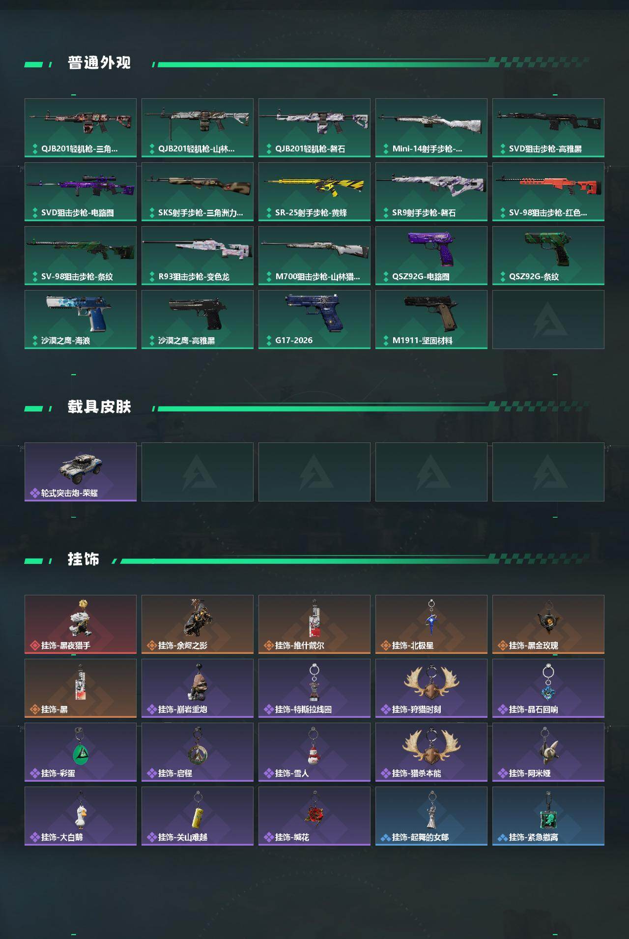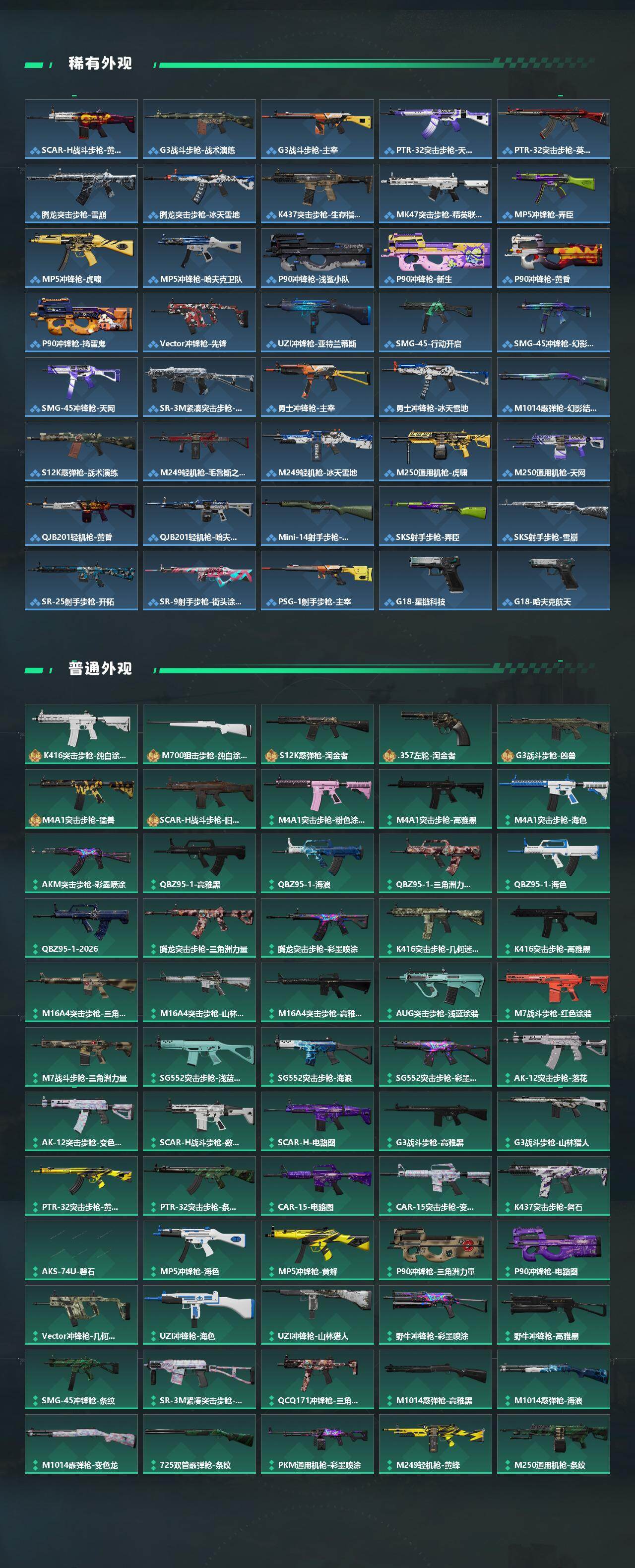 【传说外观】:M4A1突击步枪-蚀金玫瑰,M4A1突击步枪-阿米娅,AKM突击步枪-锦绣,ASh-12战斗步枪-鹅鸭杀,M16A4突击步枪-狩猎时刻,SG552突击步枪-运动员,AK-12突击步枪-特斯拉线圈,SCAR-H战斗步枪-启航,G3战斗步枪-狩猎