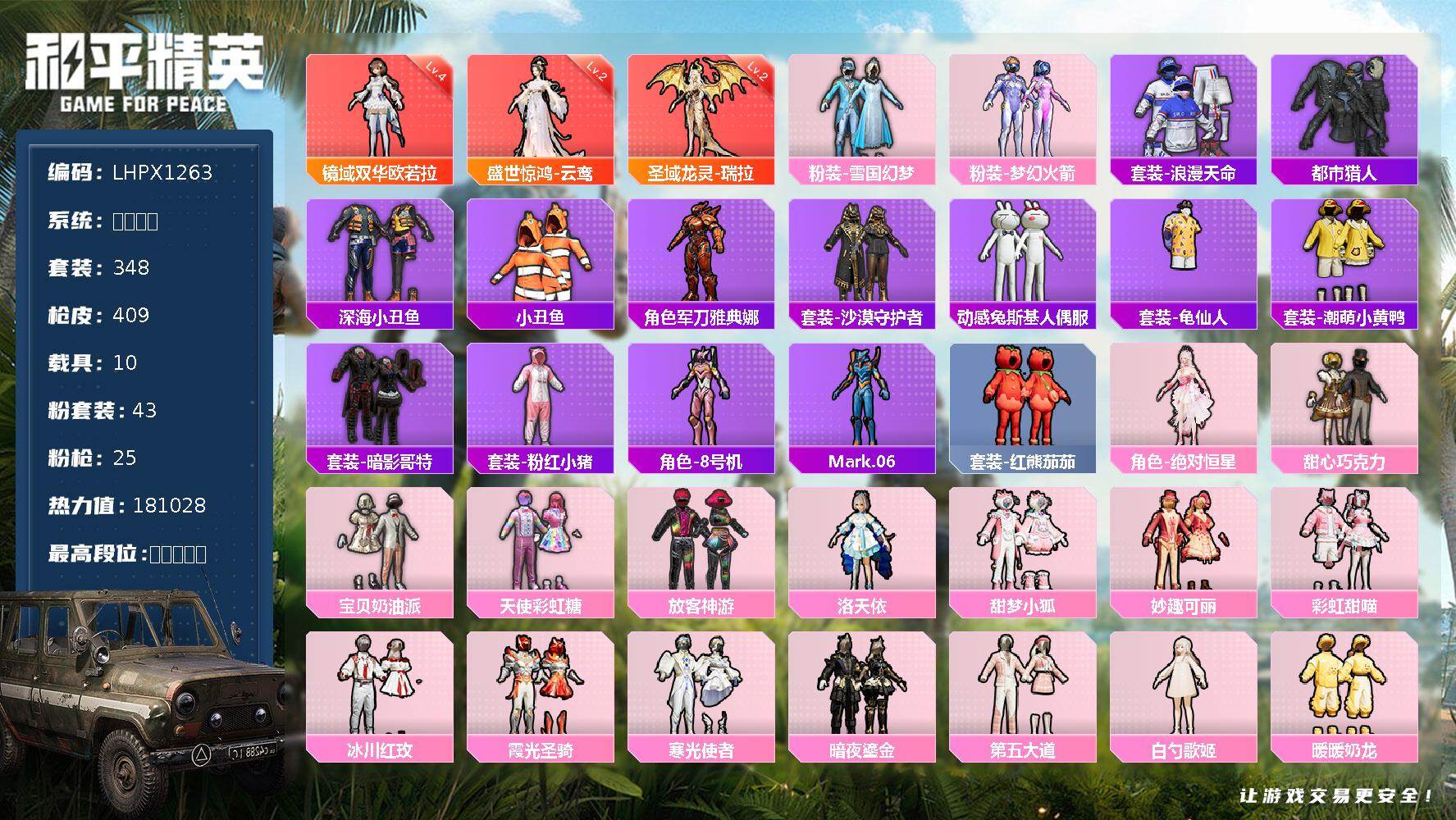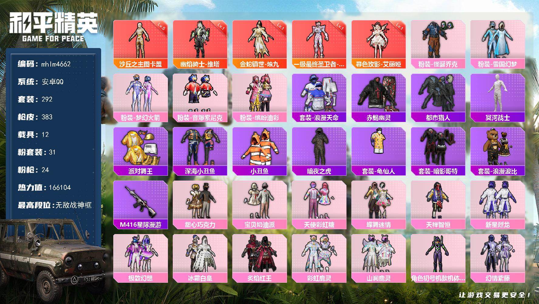 【特价出售/店主推荐】安卓 微信-无敌战神框-3神装-43粉装-25特效枪-10载具-20粉色飞行器-181028热力值-25王牌印记-348套装-409枪皮