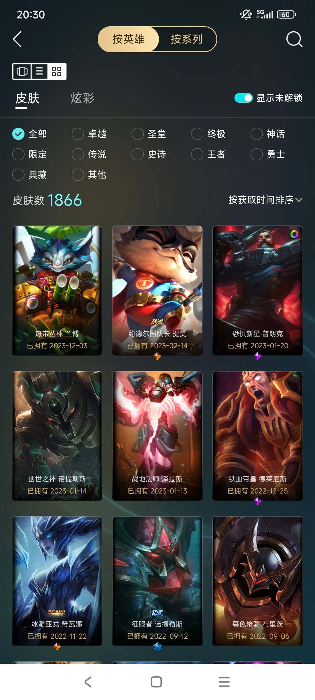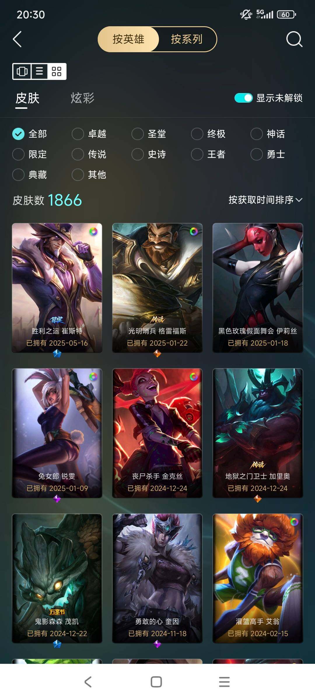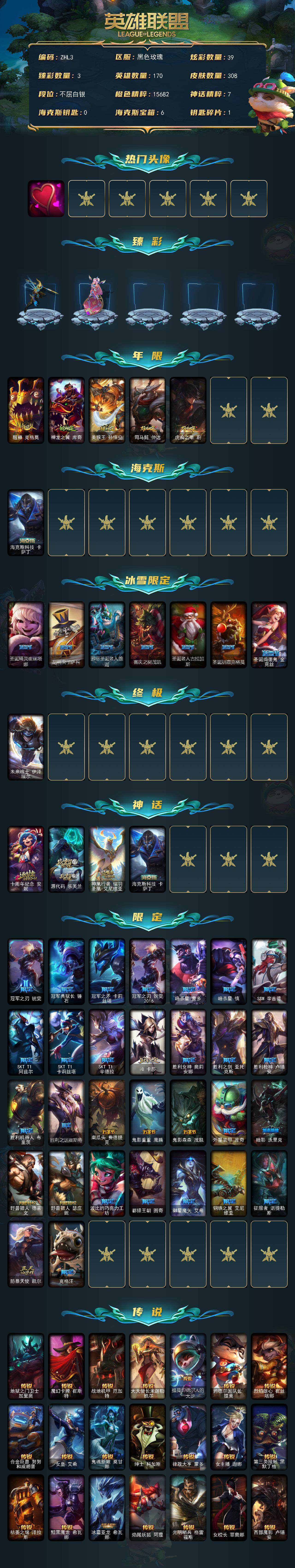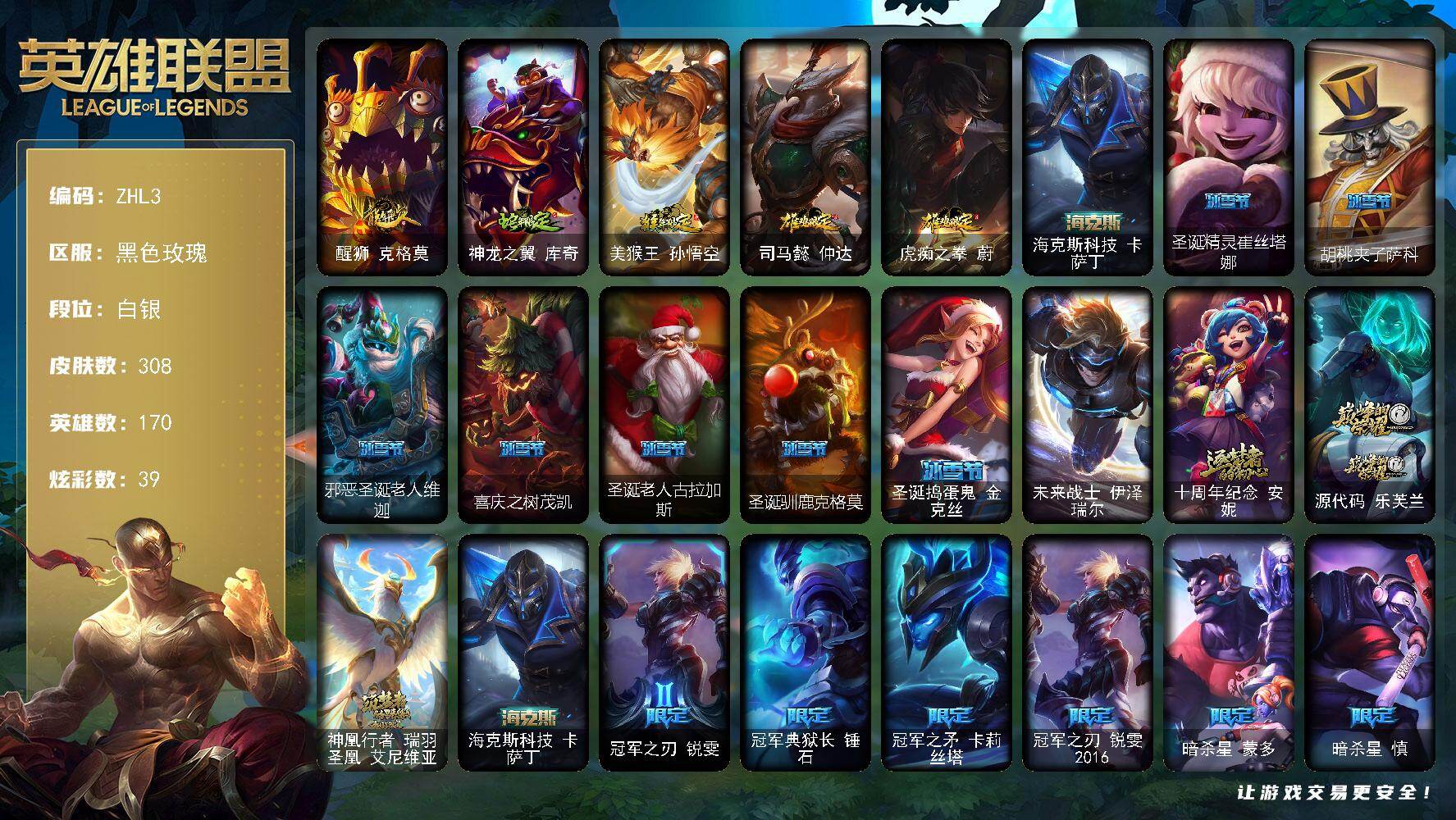 可直接换绑!白银段位-170英雄-308皮肤-39炫彩-1终极-4神话-42限定-23传说-81史诗【热门头像】:爱意绵绵头像【臻彩皮肤】:冠军之刃锐雯2016凯旋圣装,冠军之矛卡莉丝塔凯旋圣装,星之守护者萨勒芬妮未来之光【年限皮肤】:醒狮克格莫,神龙之翼库奇,美猴王孙悟空,司马懿仲达,虎痴之拳蔚【海克斯皮肤】:海克斯科技卡萨丁【冰雪限定】:圣诞精灵崔丝塔娜,胡桃夹子萨科,邪恶圣诞老人维迦,喜庆之树茂凯,圣诞老人古拉加斯,圣诞驯鹿克格莫,圣诞捣蛋鬼金克丝【终极皮肤】:未来战士伊泽瑞尔【神话皮肤】