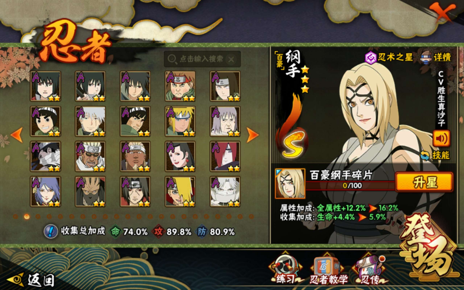 【S级忍者】旗木卡卡西「须佐能乎」(3星),宇智波佐助「永恒万花筒」(3星),春野樱「忍界大战」(3星),漩涡鸣人「九喇嘛连结」(3星),波风水门「九喇嘛连结」(3星),宇智波斑「白面具」(3星),自来也「舞之豪杰」(3星),宇智波鼬「须佐能乎」(3星),漩涡鸣人·宇智波佐助(3星),佩恩「天道」(3星),波风水门(3星),大蛇