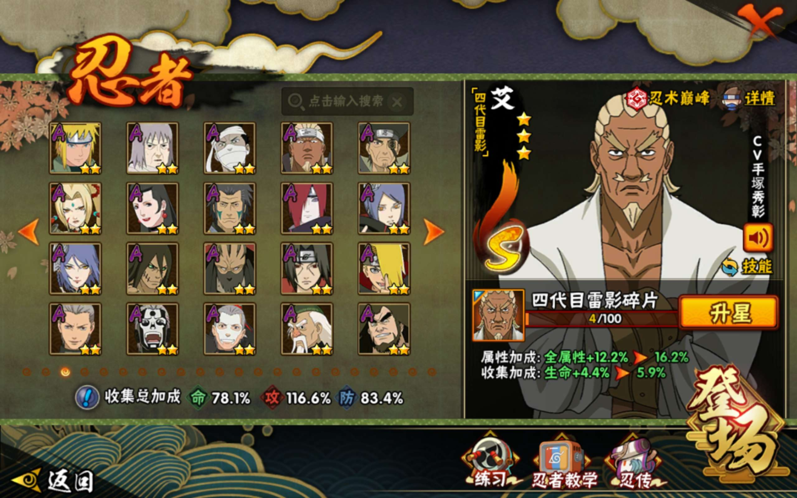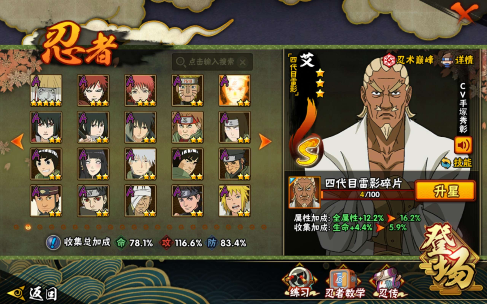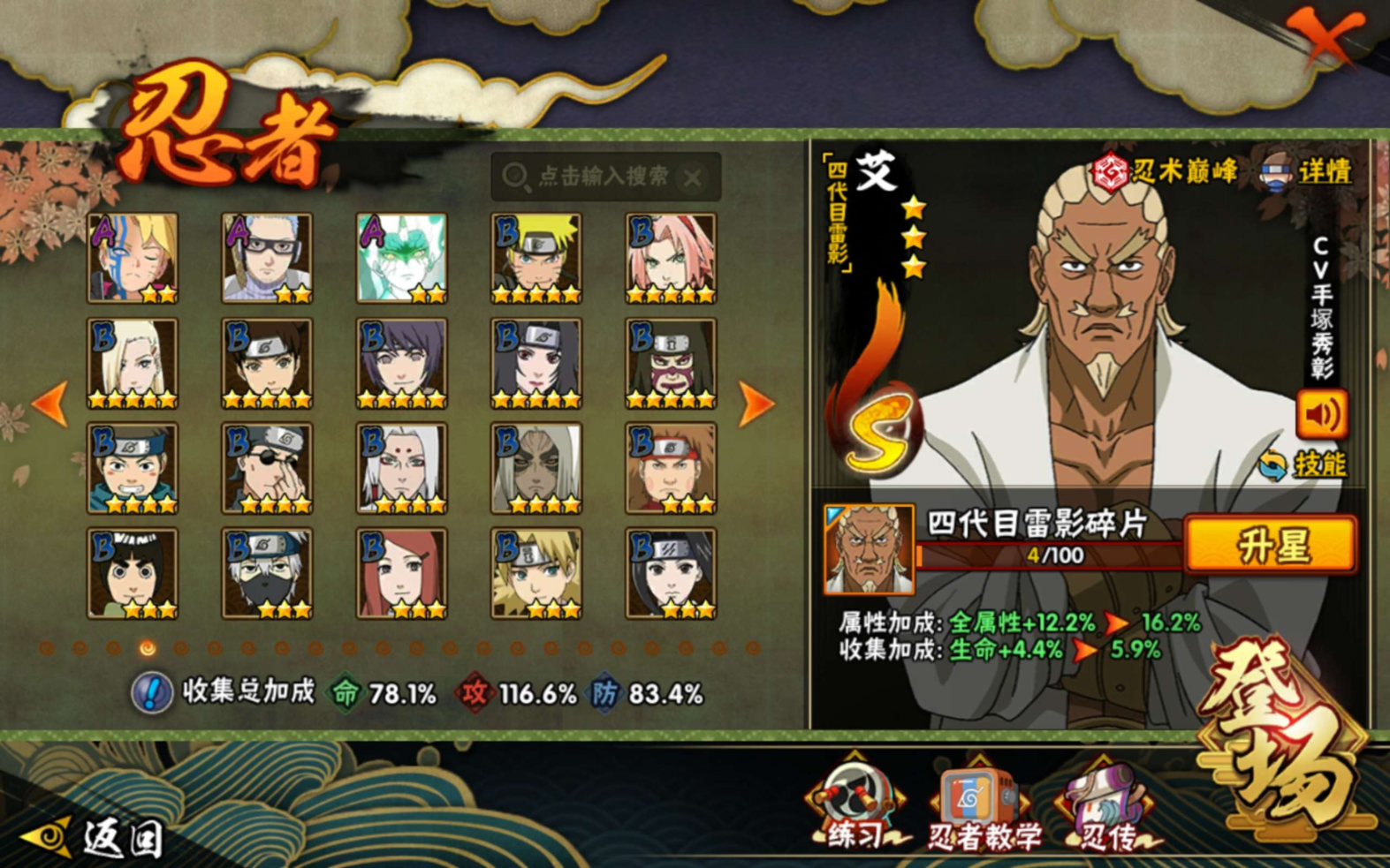 【S级忍者】旗木卡卡西「须佐能乎」(3星),自来也「传说中的三忍」(3星),大筒木舍人「最终章」(3星),漩涡鸣人「暴怒·第六尾」(3星),宇智波斑「秽土转生·解」(3星),宇智波佐助「永恒万花筒」(3星),大筒木桃式(3星),艾「忍界大战」(3星),宇智波止水「须佐能乎」(3星),自来也「舞之豪杰」(3星),宇智波鼬「