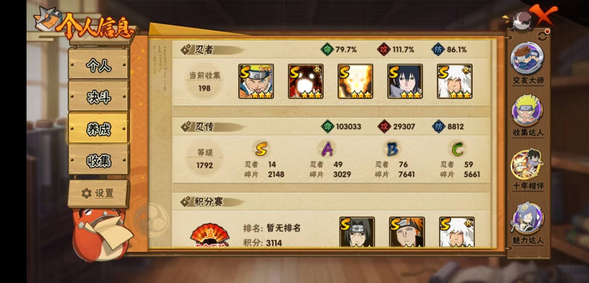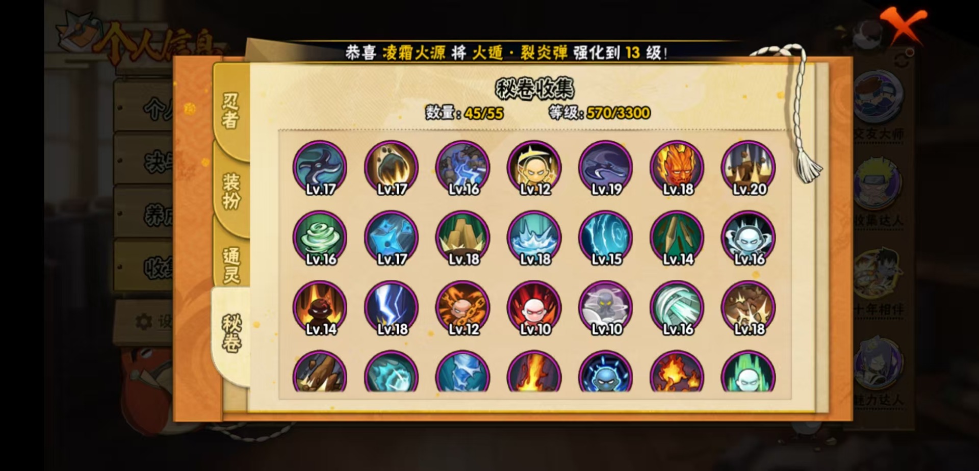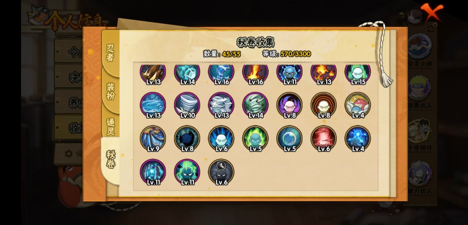 【S级忍者】宇智波止水「须佐能乎」,宇智波佐助「永恒万花筒」,漩涡鸣人 「九喇嘛连结」,大野木 「忍界大战」,迈特凯「死门」,自来也 「舞之豪杰」,自来也 「传说中的三忍」,漩涡鸣人 「暴怒·第六尾」,宇智波斑「五影会谈」,漩涡鸣人·宇智波佐助,佩恩「天道」,波风水门,大蛇丸