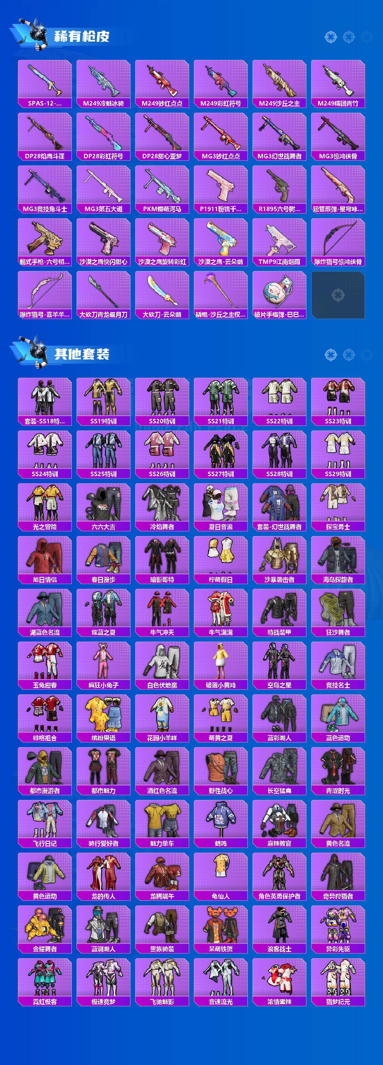 【热门品类】:粉装-梦幻火箭,粉装-缤纷油彩,套装-都市猎人,套装-冥河战士,套装-奇异狩猎者,角色-军刀雅典娜,套装-金羽特工,套装-浪客战士,角色-忠义严颜,套装-六号树人,套装-龟仙人,套装-暗影哥特,角色-Mark.06,角色-六号稻草人,大砍刀-青龙偃月刀,撬棍-龙胆亮银枪,套装-红熊茄茄