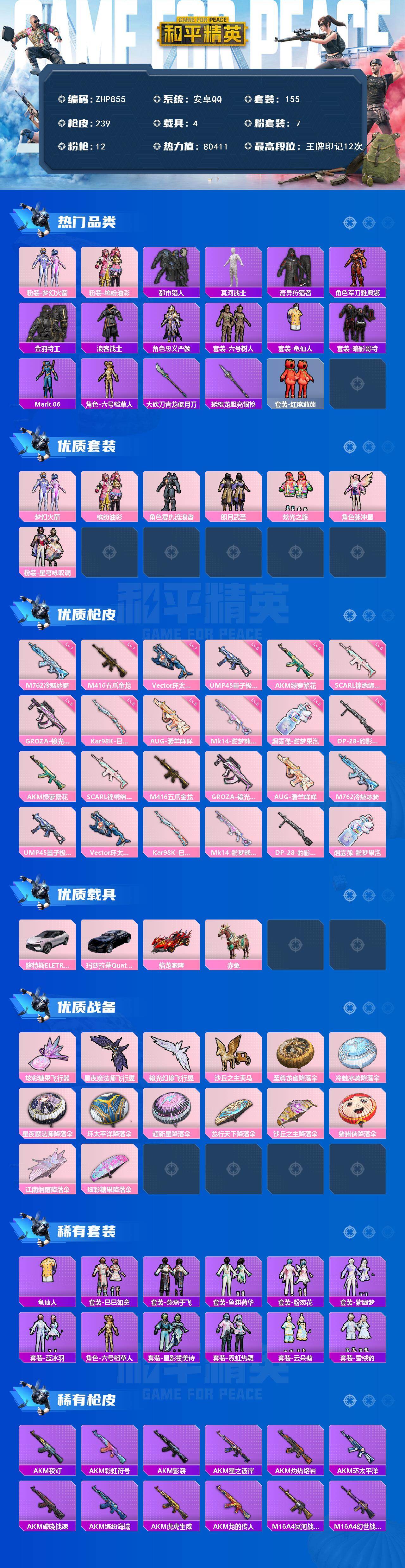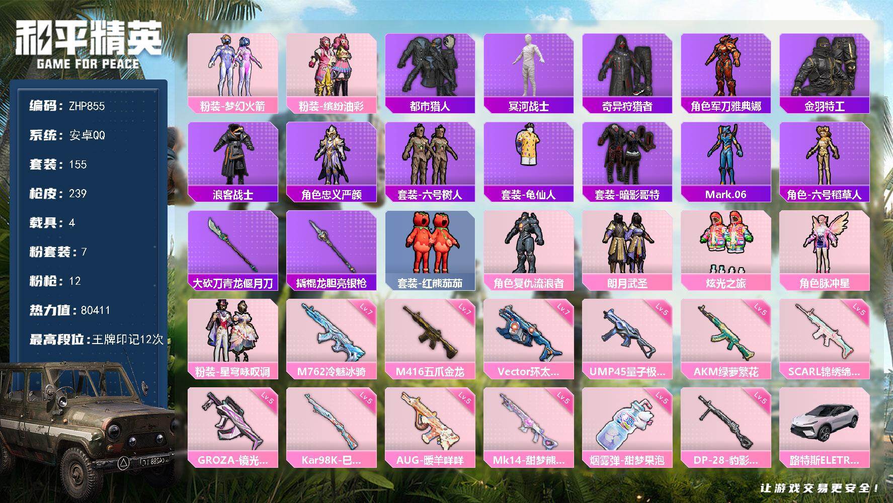安卓 手Q-7粉装-12特效枪-4载具-4粉色飞行器-80411热力值-12王牌印记-155套装-239枪皮