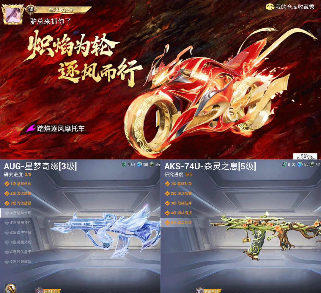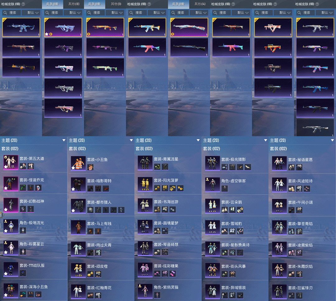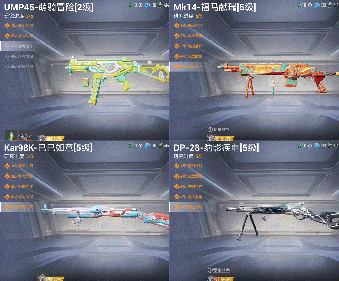 特效枪6:AUG-星梦奇缘3级,Mk14-福马献瑞/5级,,UMP45-萌骑冒险/2级,,DP-28-豹影疾电/5级,Kar98K-巳巳如意/5级,,AKS-74U-森灵之息/5级,