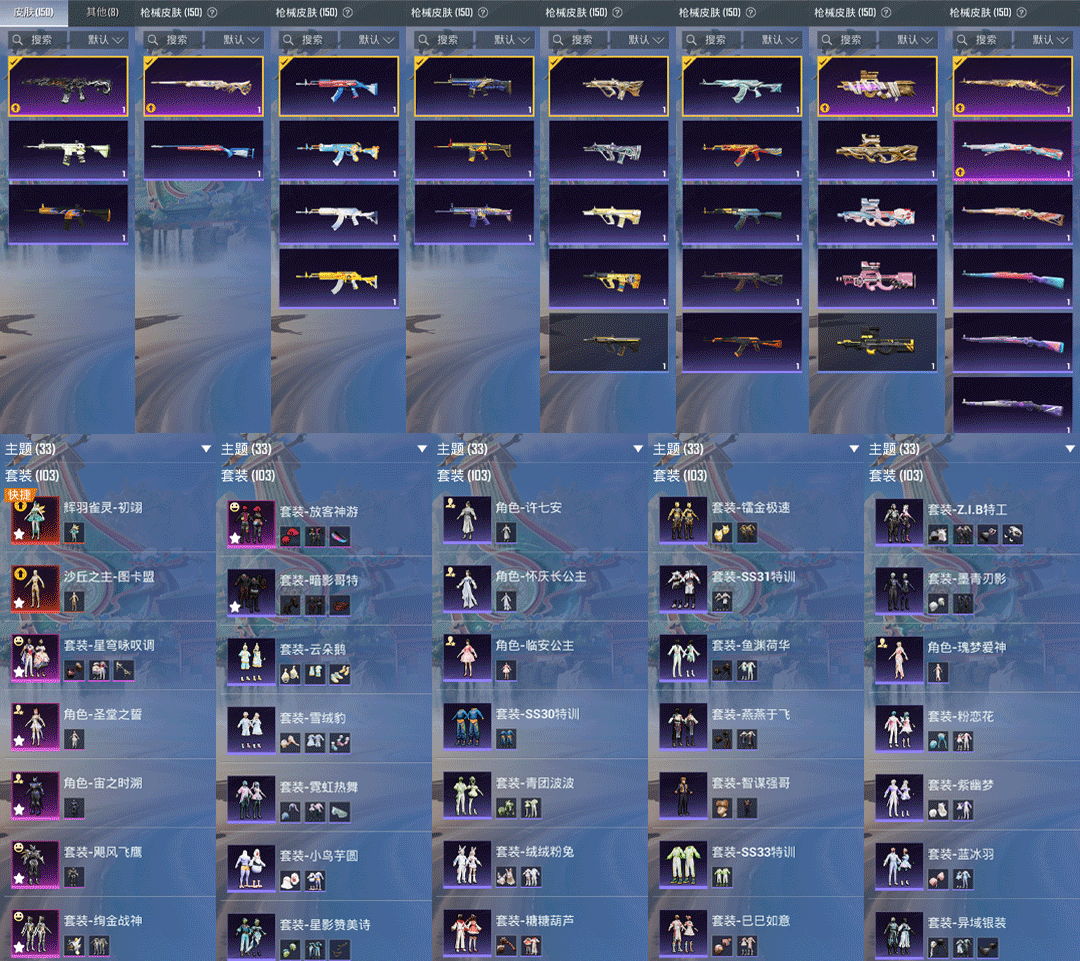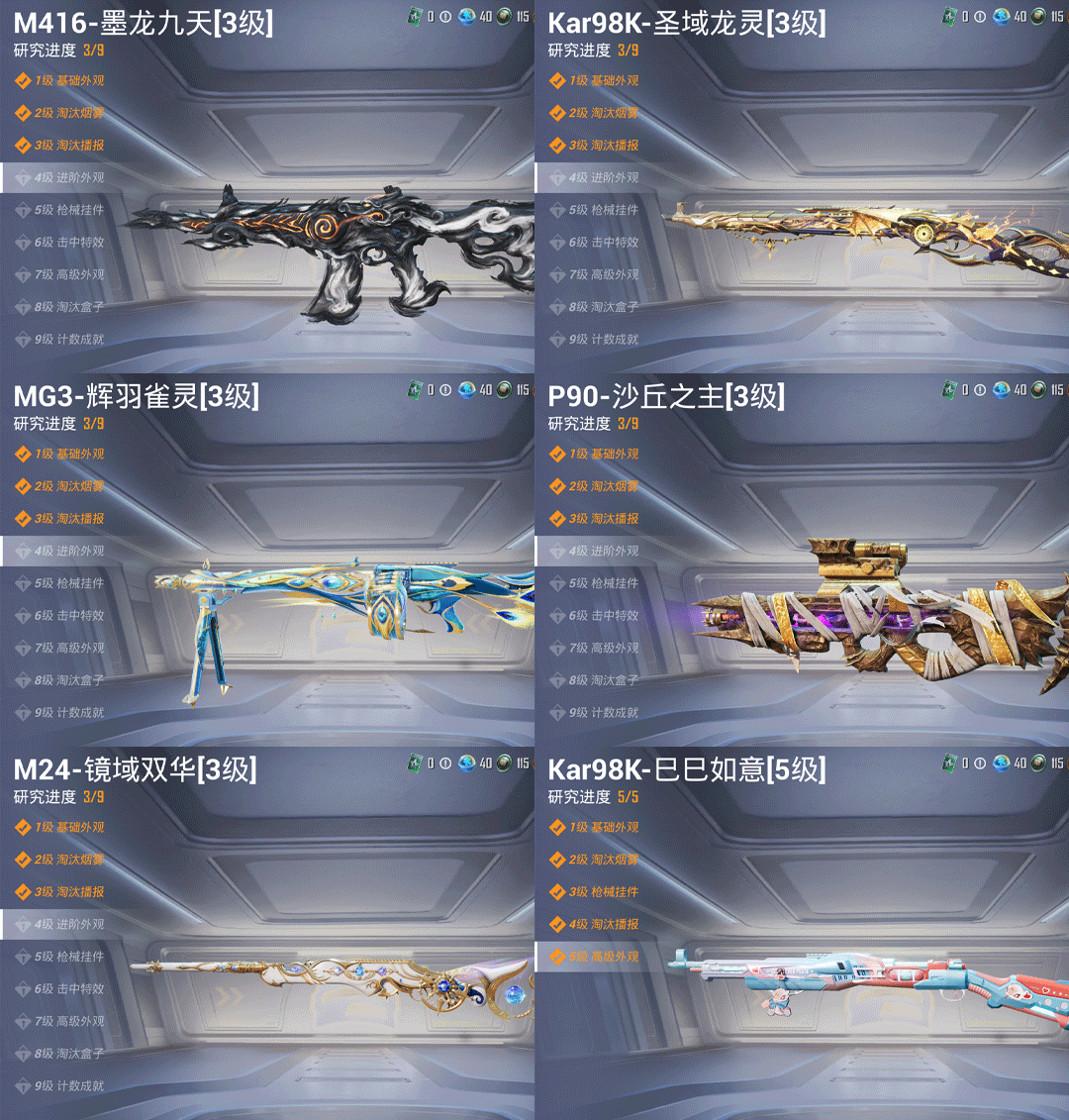 特效枪6:M416-墨龙九天/3级,,M24-镜域双华/3级,,P90-沙丘之主/3级,,Kar98K-圣域龙灵/3级,,MG3-辉羽雀灵/3级,,Kar98K-巳巳如意/5级,