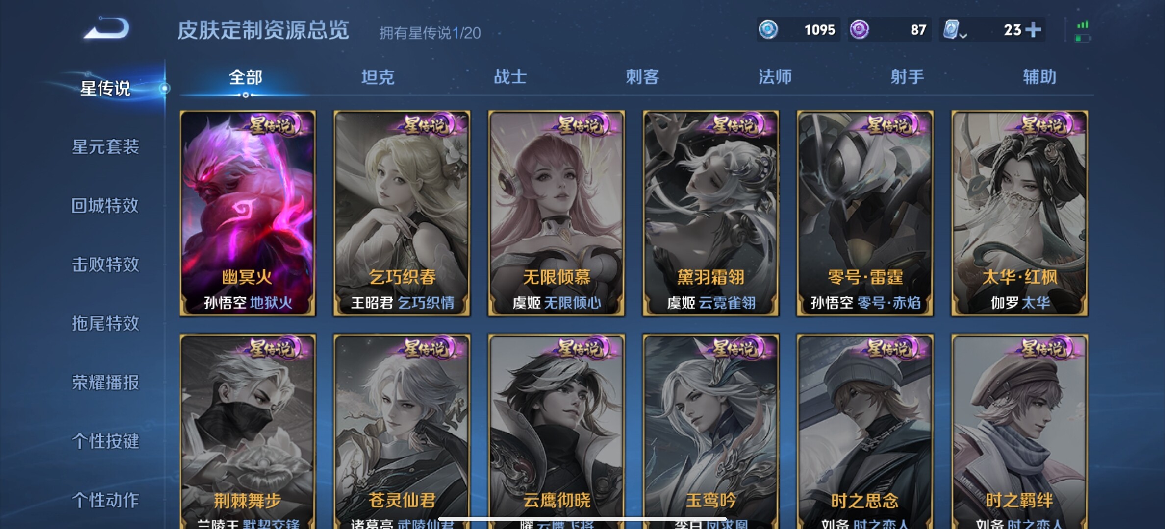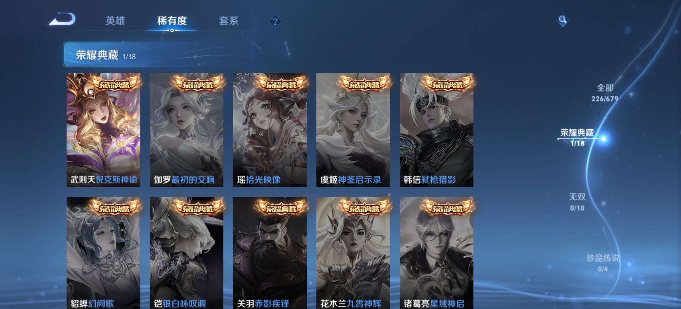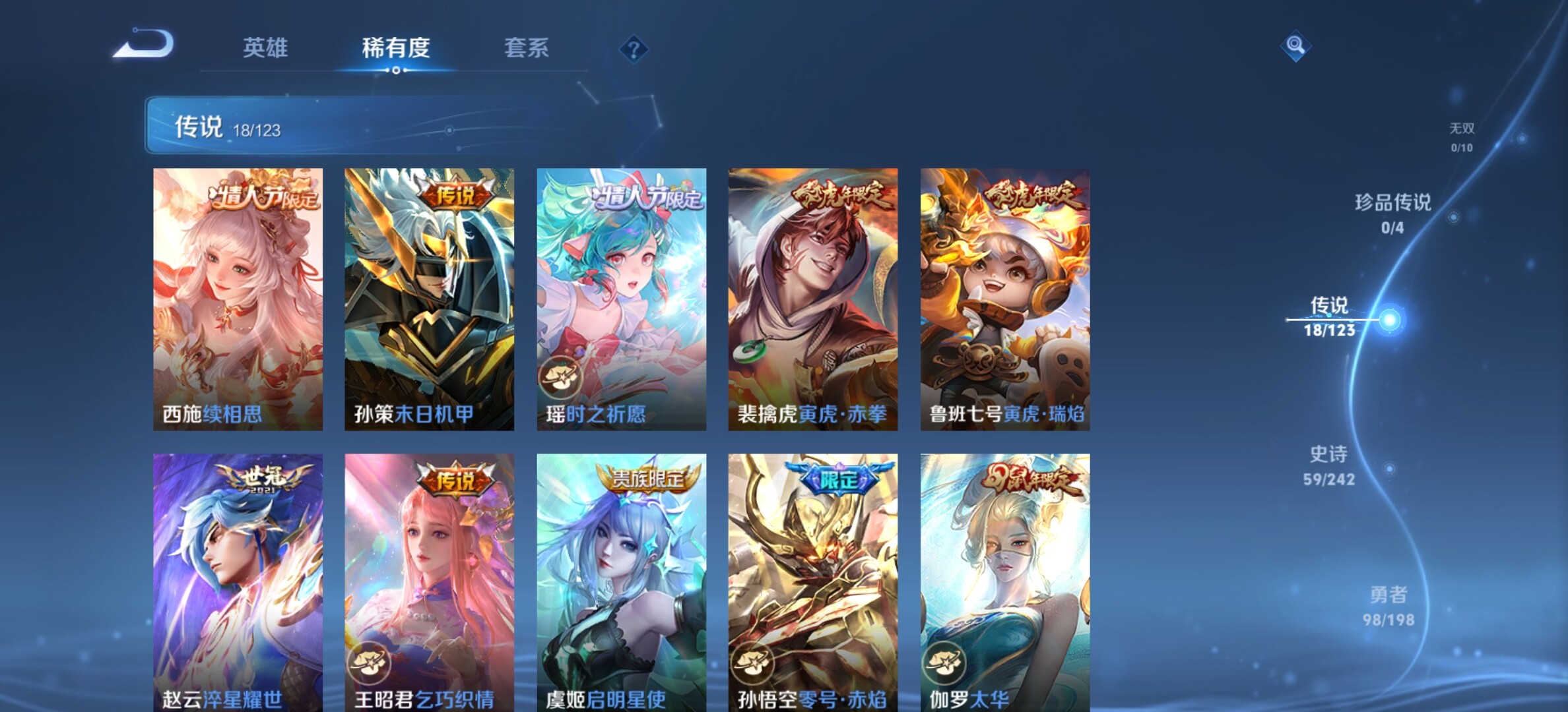 【传说皮肤】:西施续相思,孙策末日机甲,瑶时之祈愿,裴擒虎寅虎赤拳,鲁班七号寅虎瑞焰,赵云淬星耀世,王昭君乞巧织情,虞姬启明星使,孙悟空零号赤焰,伽罗太华,貂蝉猫影幻舞,张