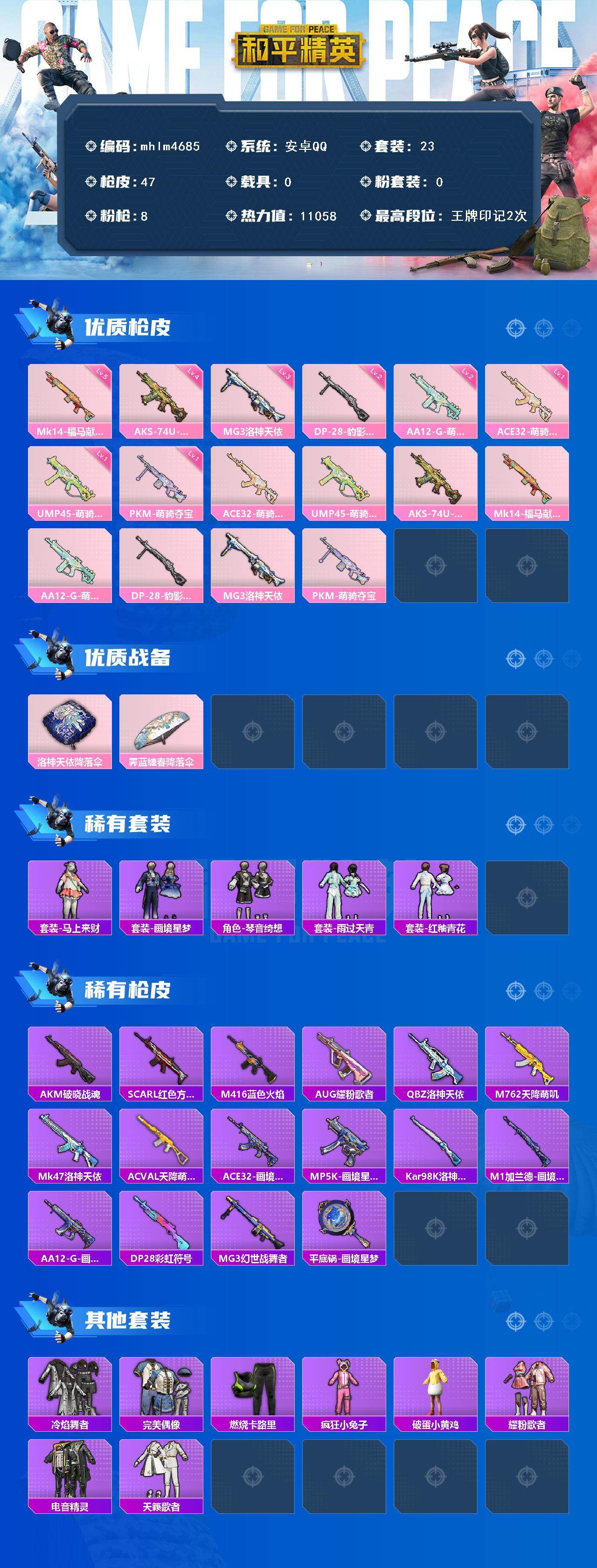 【mhlm4685】安卓 手Q-0粉装-8特效枪-0载具-0粉色飞行器-11058热力值-2王牌印记-23套装-47枪皮