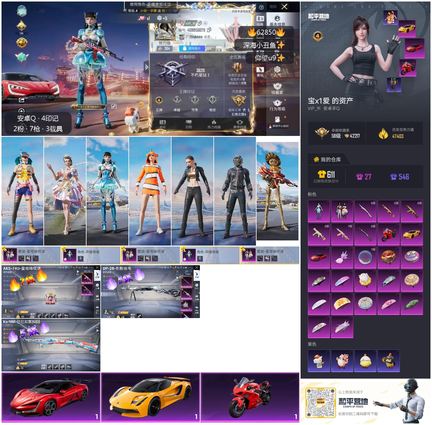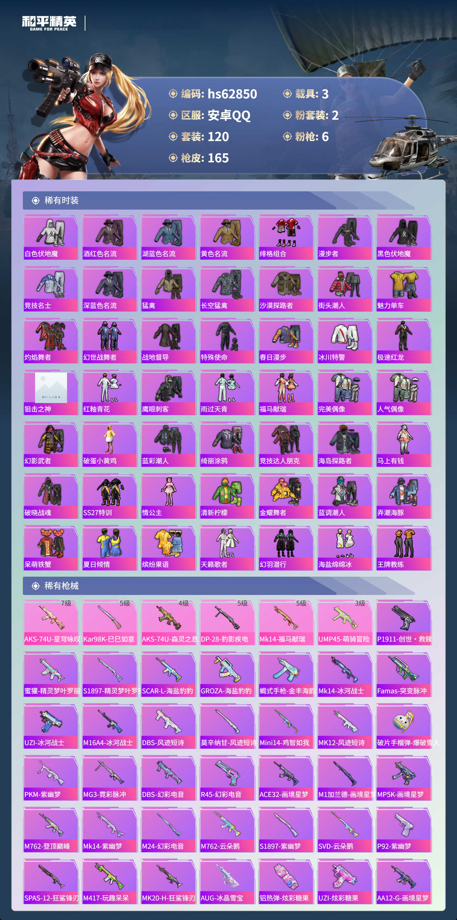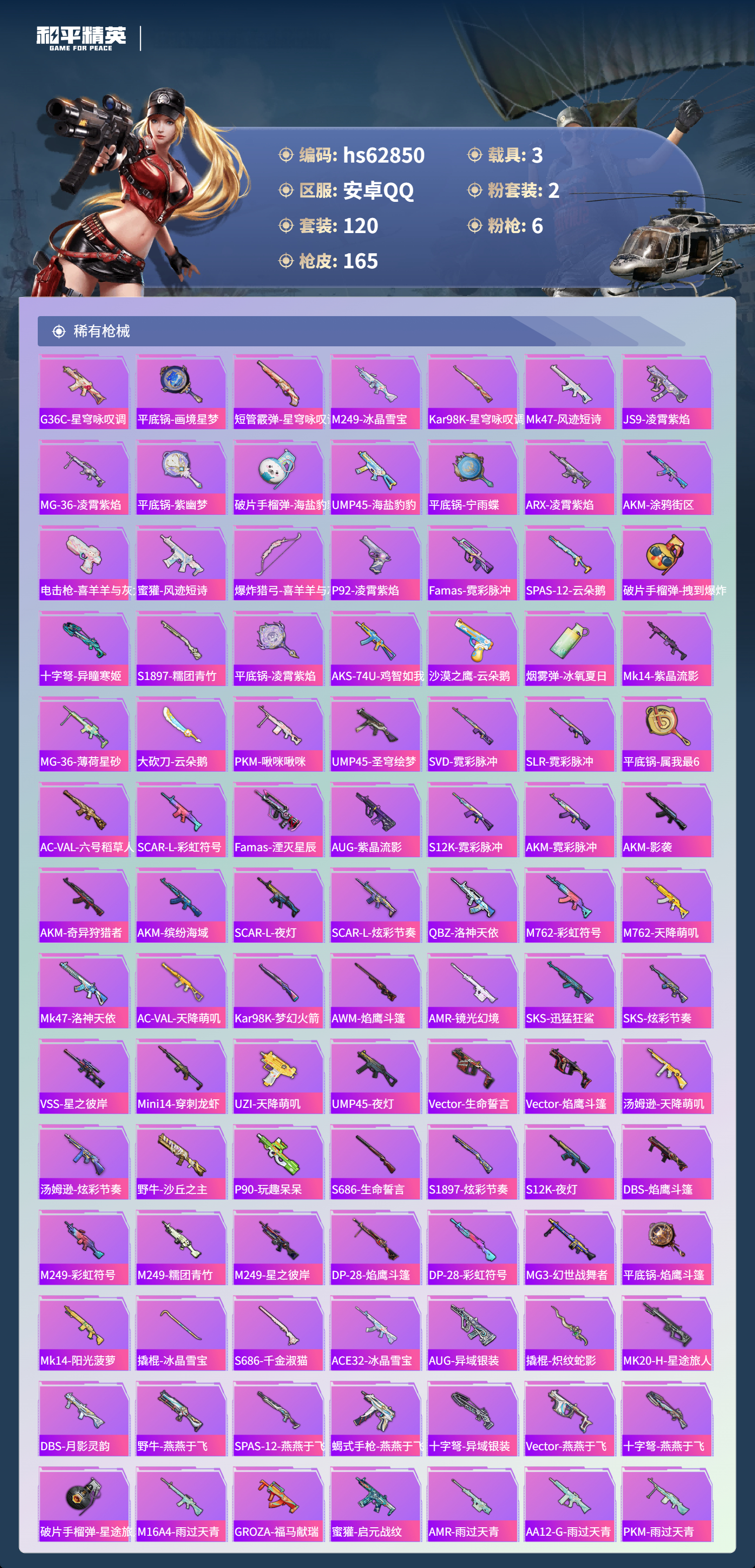hs62850 安卓手Q-4王牌印记-2粉装-6特效枪-3载具-47532热力值-120套装-165枪皮