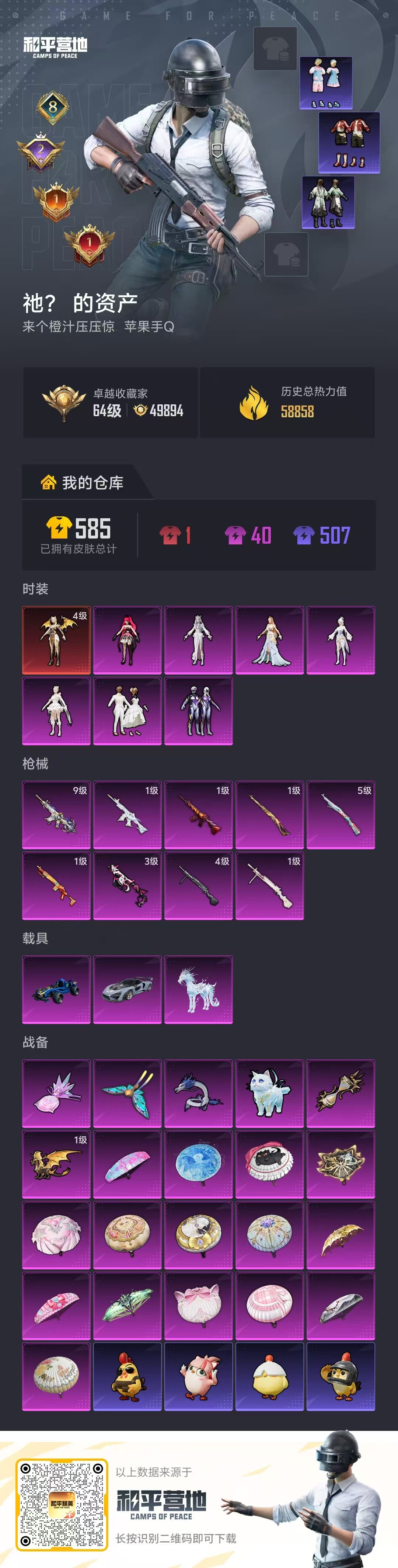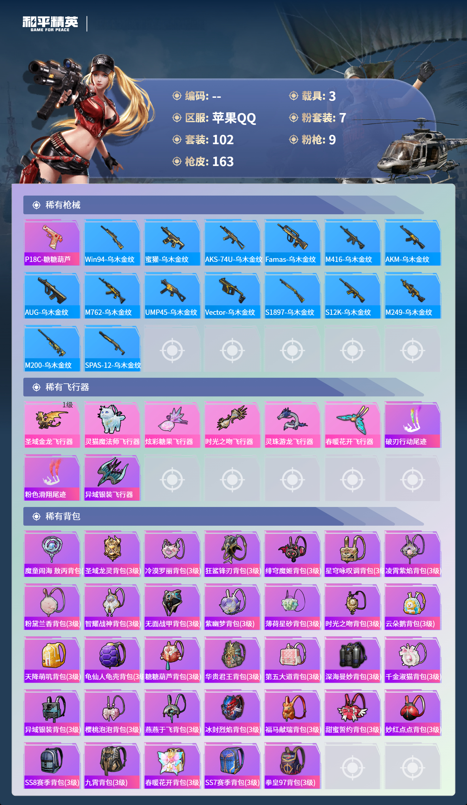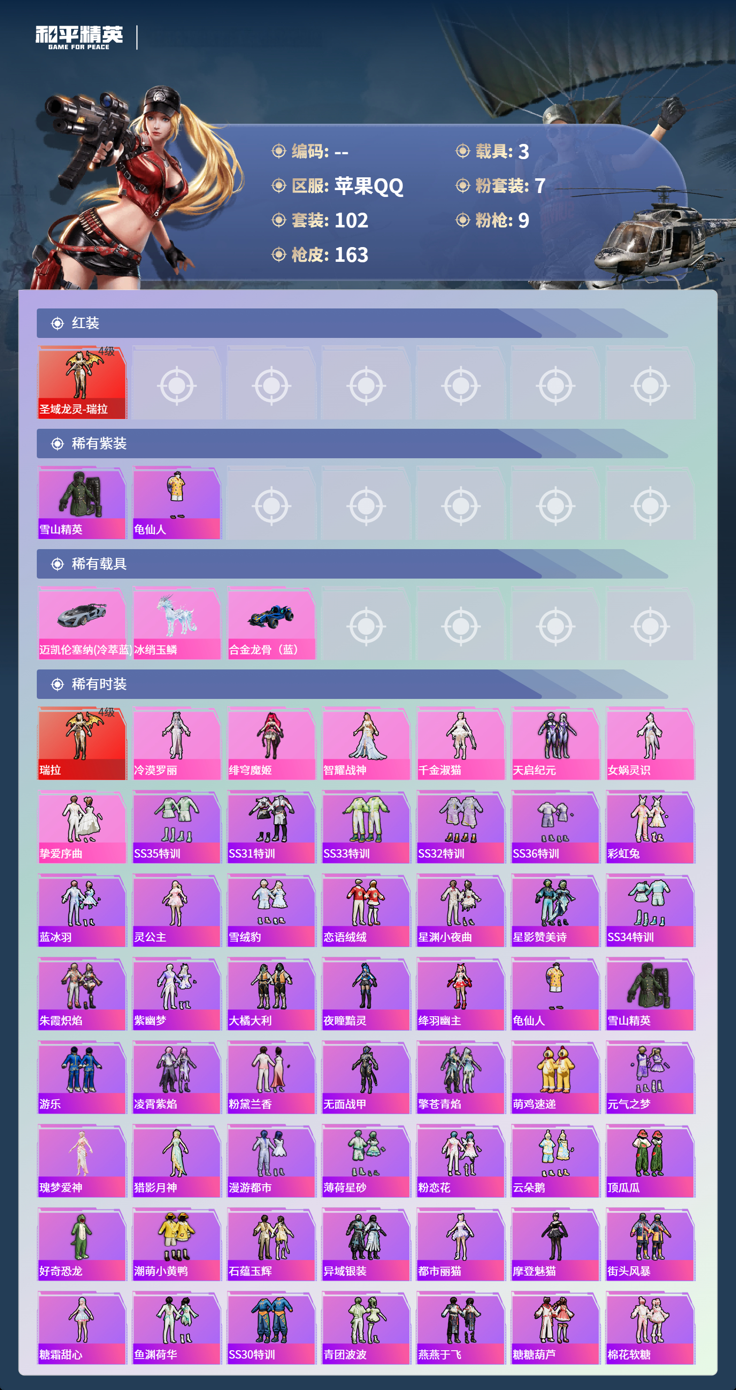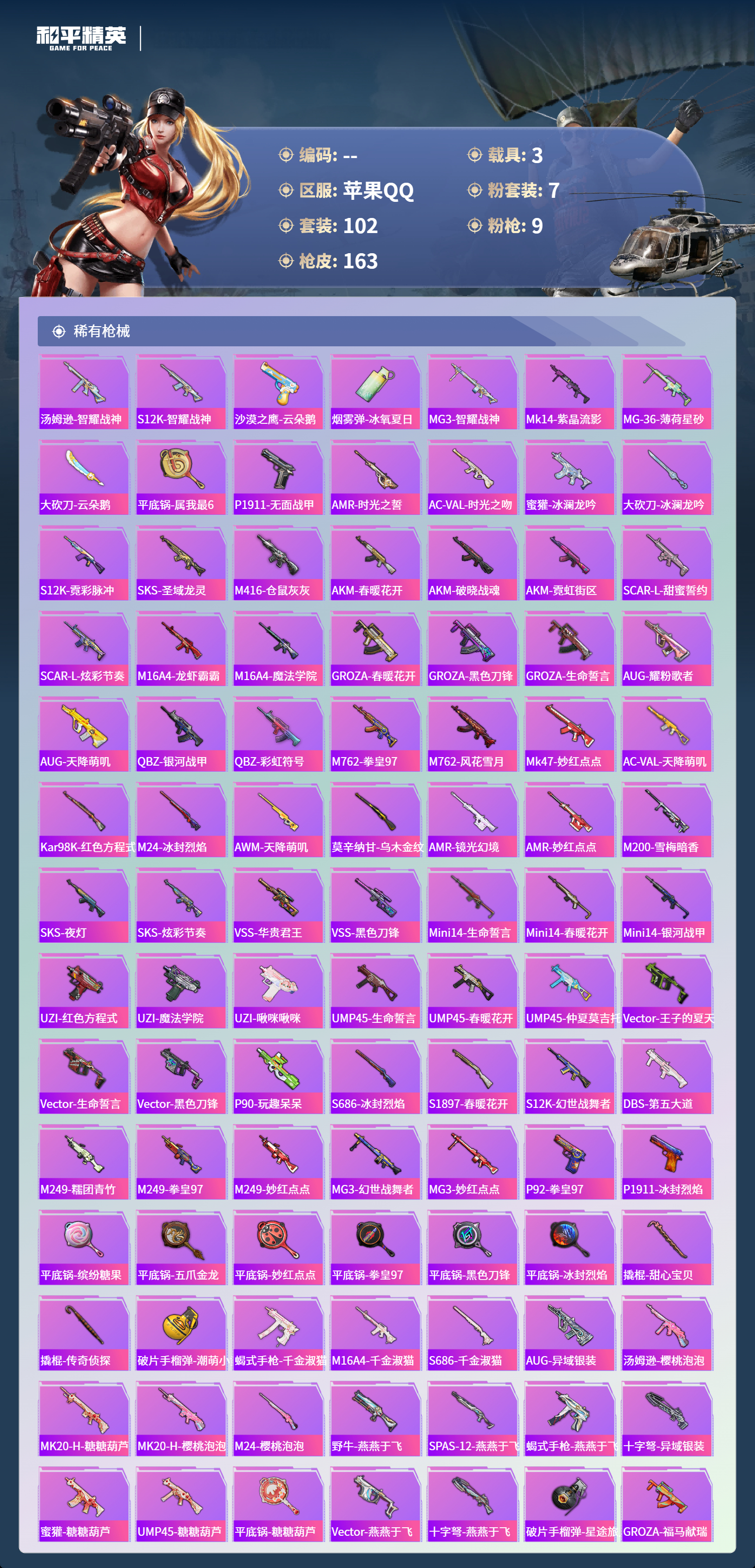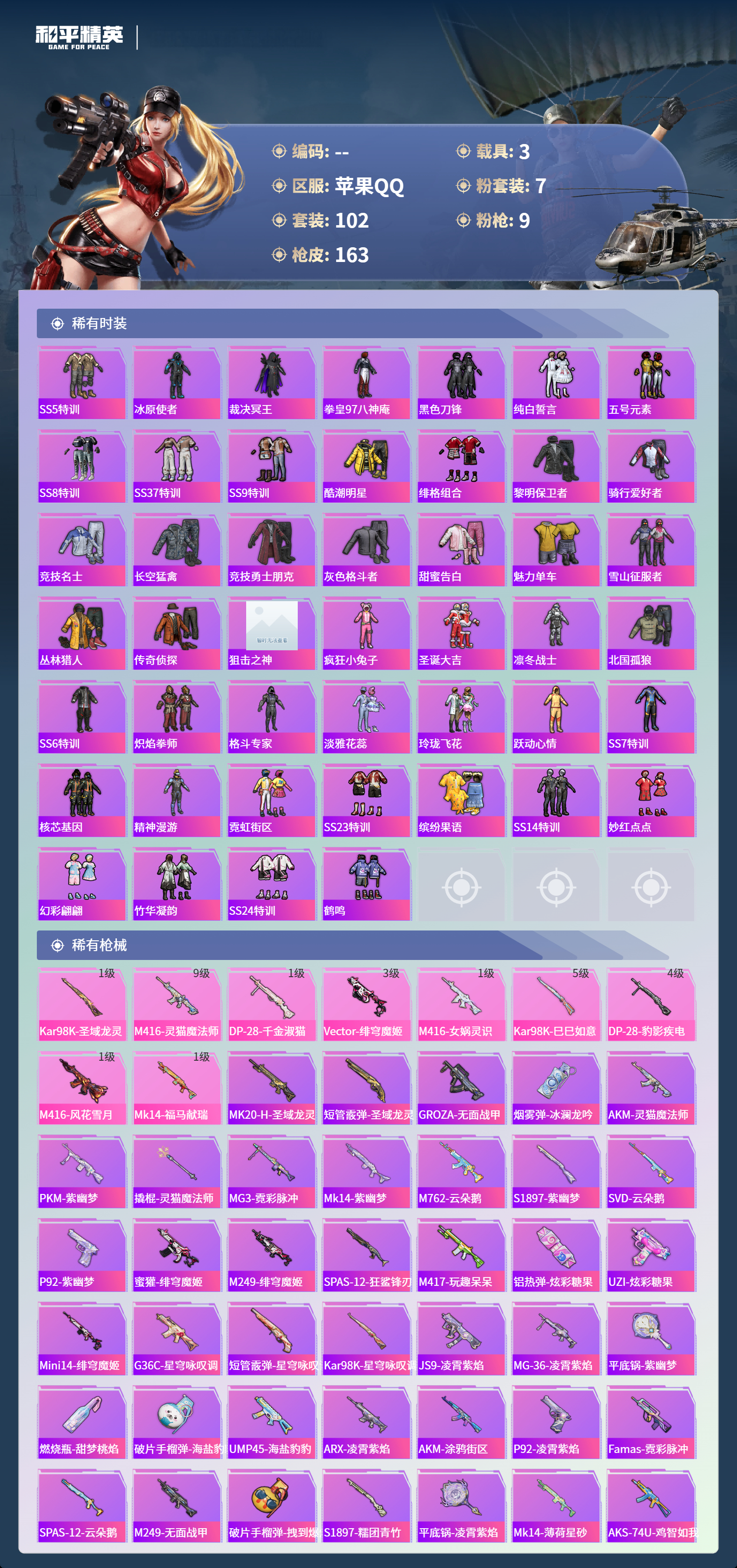 hs62877 苹果手Q-8王牌印记-1红装-7粉装-9特效枪-3载具-58858热力值-102套装-163枪皮-2卓越印记-1传奇印记