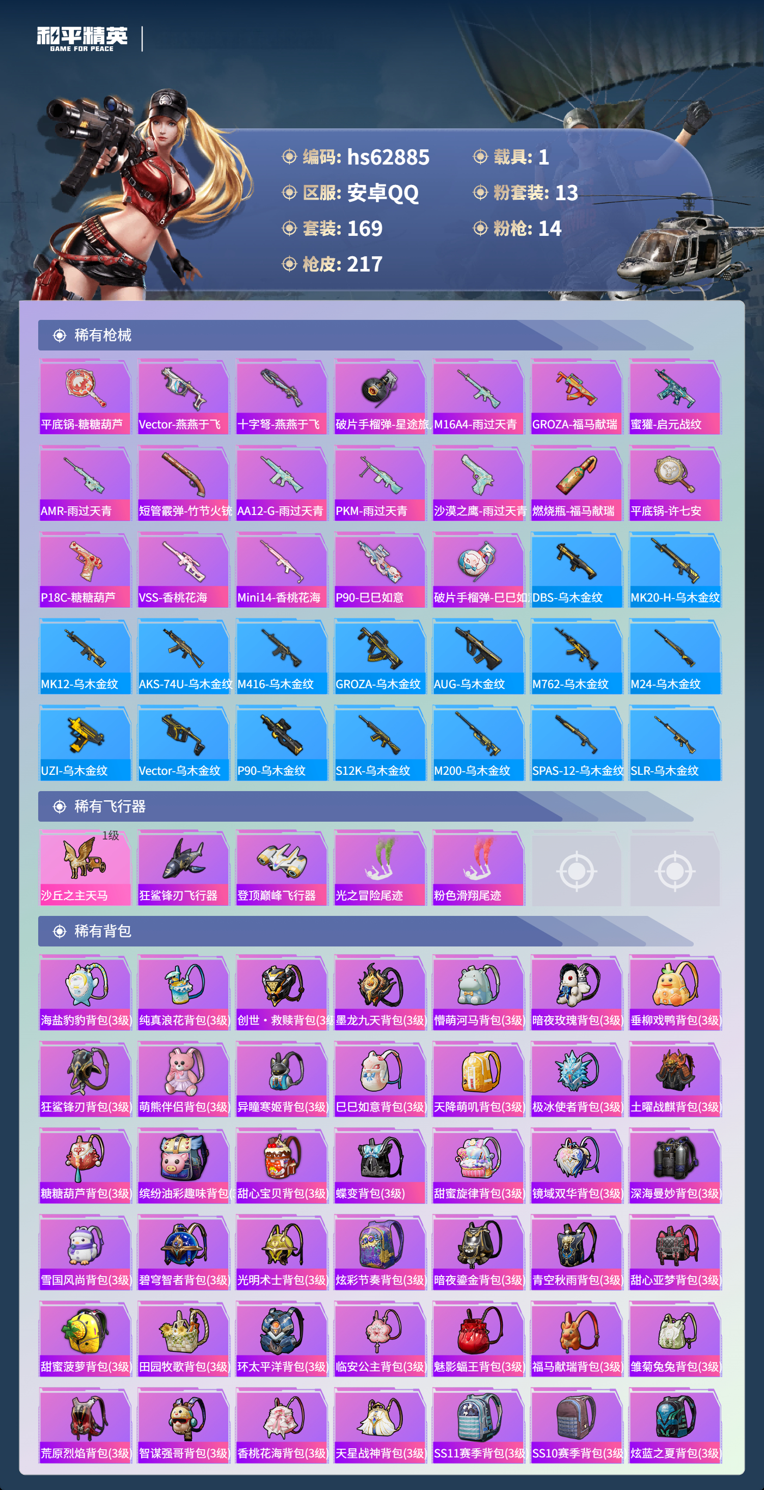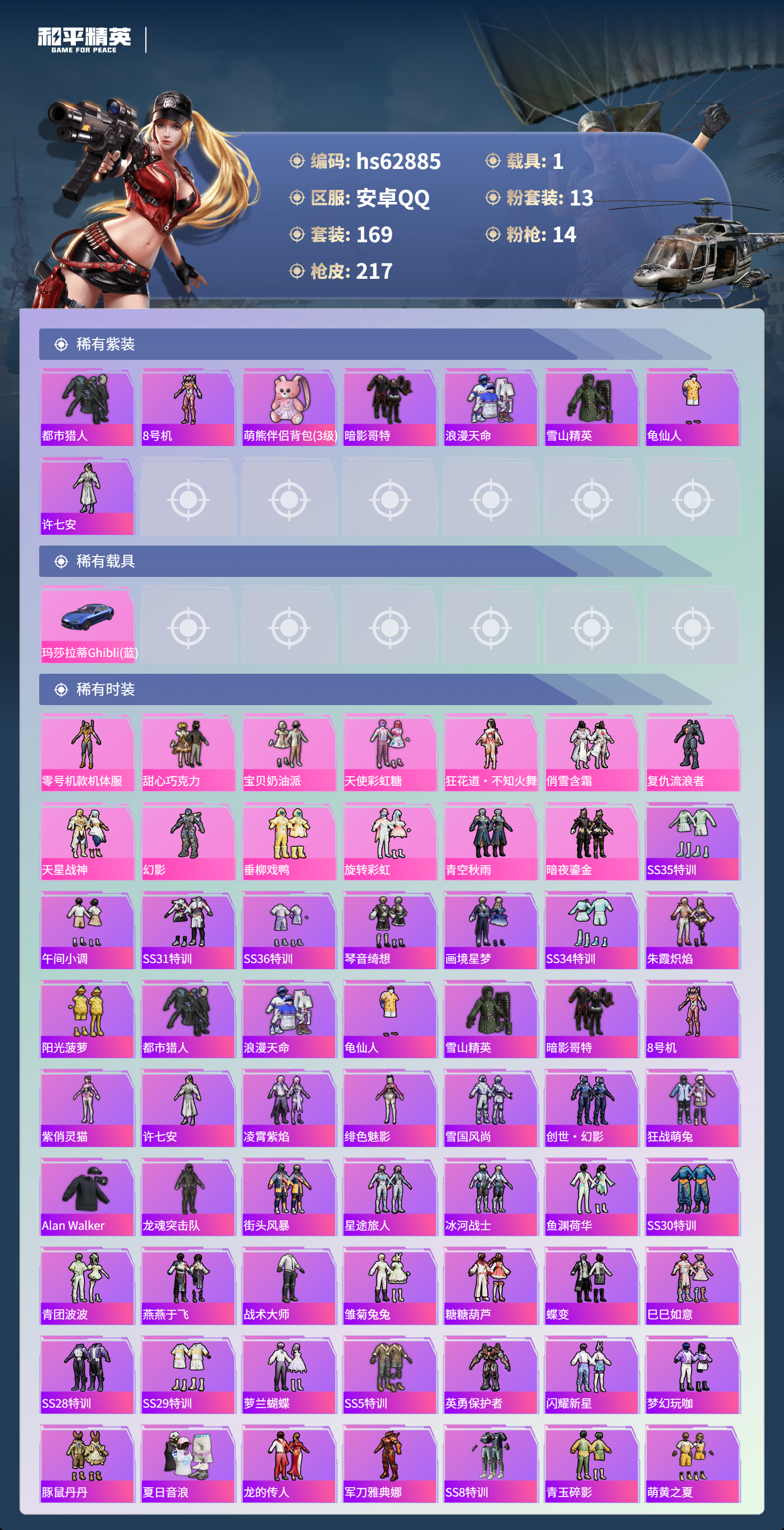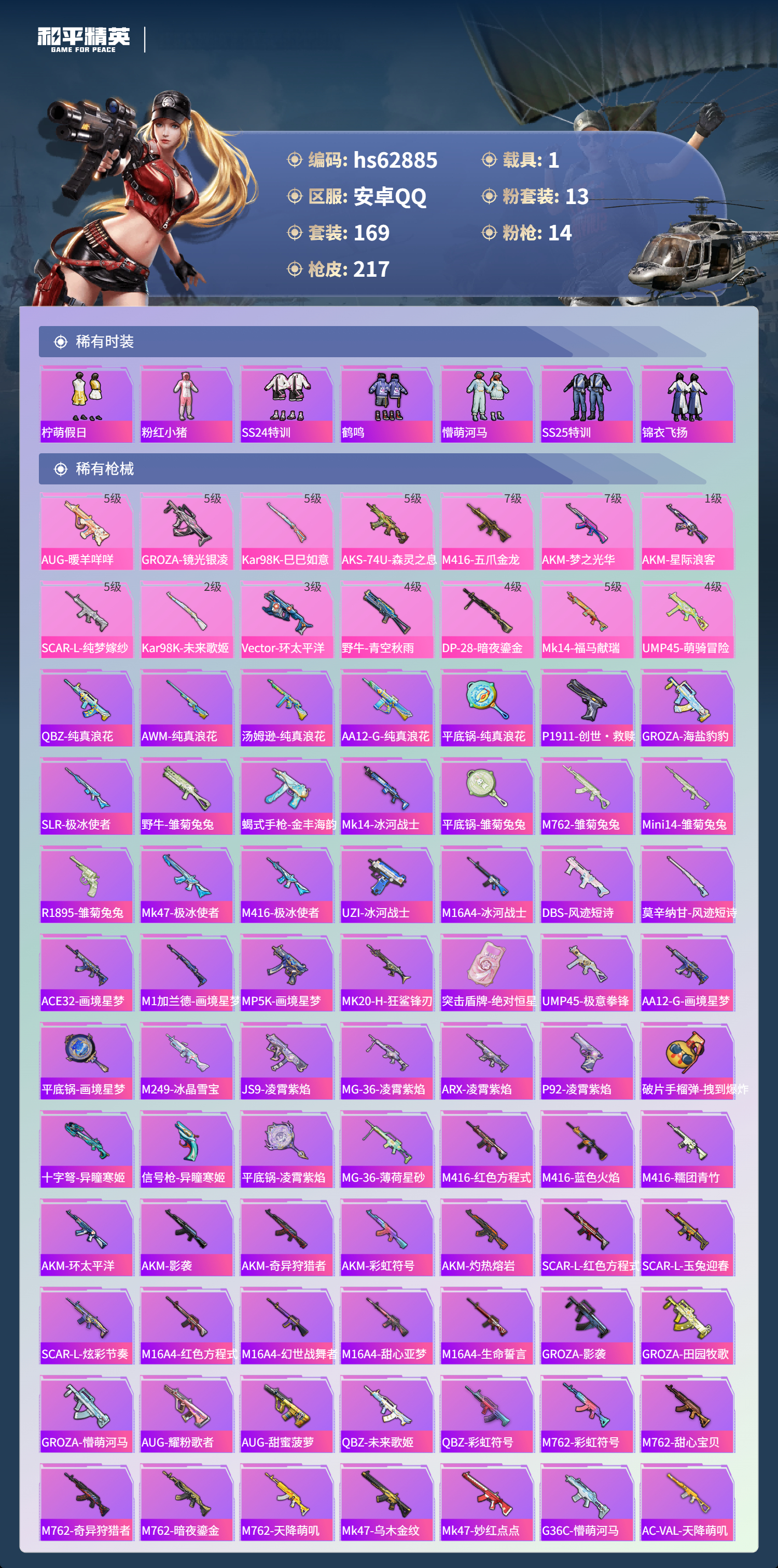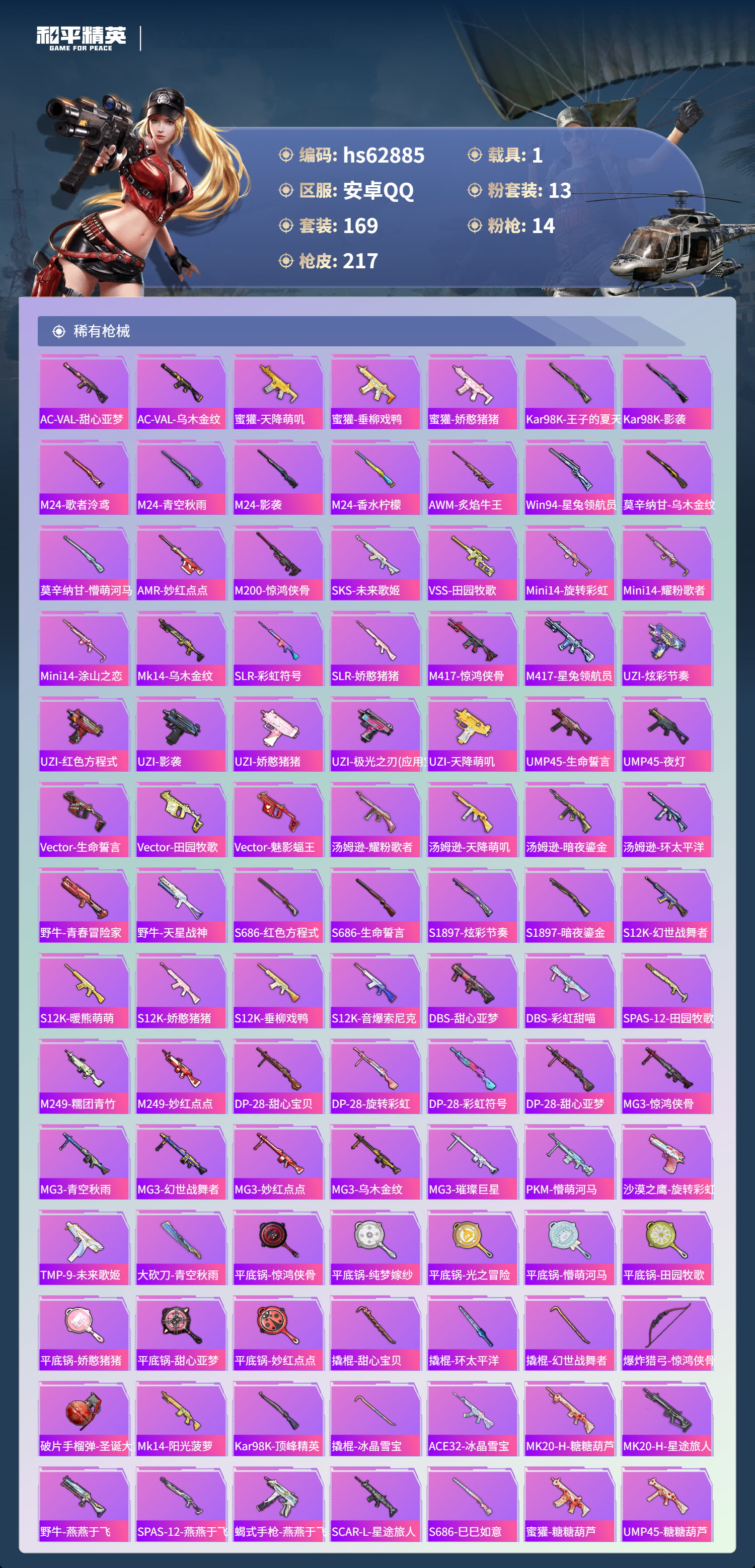 hs62885 安卓手Q-12王牌印记-13粉装-14特效枪-1载具-81473热力值-169套装-217枪皮-2卓越印记-1传奇印记
