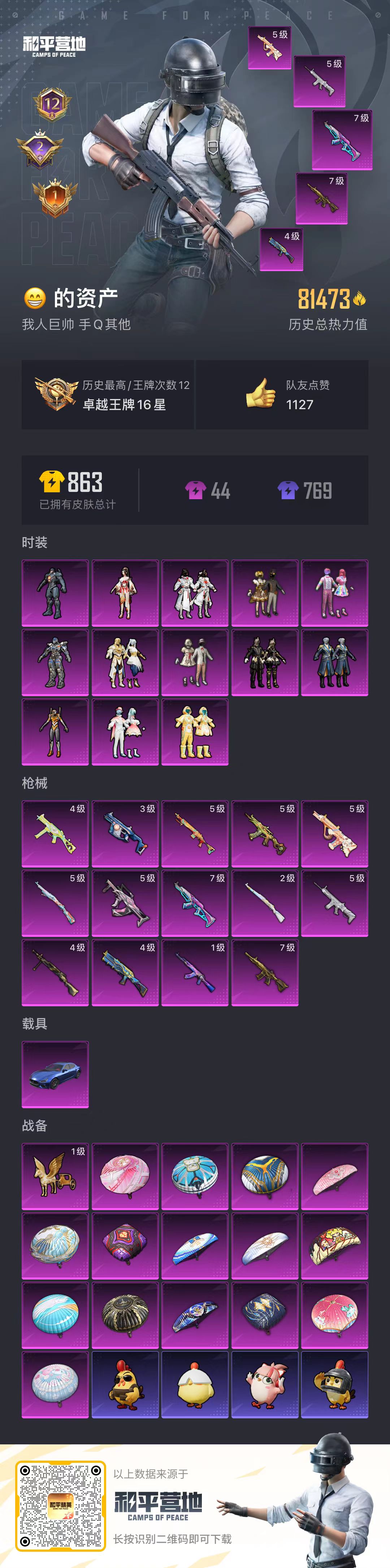 -12王牌印记-13粉装-14特效枪-1载具-81473热力值-169套装-217枪皮-2卓越印记-1传奇印记