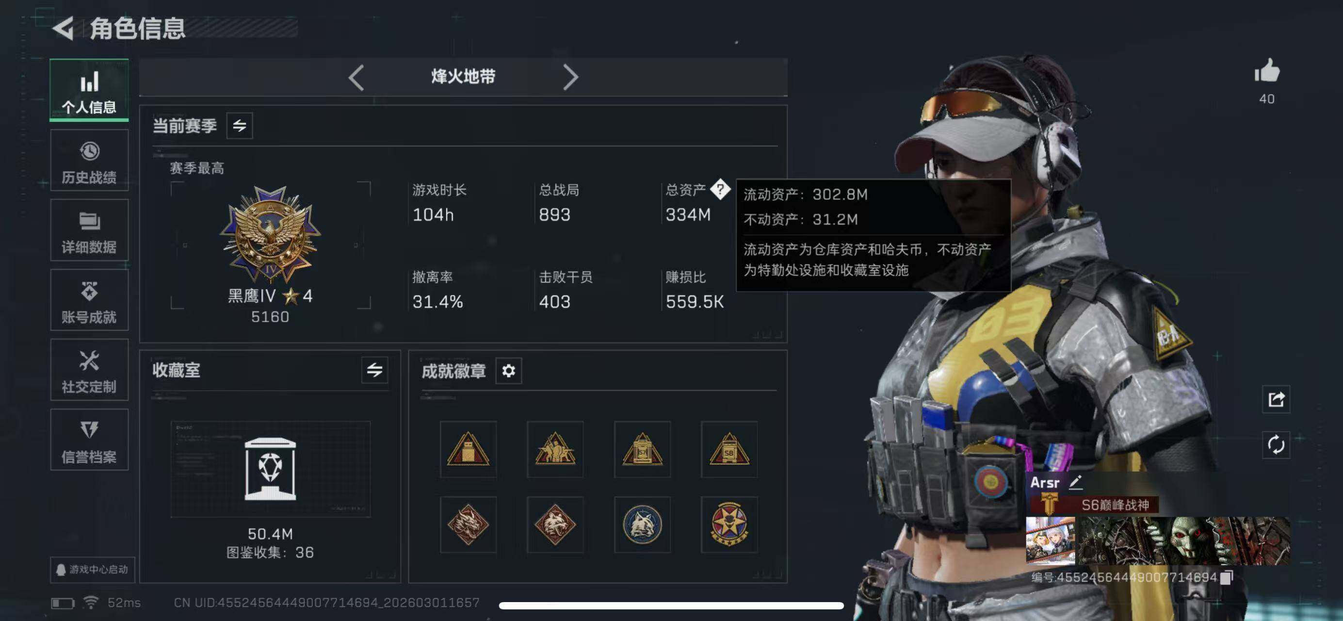 【SJ1249】335m总资产-104095k哈伏币-60烽火等级-黑鹰-39战场等级-上等兵