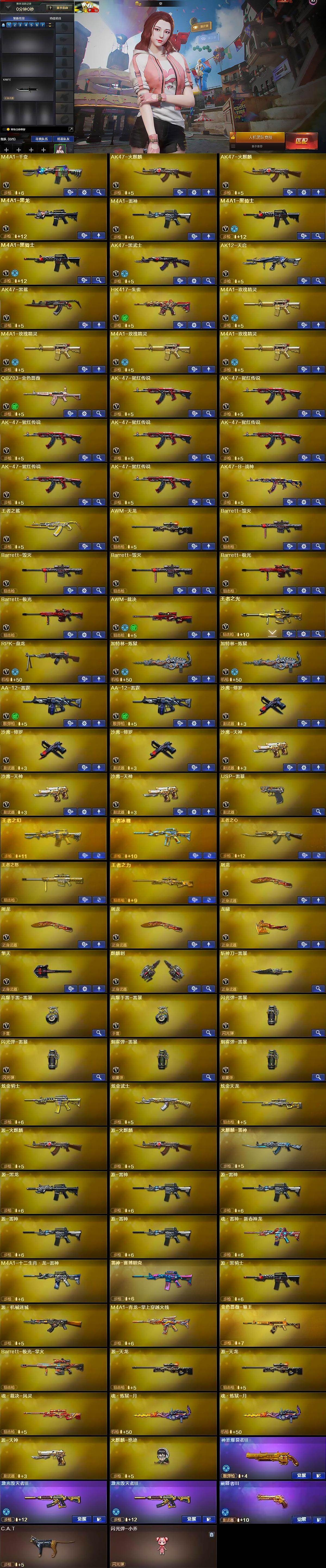 【热门武器】:QBZ03-金色蔷薇,HK417-朱雀,C.A.T,M4A1-黑骑士*2,RPK-盘龙,加特林-炼狱*2,火麒麟-绝迹,USP-雷暴,沙鹰-修罗*3