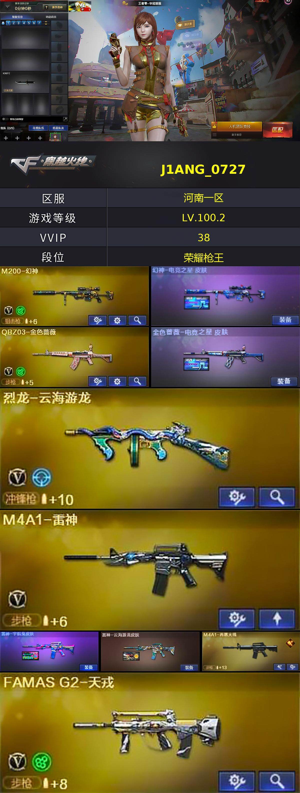 【ky4980】河南一区-37V-0王者-0炫金【热门武器】:QBZ03-金色蔷薇,M200-幻神,Cat-刀锋,牛牛-AK47,沙鹰-修罗【音效卡】:擎天-云海游龙音效卡,QBZ03-天罚音效卡,Barrett-碧霄极光音效卡,炼狱-百战金芒-庆典舞曲音效卡【皮肤】:幻神-电竞之星 皮肤,金色蔷薇-电竞之星 皮肤,雷神-宇航兔皮肤,雷神-云海游龙皮肤,M4A1-再燃火线,毁灭-黑大圣皮肤,毁灭-秦师 皮肤,毁灭-英雄计划 皮肤,屠龙-春桃 皮肤,轻型军用手斧-再燃火线【角色】:王者零-华冠丽服
