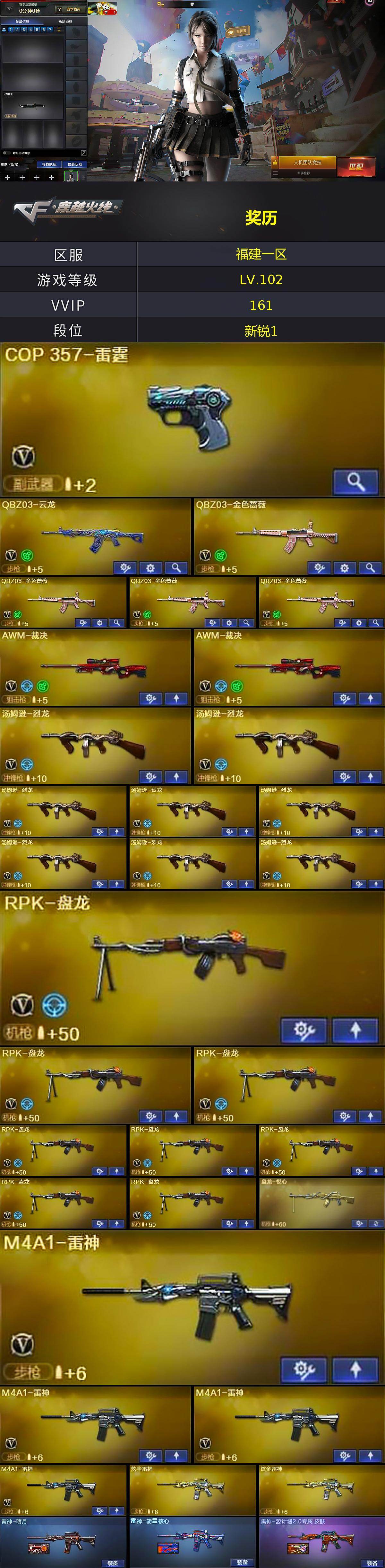 福建一区-160V-16王者-7炫金【热门武器】:QBZ03-金色蔷薇*4,死亡之眼*4,M4A1-黑骑士,汤姆逊-烈龙*8,RPK-盘龙*8,加特林-炼狱*3,沙鹰-修罗*11【王者炫金武器】:天启-悦智,王者之势,王者之武,王者之影,王者之心,王者之怒*2,王者之力,盘龙-悦心,王者之魂*2,王者之锋*3,炫金火麒麟,炫金黑龙*2,炫金雷神*2,炫金毁灭,炫金修罗【音效卡】:Barrett-毁灭音效卡【皮肤】:雷神-暗月,雷神-能量核心,雷神-源计划2.0专属 皮肤,毁灭-暗月*2,毁灭-星