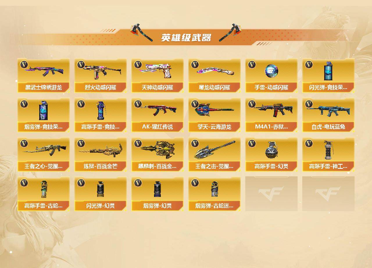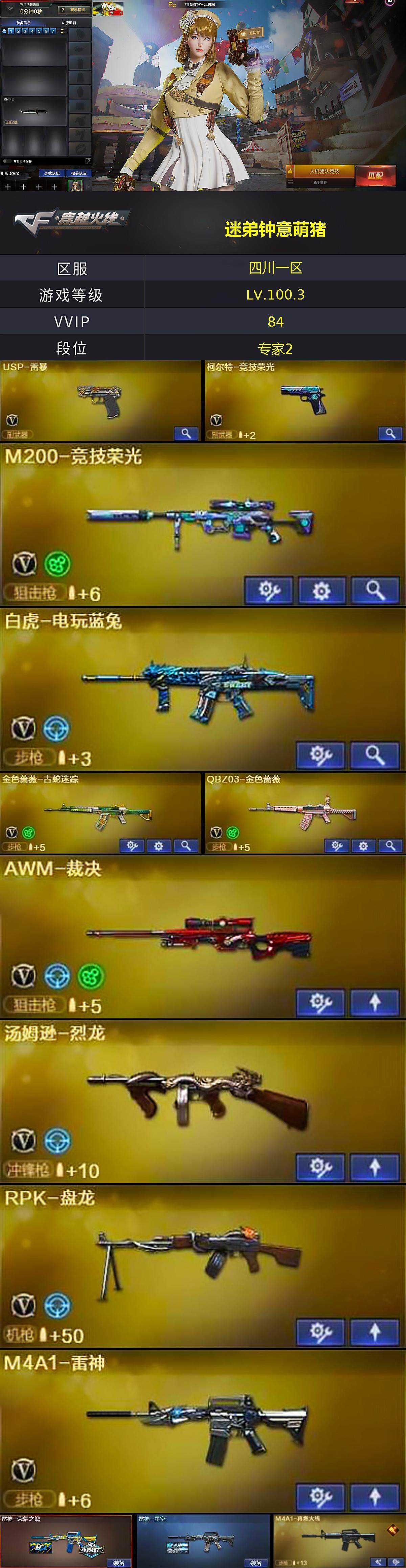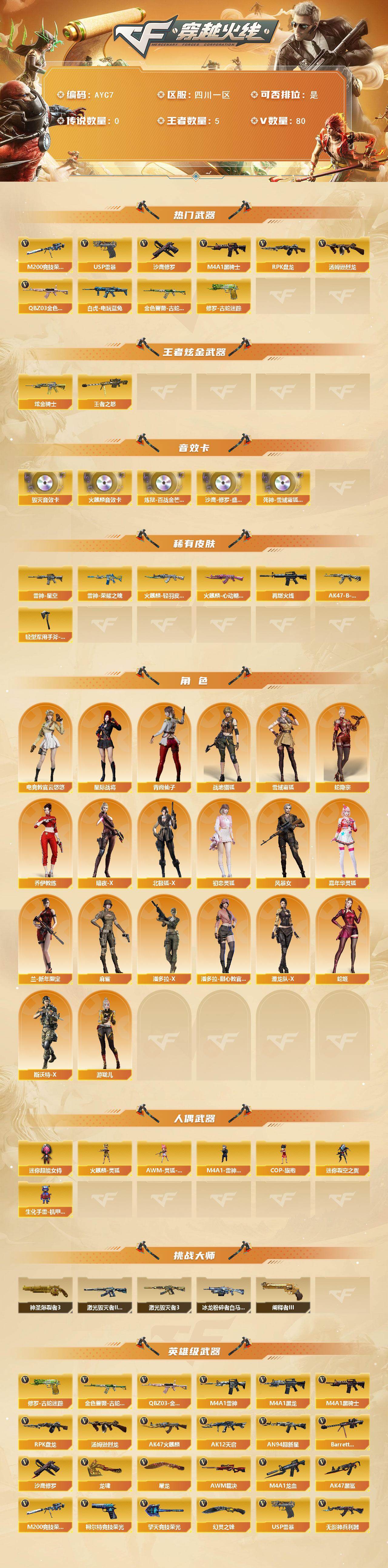 四川一区-80V-5王者-3炫金【热门武器】:QBZ03-金色蔷薇,金色蔷薇-古蛇迷踪,修罗-古蛇迷踪,M200-竞技荣光,白虎-电玩蓝兔,M4A1-黑骑士,汤姆逊-烈龙,RPK-盘龙,USP-雷暴,沙鹰-修罗*3【王者炫金武器】:王者之怒,炫金骑士*3【音效卡】:AK47-火麒麟音效卡,Barrett-毁灭音效卡,炼狱-百战金芒-庆典舞曲音效卡,沙鹰-修罗-盛典舞曲音效卡,死神-雪域霜狐-怀旧音效卡【皮肤】:雷神-荣耀之魄,雷神-星空,M4A1-再燃火线,火麒麟-轻羽皮肤,火麒麟-心动糖果,A