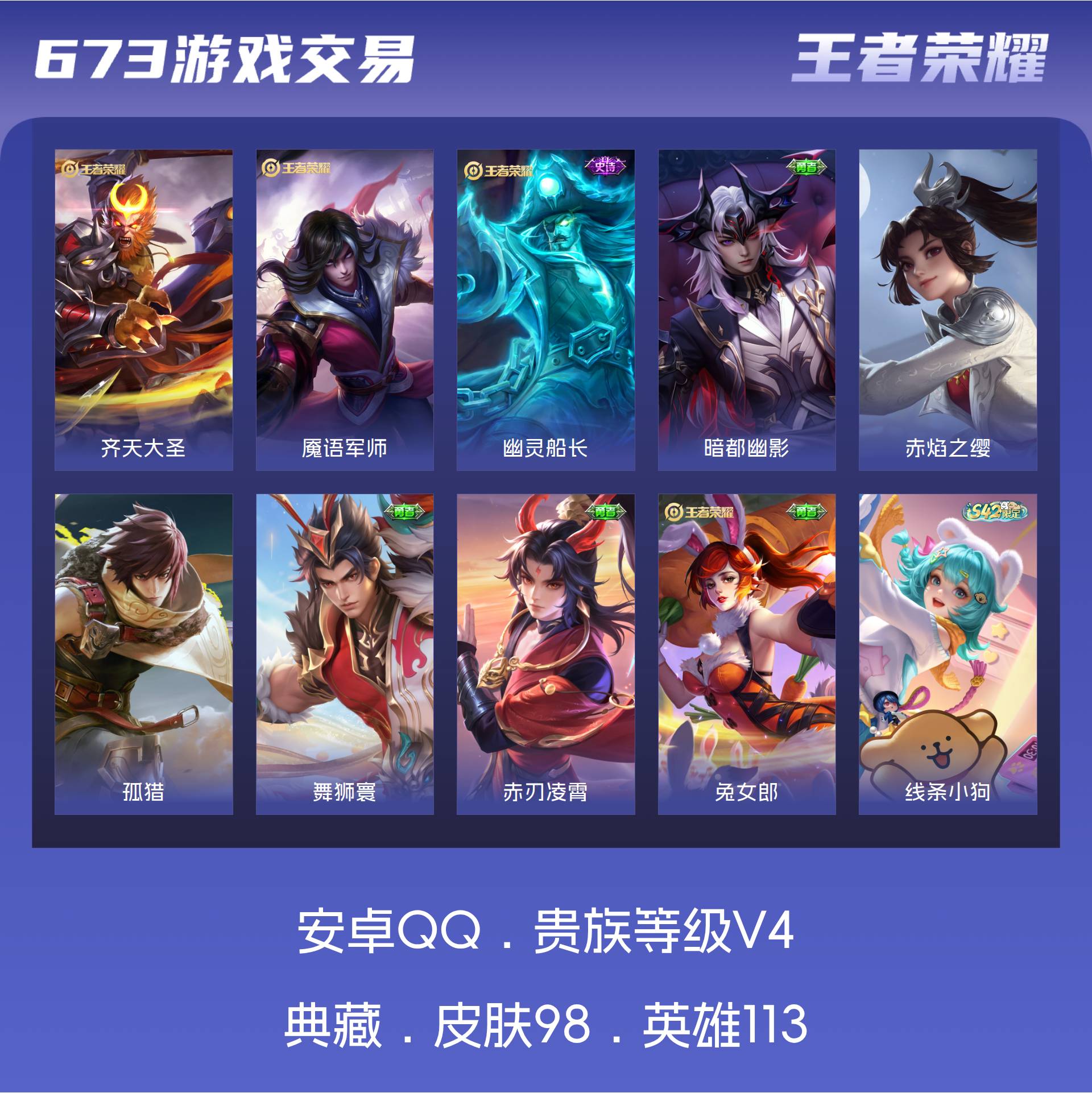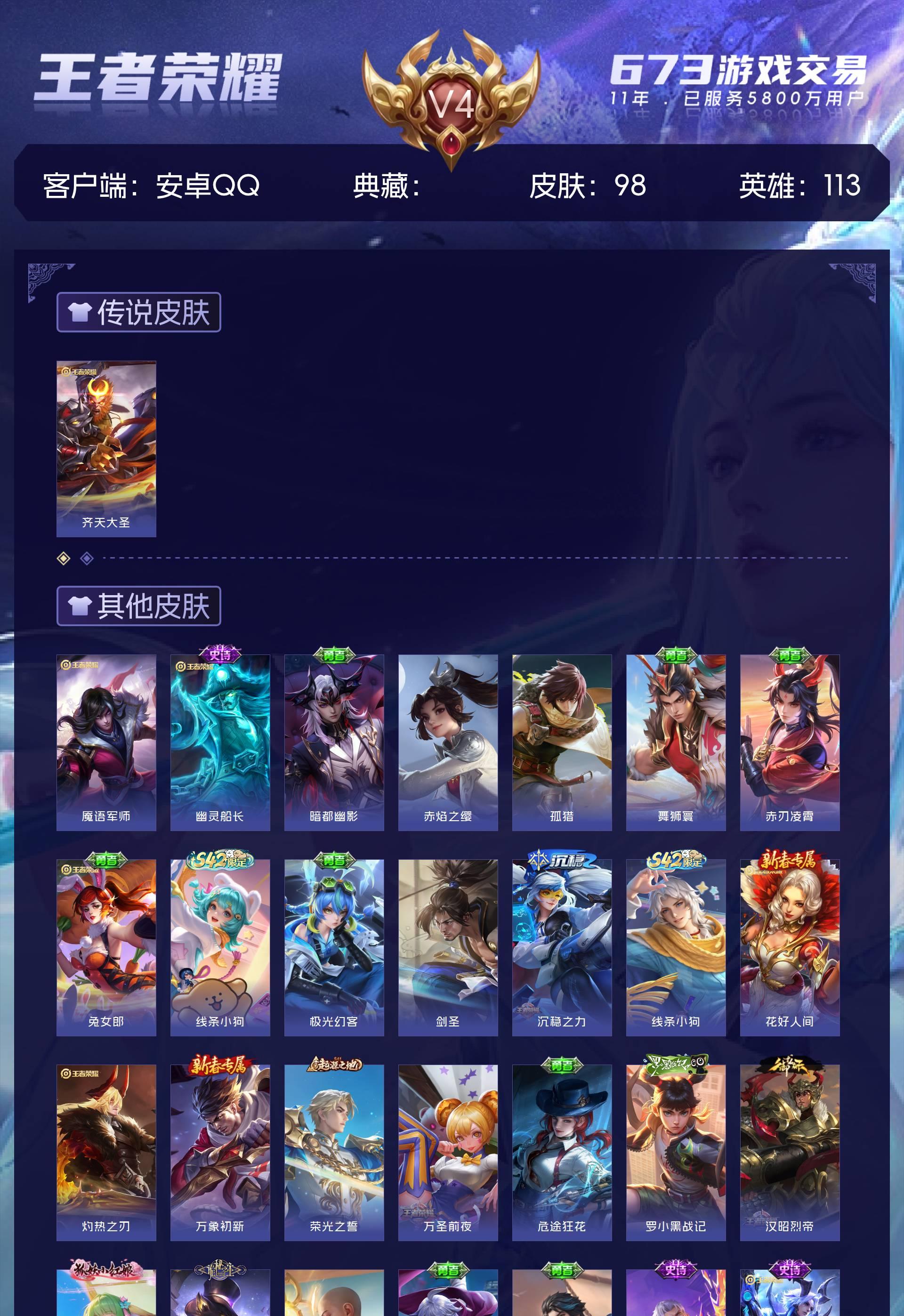 V4 皮肤98 英雄113 永恒钻石 传说1 其他皮肤104