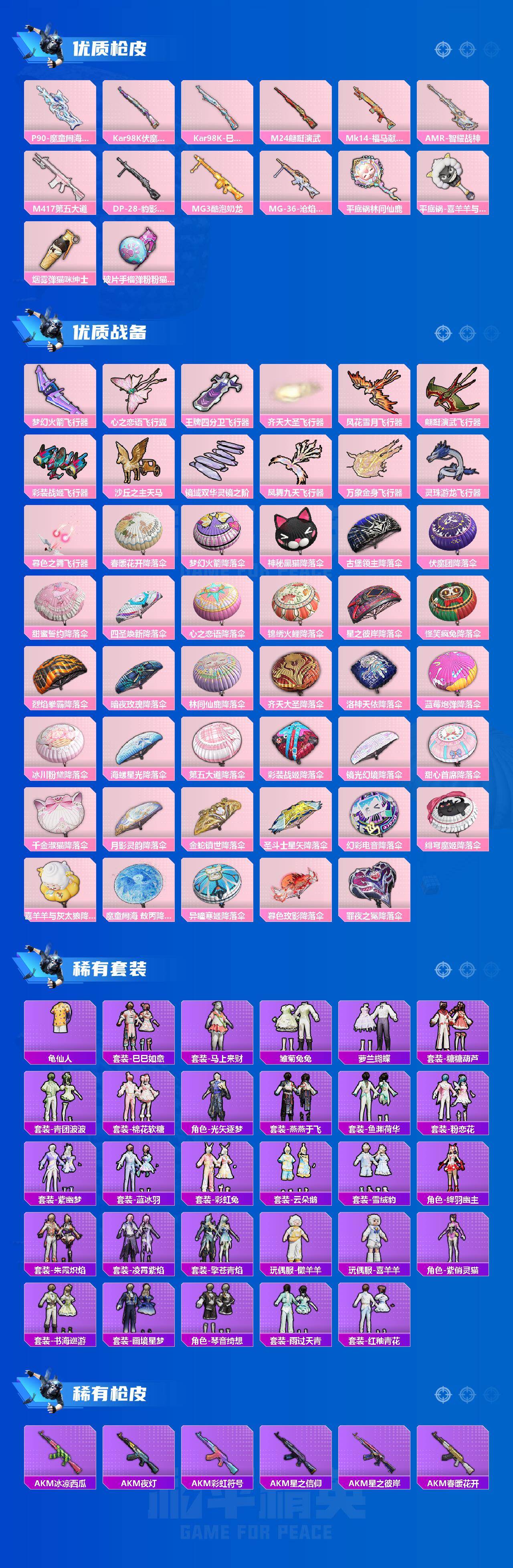 【热门品类】:粉装-雪国幻梦,粉装-梦幻火箭,粉装-缤纷油彩,套装-浪漫天命,套装-胖达圆圆,套装-暗夜行者,套装-浪客战士,角色-忠真马岱,套装-龟仙人,套装-潮萌小黄鸭,套装-浪漫波比,大砍刀-青龙偃月刀,撬棍