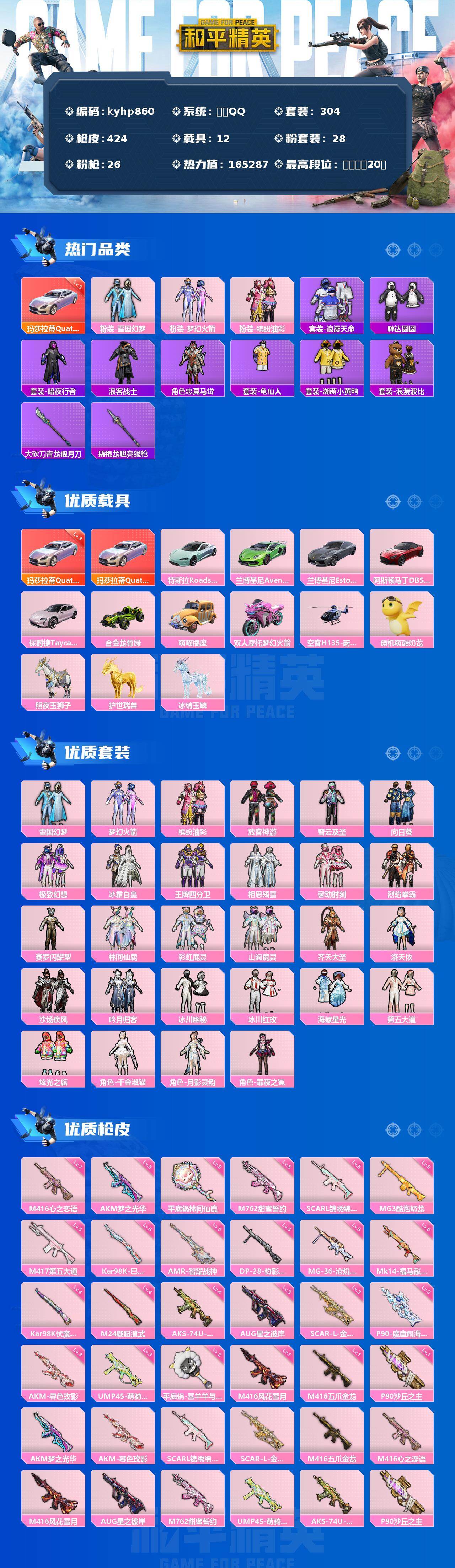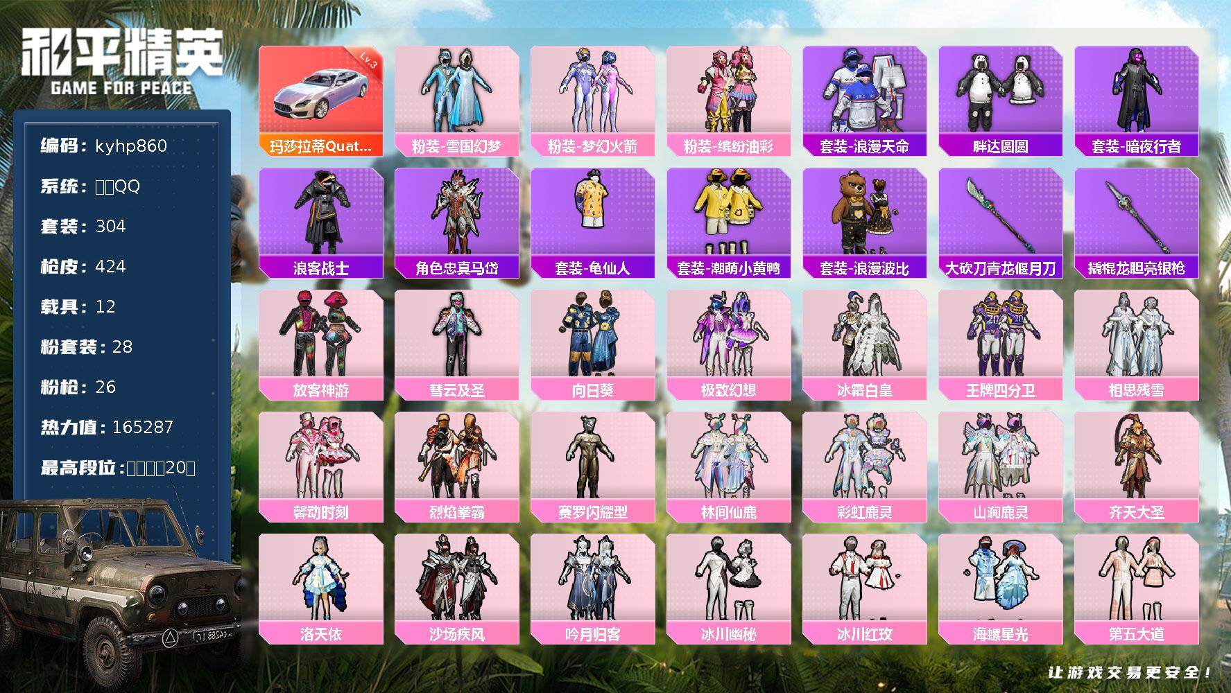安卓 手Q-28粉装-26特效枪-12载具-13粉色飞行器-165287热力值-20王牌印记-304套装-424枪皮
