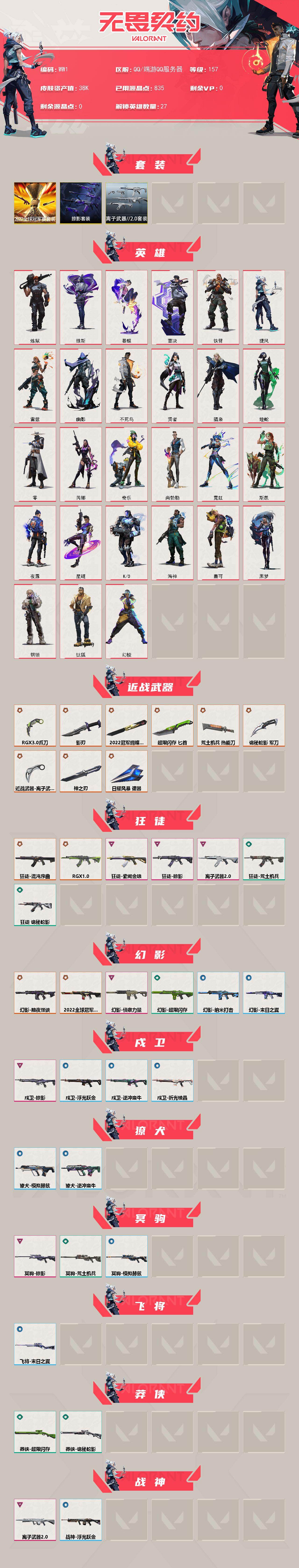 【英雄】:幻棱,炼狱,维斯,暮蝶,钛狐,壹决,铁臂,捷风,雷兹,幽影,不死鸟,贤者,猎枭,蝰蛇,零,芮娜,奇乐,尚勃勒,霓虹,斯凯,夜露,星礈,K/O,海神,盖可,黑梦,钢锁