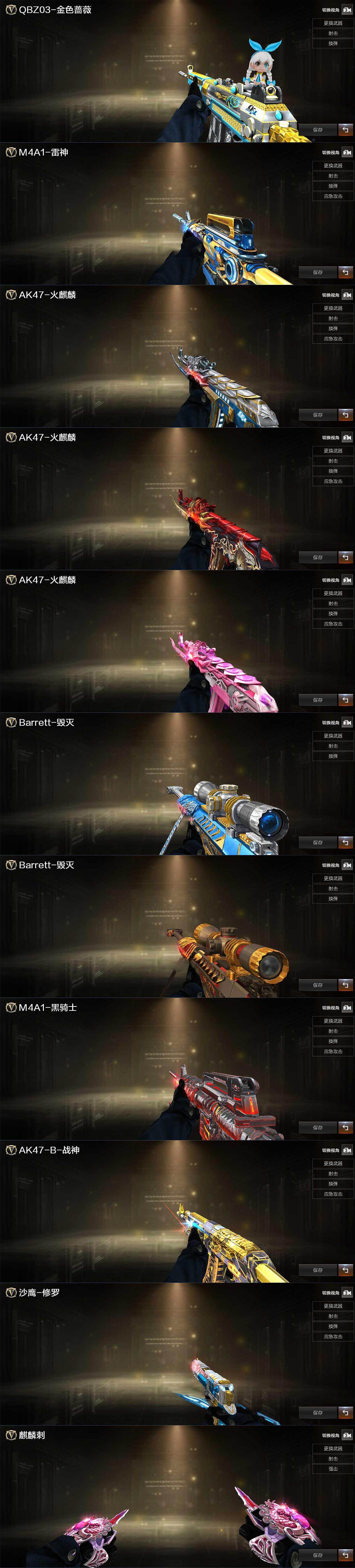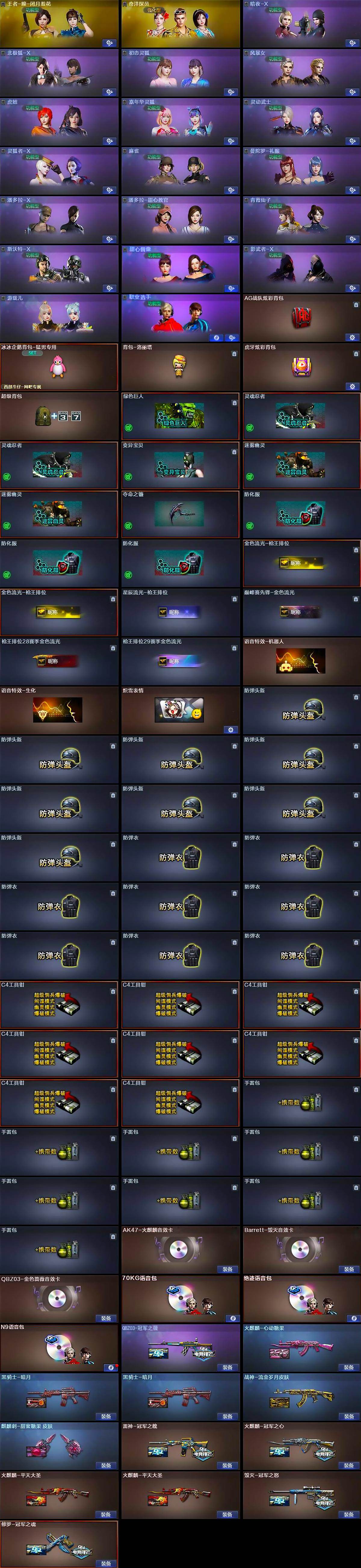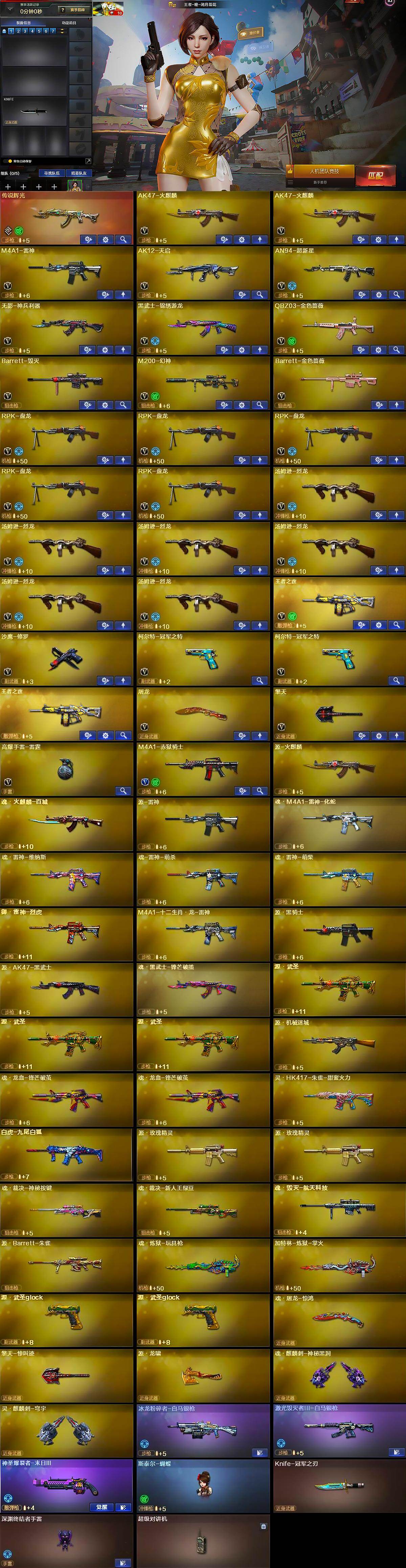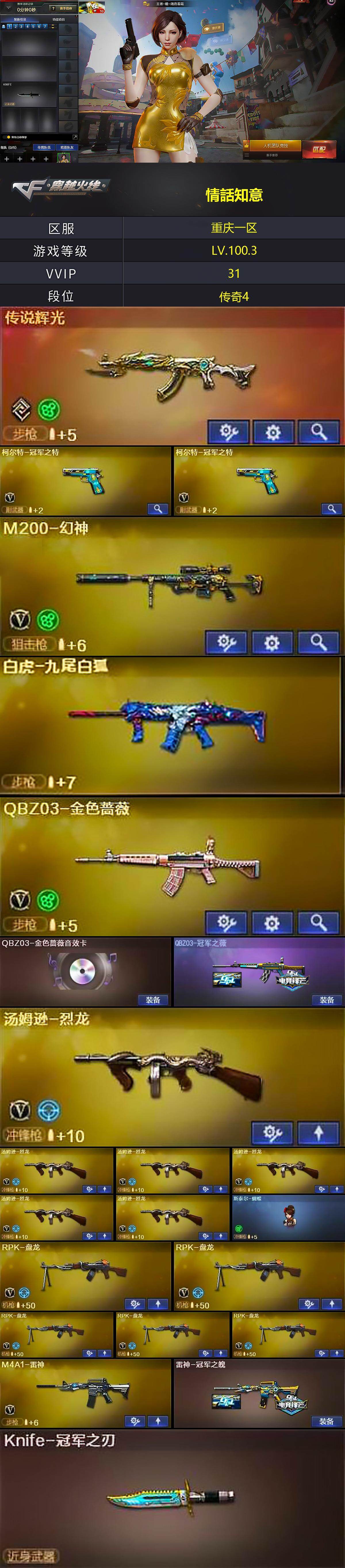 重庆一区-32V-1王者武器数-0炫金武器数【传说武器】:传说辉光【热门武器】:传说辉光,QBZ03-金色蔷薇,M200-幻神,柯尔特-冠军之特*2,汤姆逊-烈龙*6,RPK-盘龙*5,斯泰尔-蝴蝶,羊驼玩偶,沙鹰-修罗,Knife-冠军之刃,黄金猫猫手套-白鲨【王者炫金武器】:王者之霆【音效卡】:AK47-火麒麟音效卡,Barrett-毁灭音效卡,QBZ03-金色蔷薇音效卡,70KG语音包,绝迹语音包,N9语音包【皮肤】:QBZ03-冠军之薇,雷神-冠军之魄,火麒麟-冠军之心,火麒麟-平天大圣