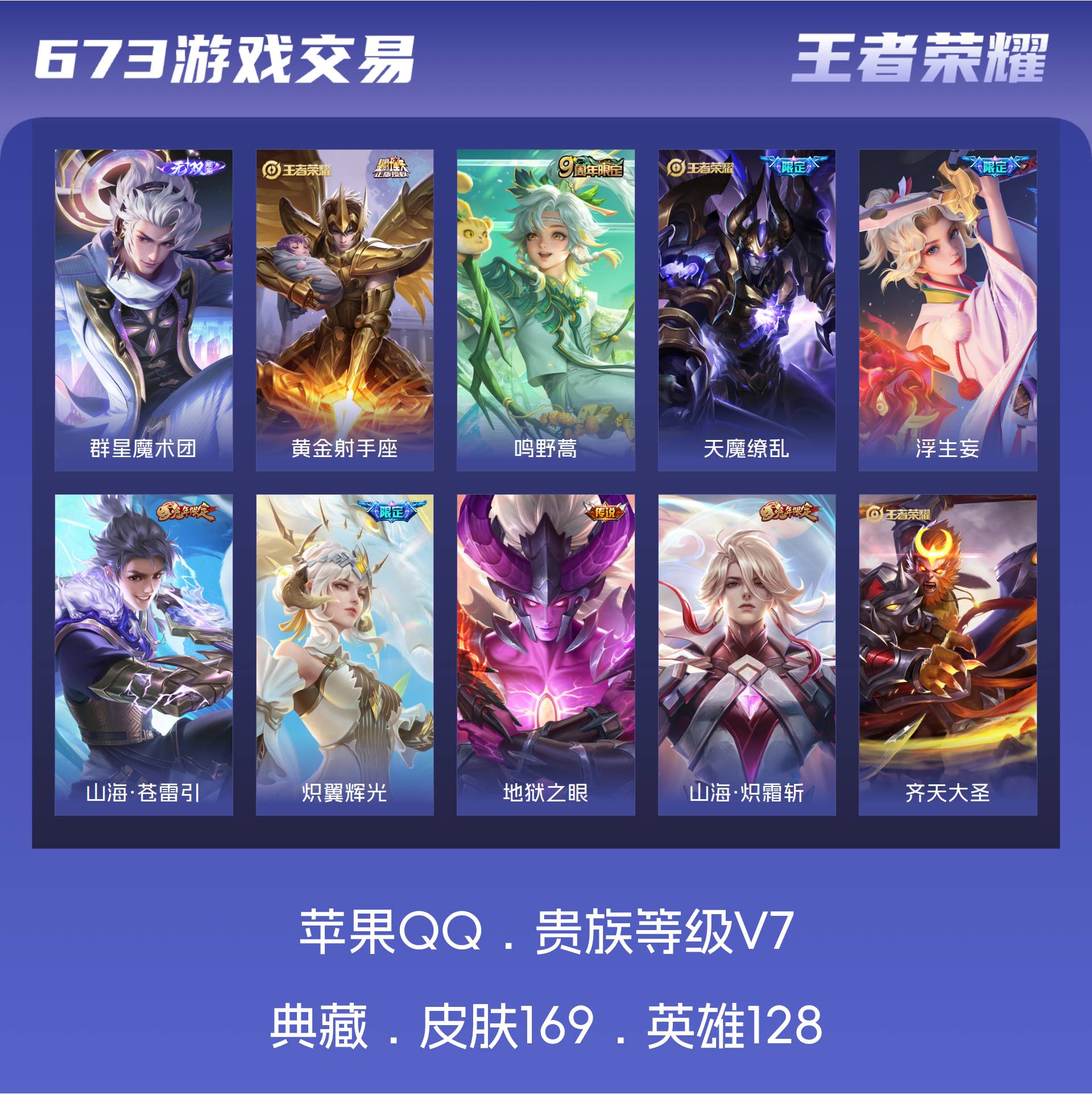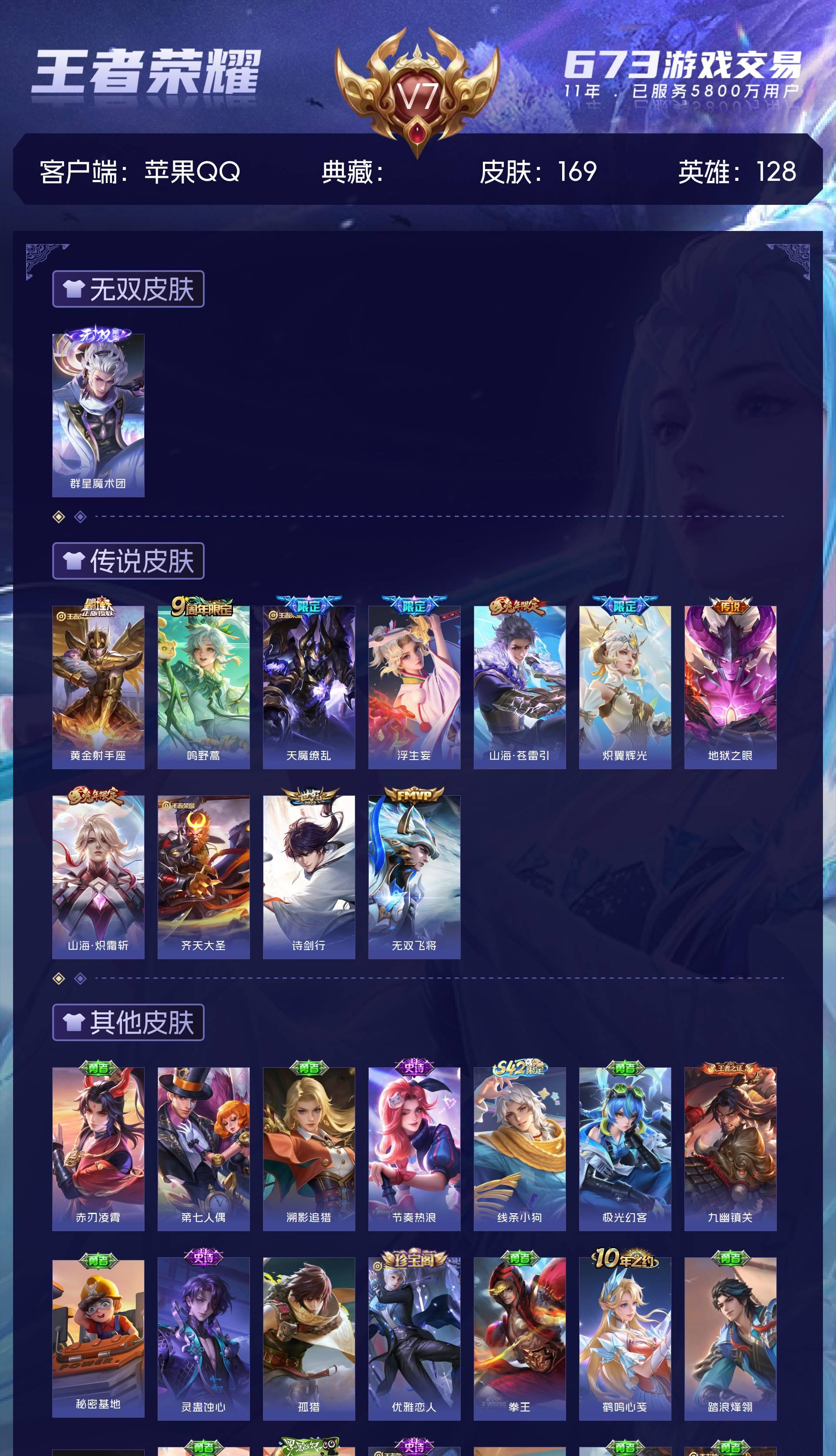 苹果QQ/至尊星耀/169皮肤/128英雄/0典藏/0珍品无双/1无双/0珍品传说/10传说/54史