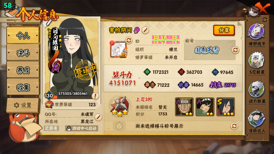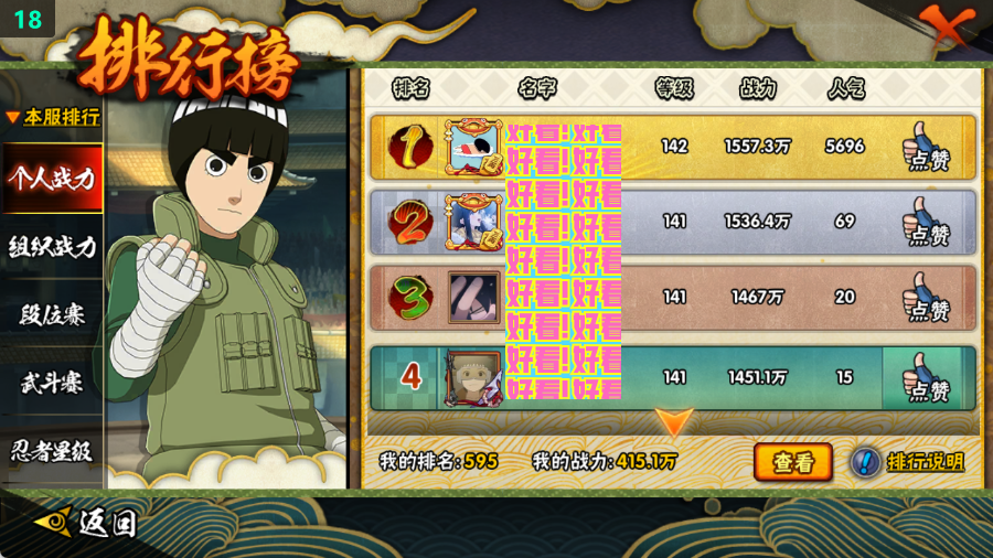 415w战力五影斑+十尾带土8s+妖怪纲手20A战力415账