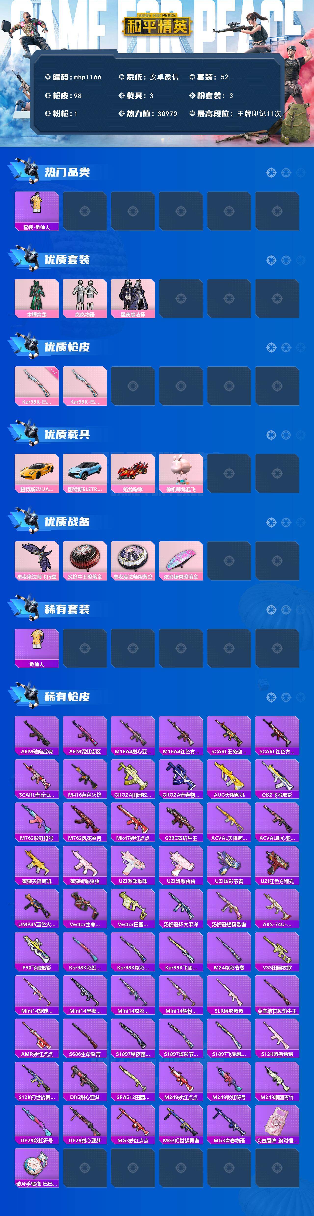 【mhp1166】安卓 微信-3粉装-1特效枪-3载具-1粉色飞行器-30970热力值-11王牌印记-52套装-98枪皮