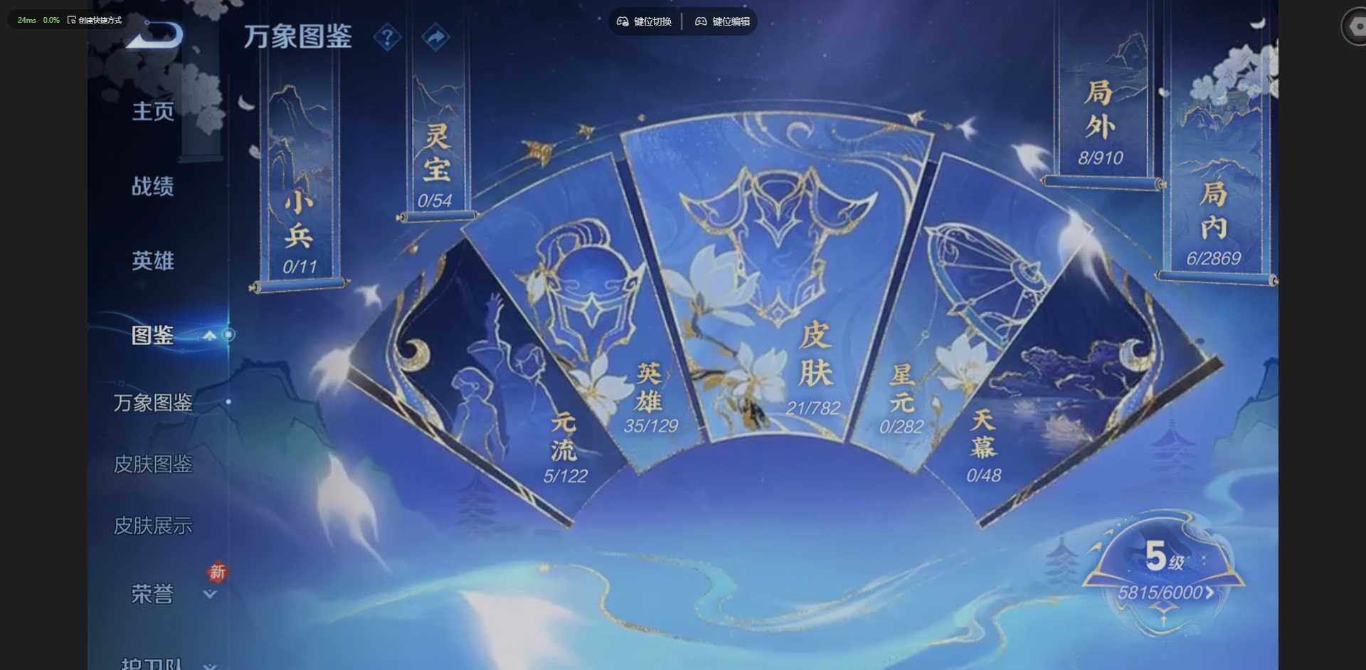 贵族等级: V5 英雄数: 35 皮肤数: 21 传说皮: 落雪白狼,神骥·赴