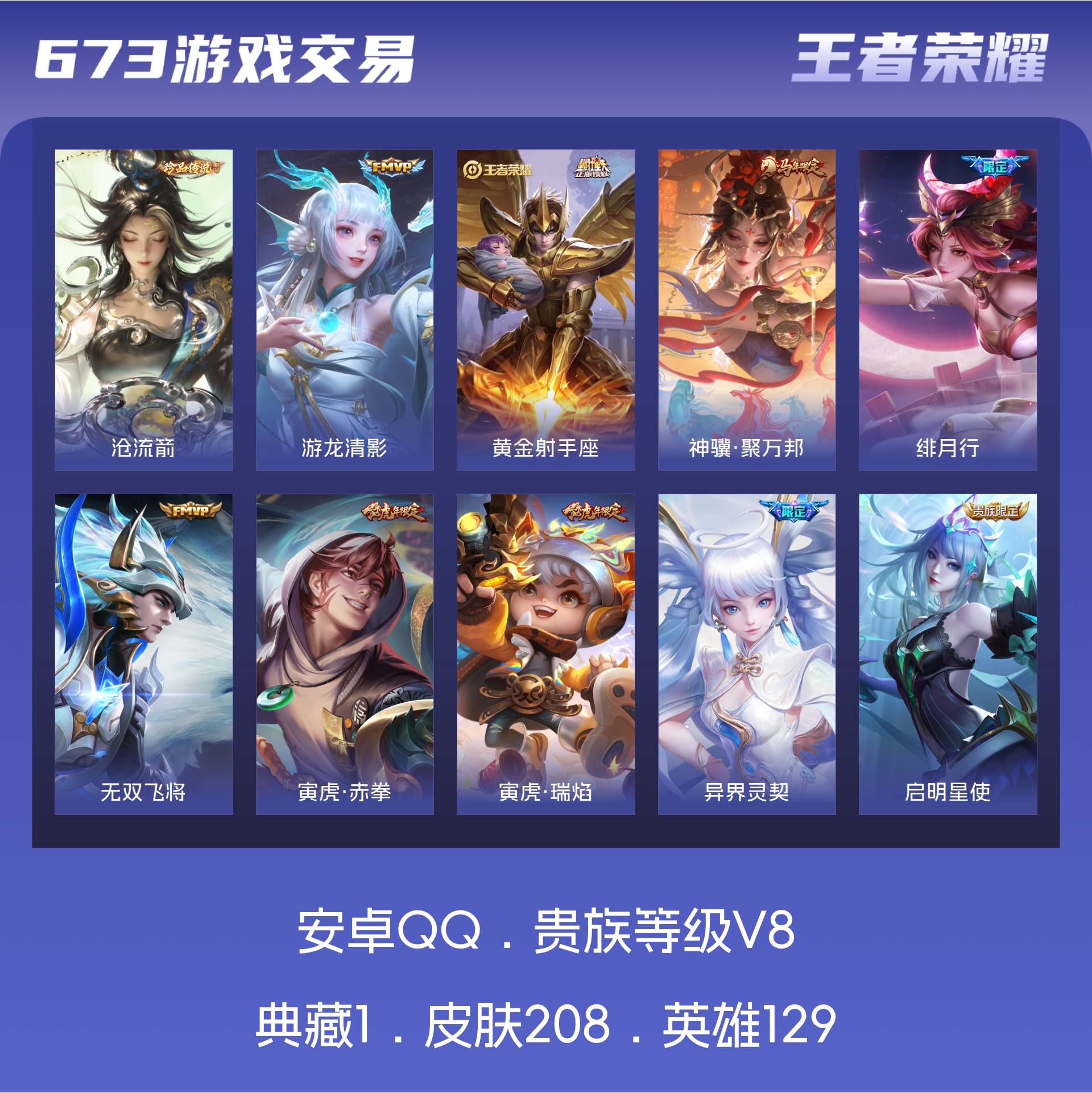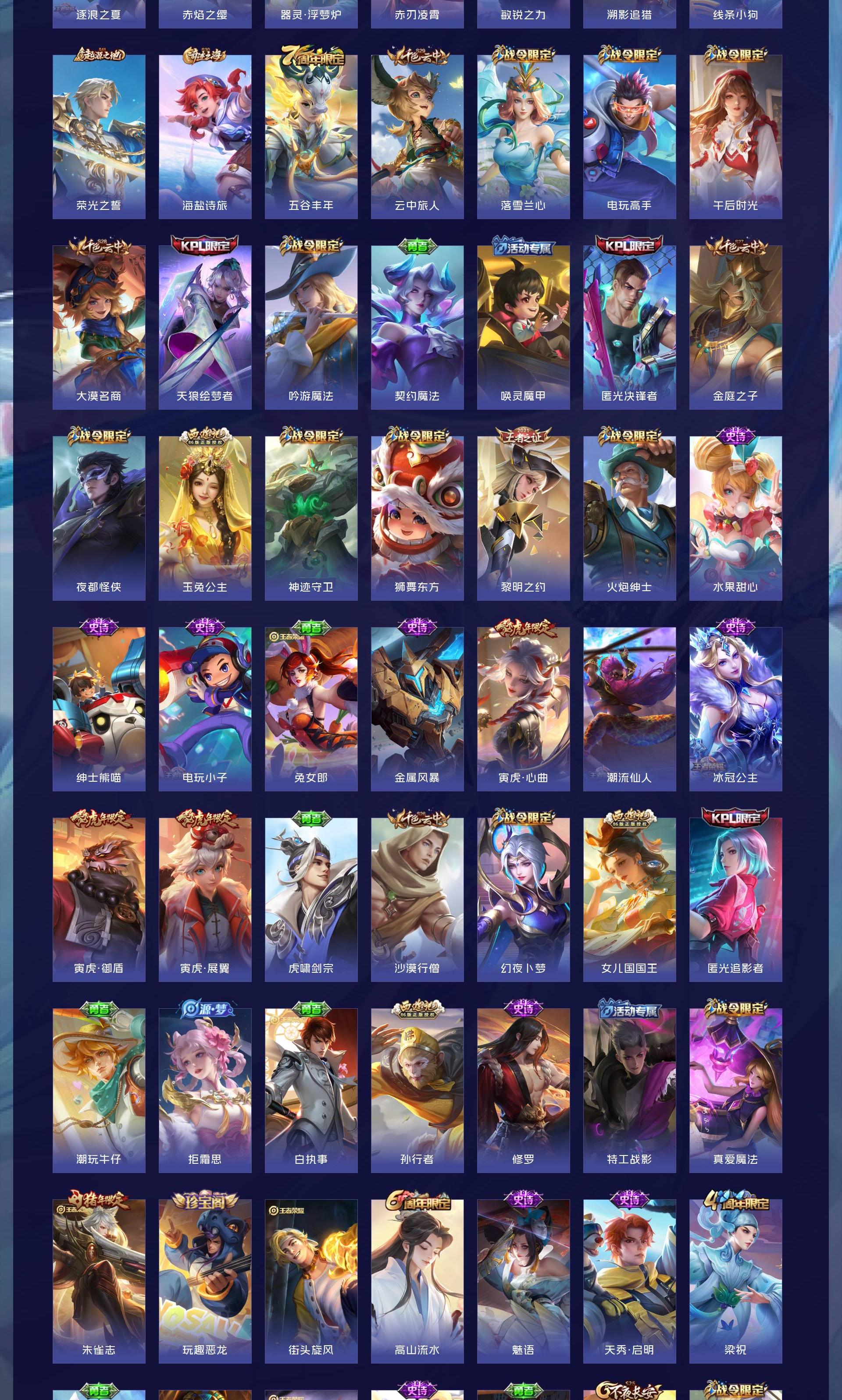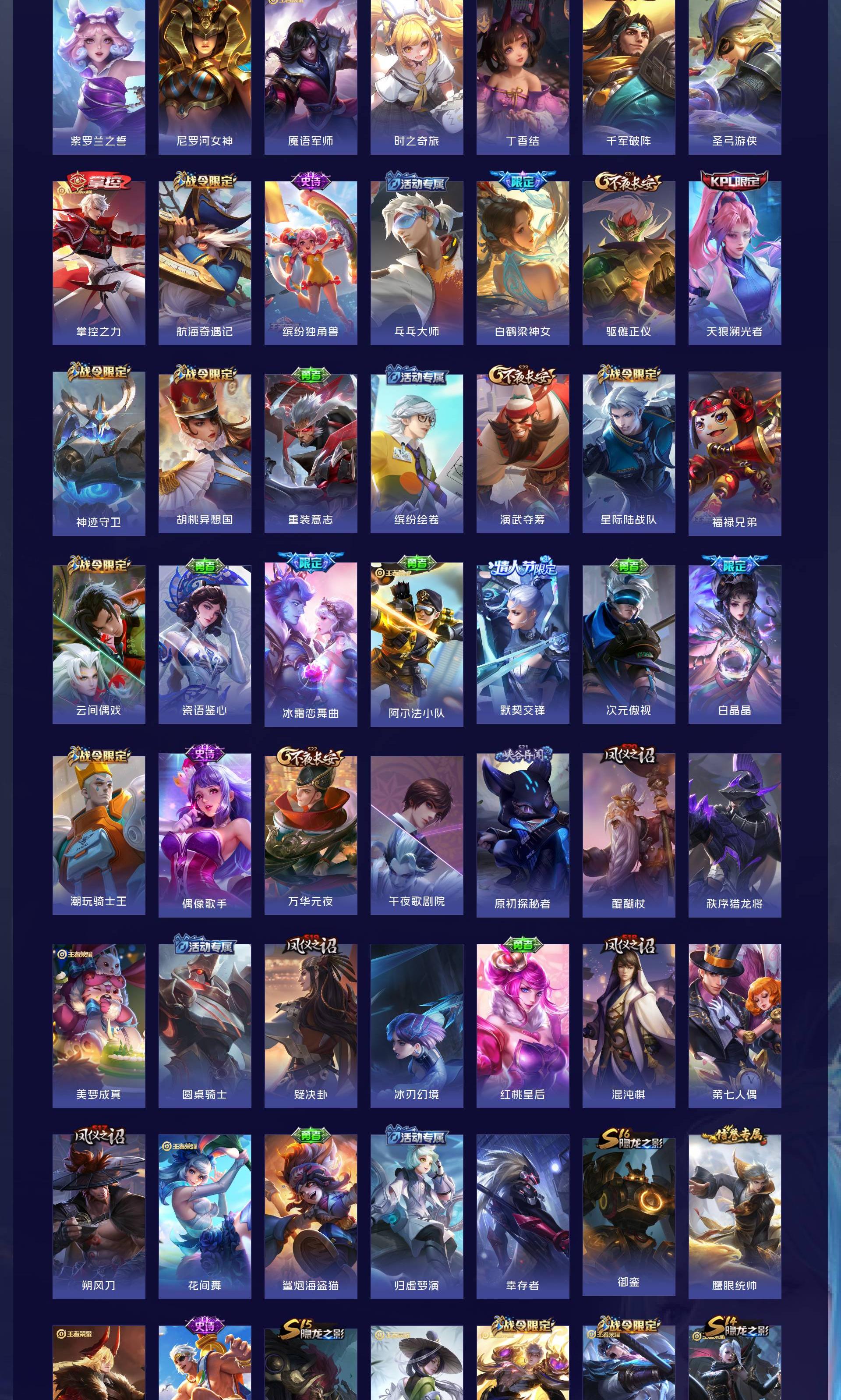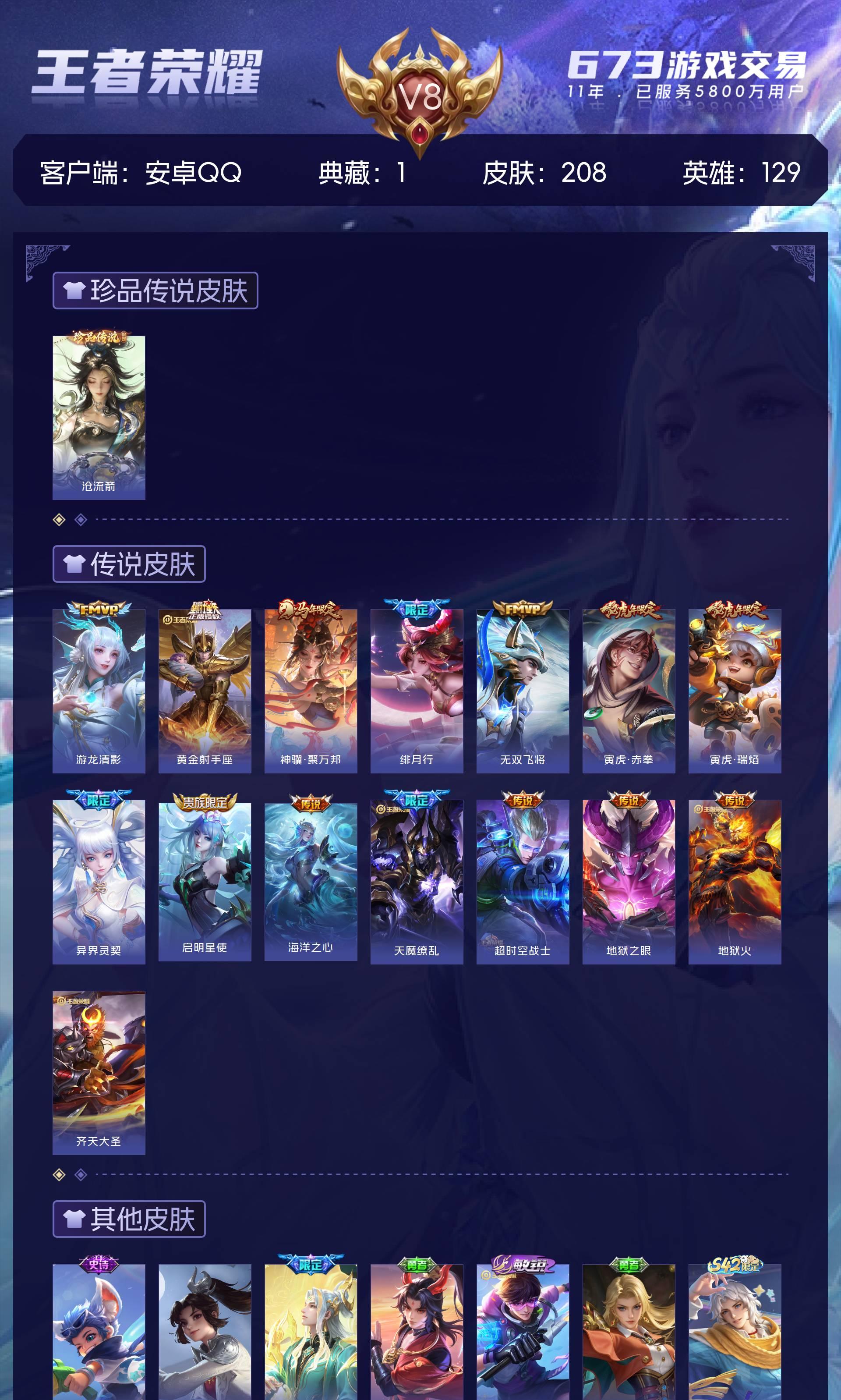 V8 皮肤208 英雄129 无双王者 荣耀典藏1 珍品传说1 传说15 其他皮肤199