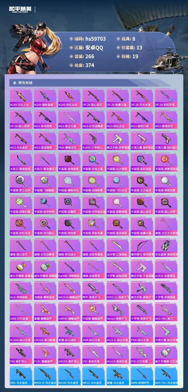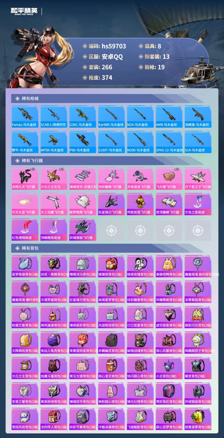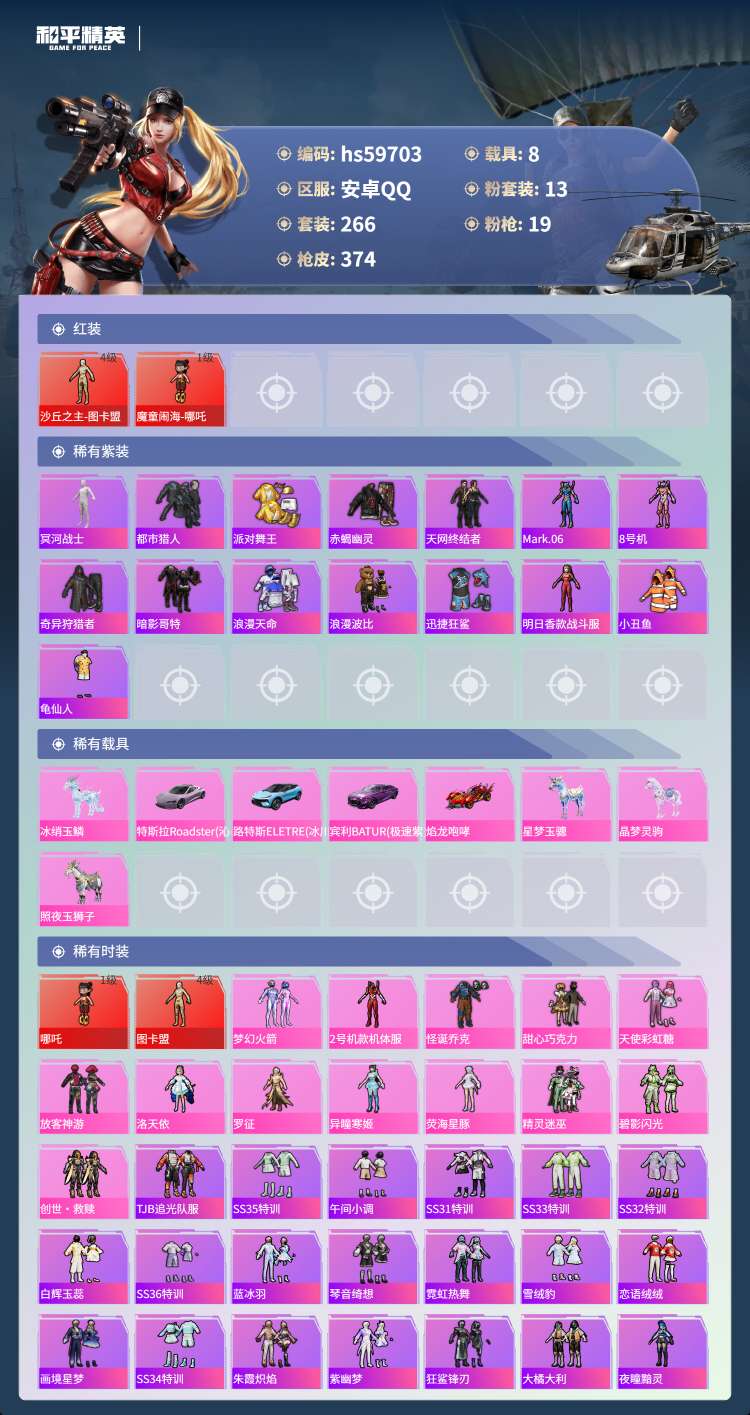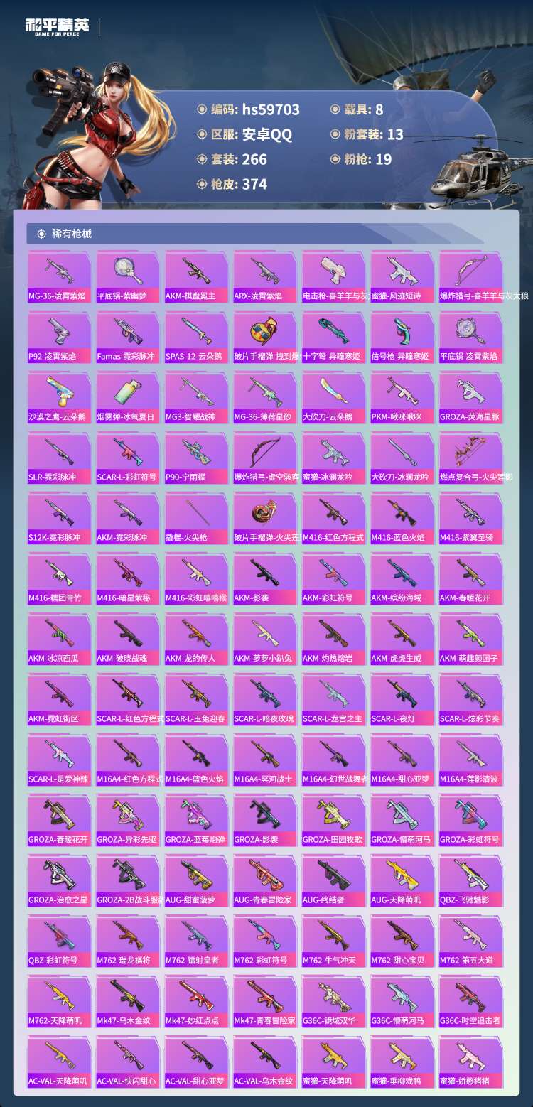 hs59703 安卓手Q-19王牌印记-有战神框-2红装-13粉装-19特效枪-8载具-131002