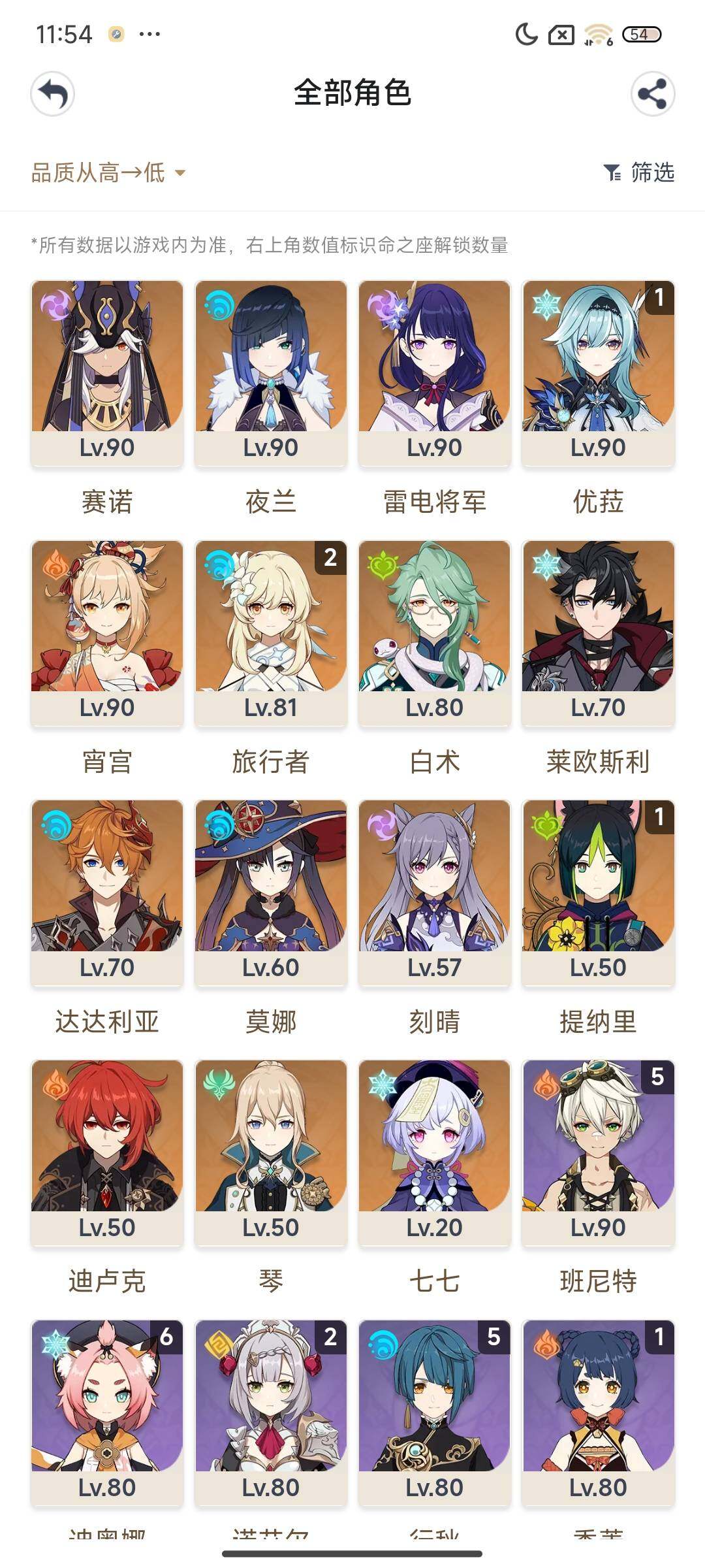 【YSN2454】57级/女主/15个五星角色/莱欧斯利/白术/赛诺/1命提纳里/夜兰/雷电将军/宵宫/1命优菈/达达利亚/琴/刻晴/迪卢克/莫娜/七七/风鹰剑/天空之翼/0命伊安珊/3命琳妮特/1命绮良良/1命米卡/2命瑶瑶/2命珐露珊/莱依拉/5命坎蒂丝/3命多莉/满命柯莱/鹿野院平藏/2命久岐忍/5命云堇/1命五郎/4命托马/1命九条裟罗/0命早柚/3命烟绯/1命罗莎莉亚/5命辛焱/满命迪奥娜/2命砂糖/雷泽/4命菲谢尔/0命丽莎/3命北斗/1命香菱/1命安柏/5命班尼特/5命行秋/满命芭