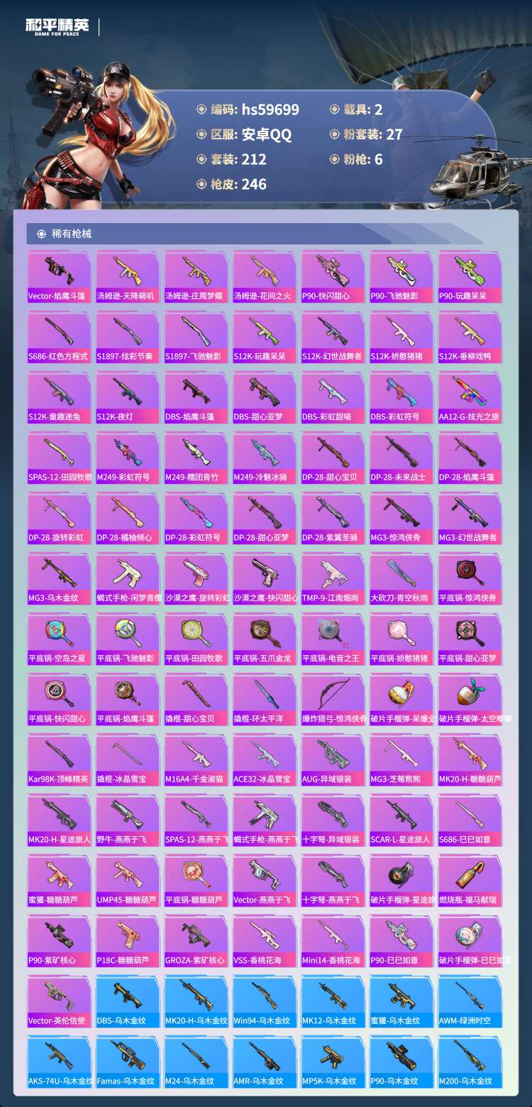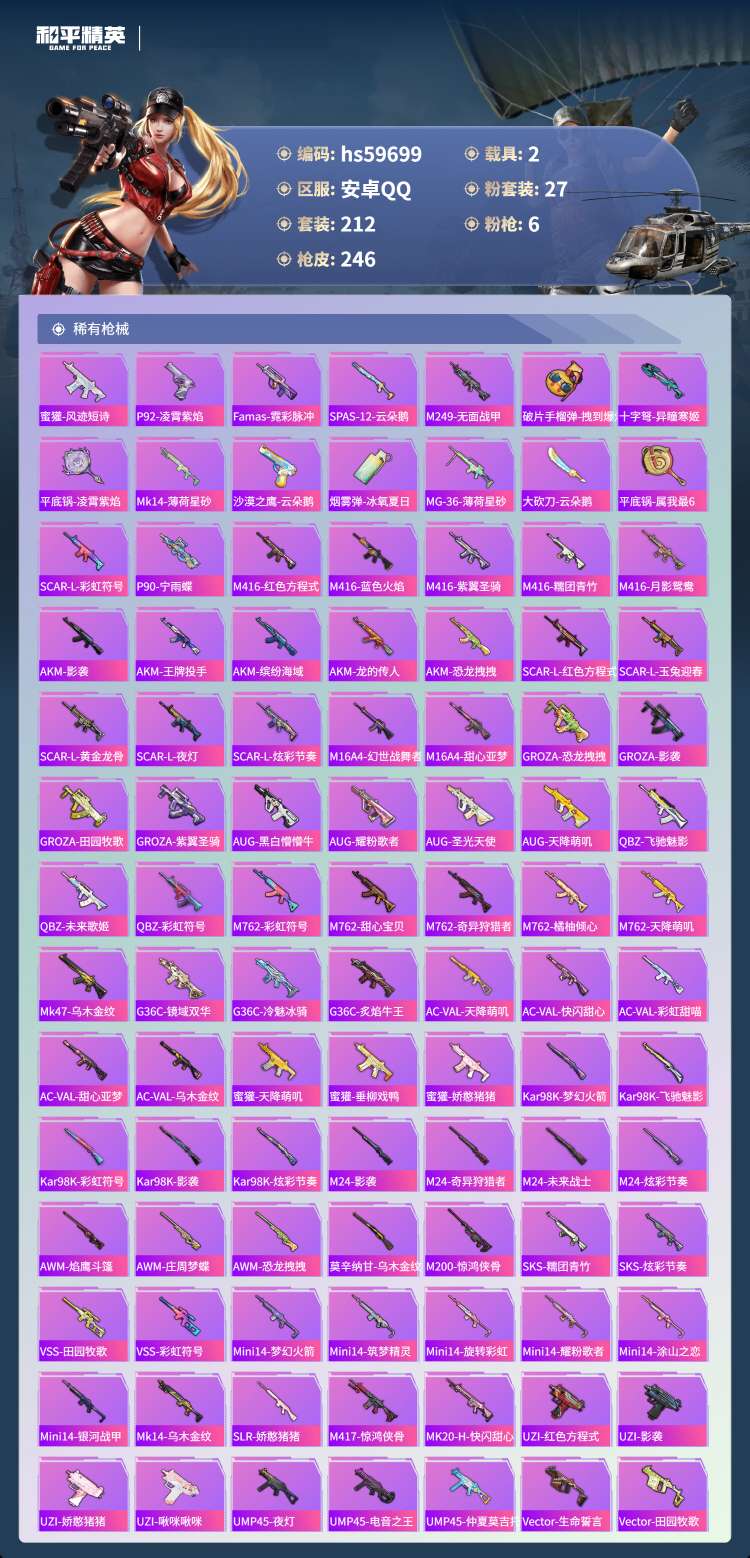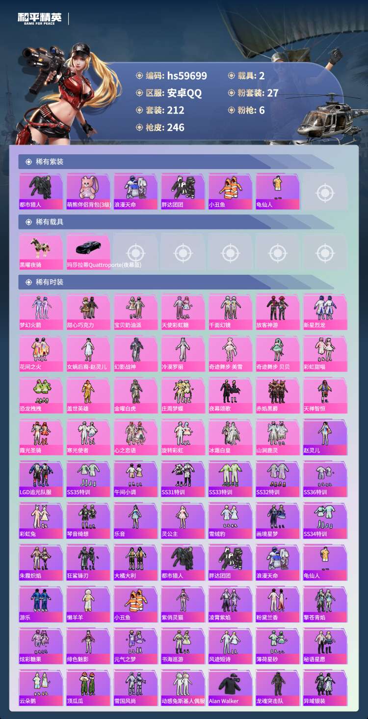 hs59699 安卓手Q-15王牌印记-27粉装-6特效枪-2载具-91552热力值-212套装-2