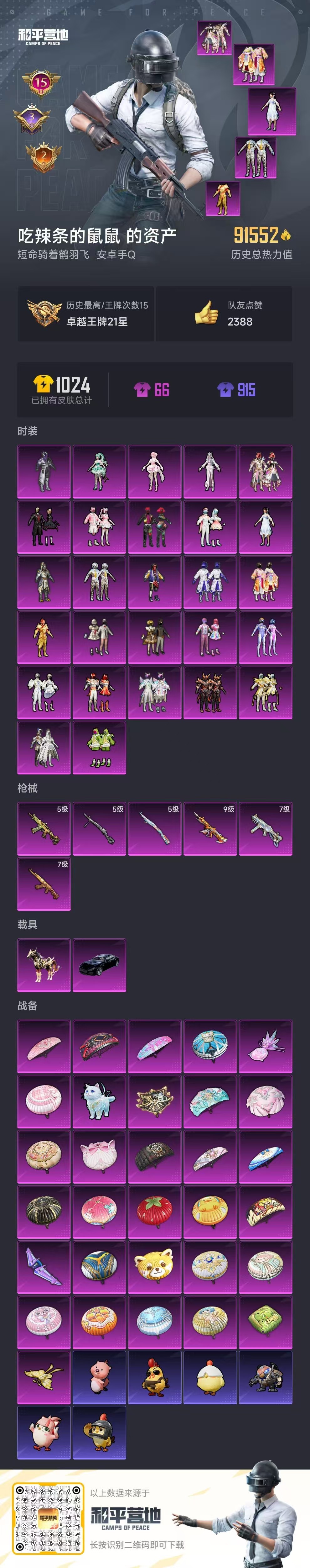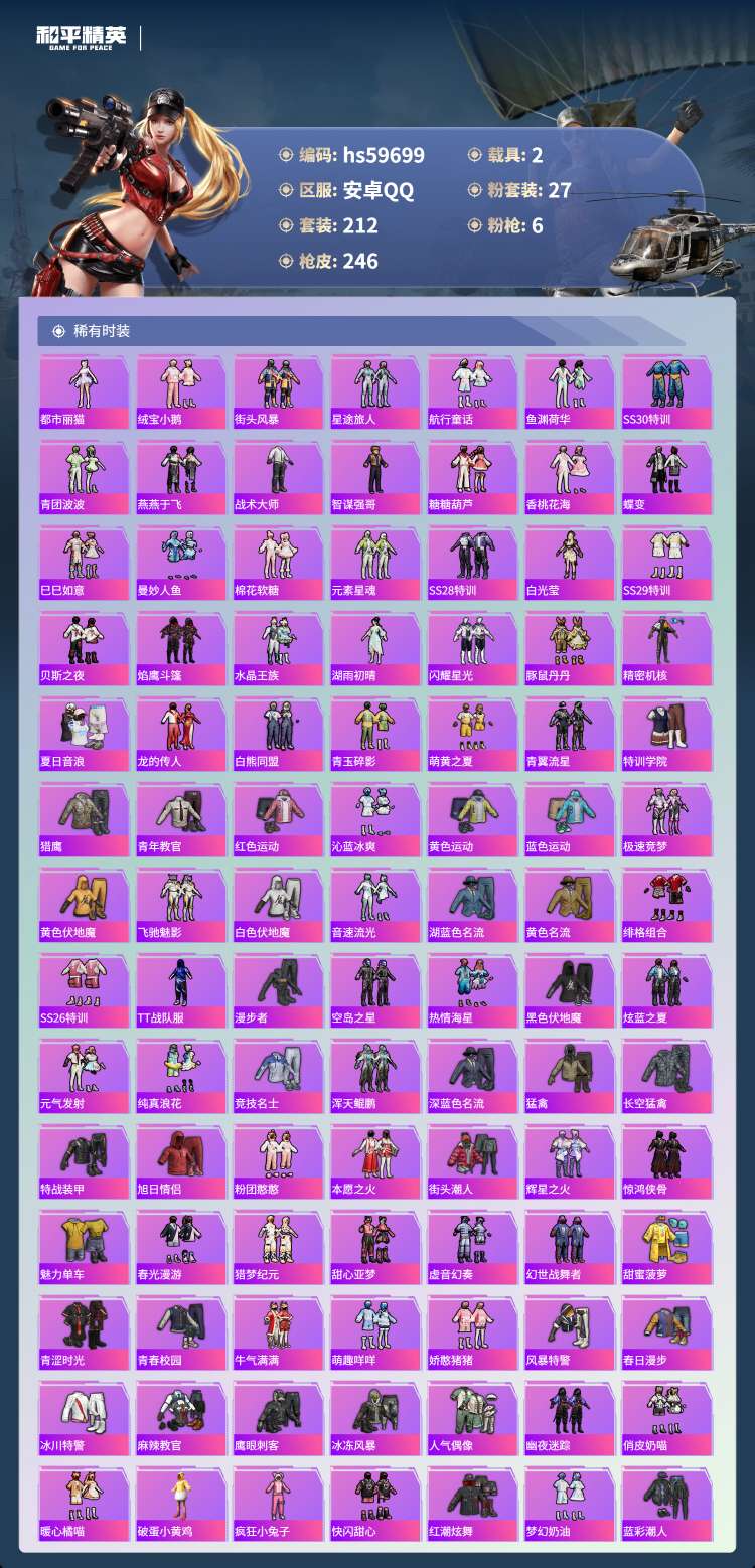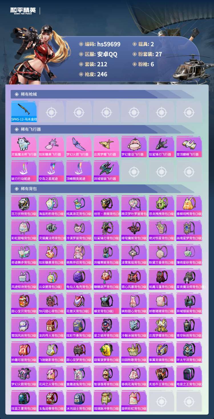 hs59699 安卓手Q-15王牌印记-27粉装-6特效枪-2载具-91552热力值-212套装-2