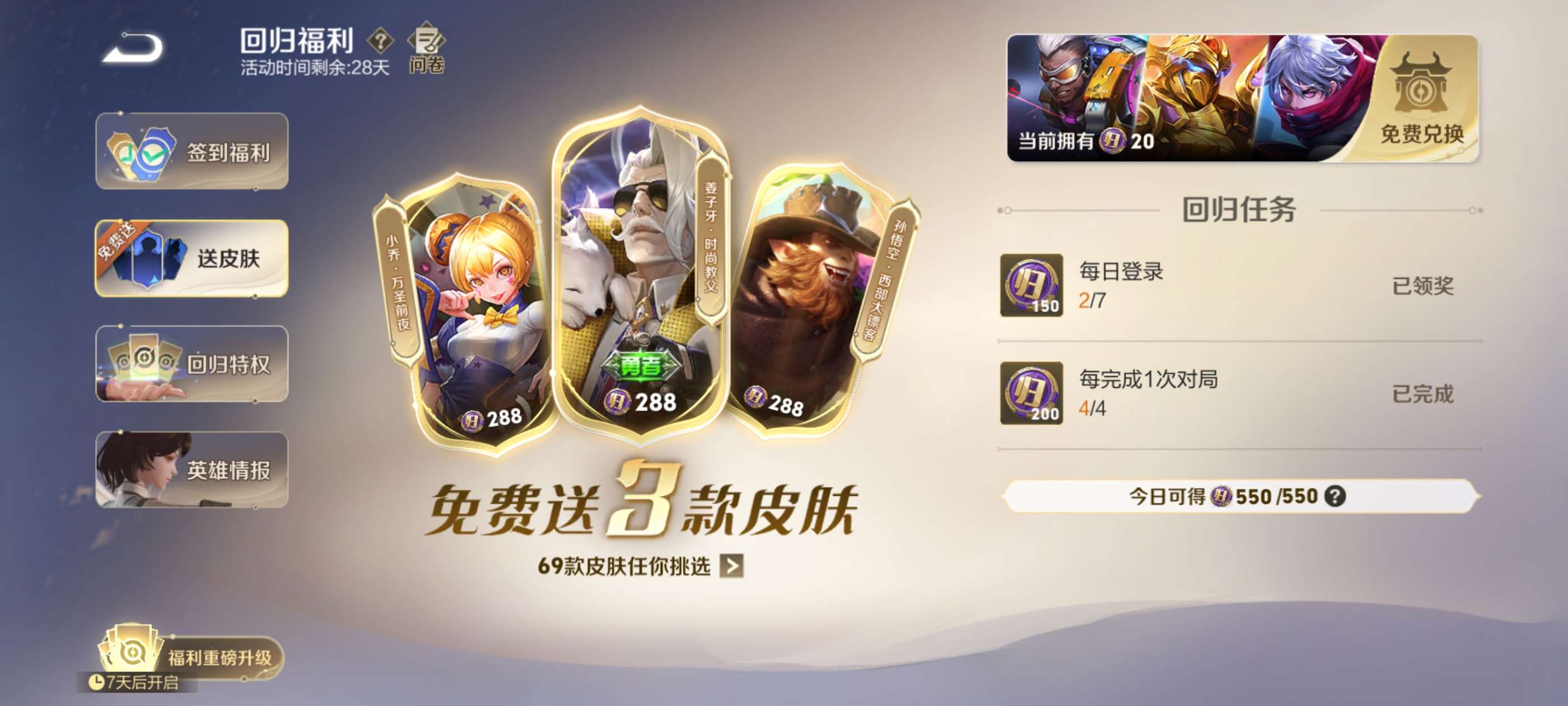 回归号可以领取3皮肤,各种福利皮肤