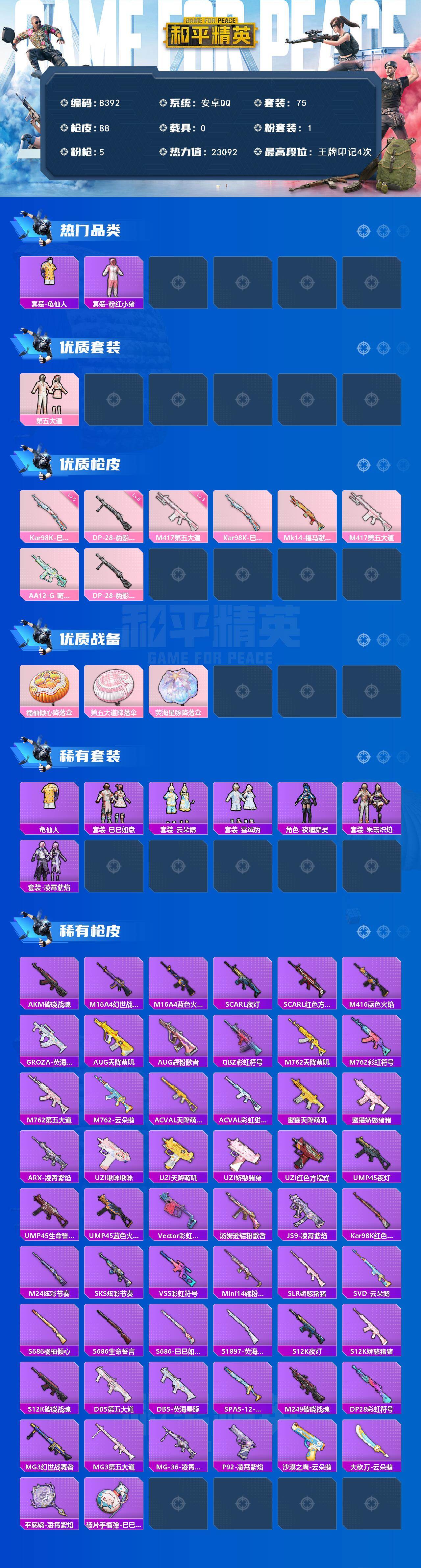 【8392】1粉装-5特效枪-0载具-0粉色飞行器-23092热力值-4王牌印记-75套装-88枪皮
