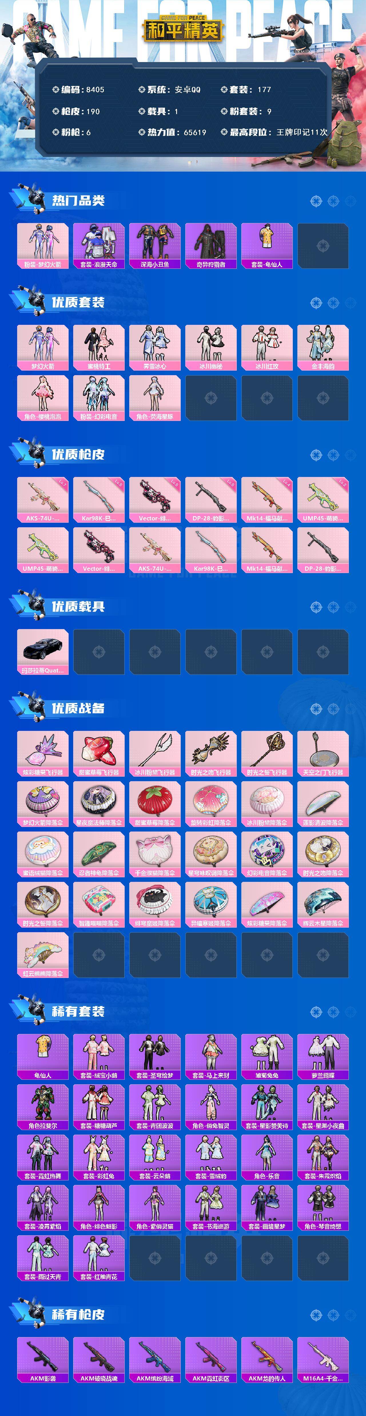 【8405】9粉装-6特效枪-1载具-6粉色飞行器-65619热力值-11王牌印记-177套装-190枪皮