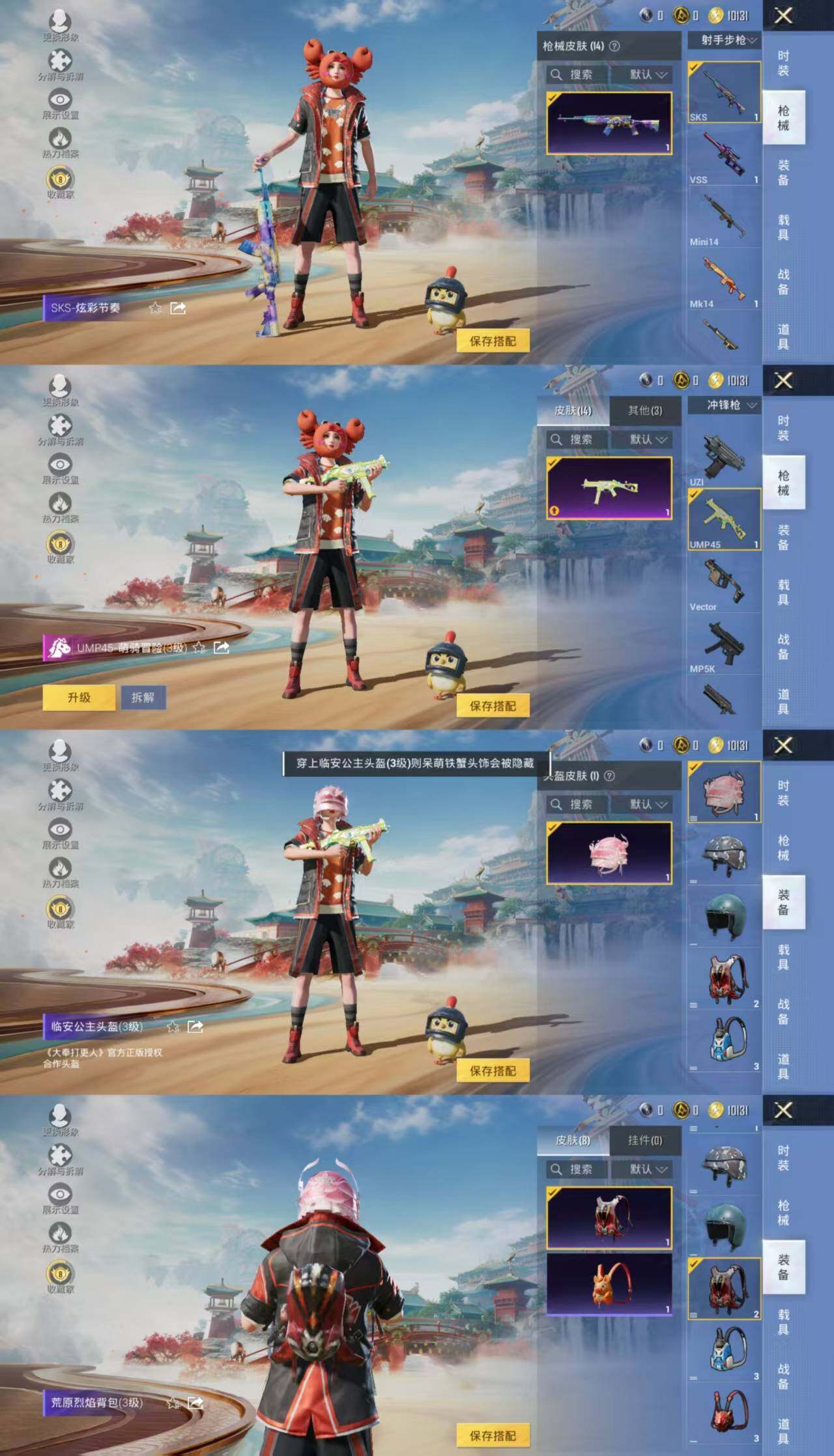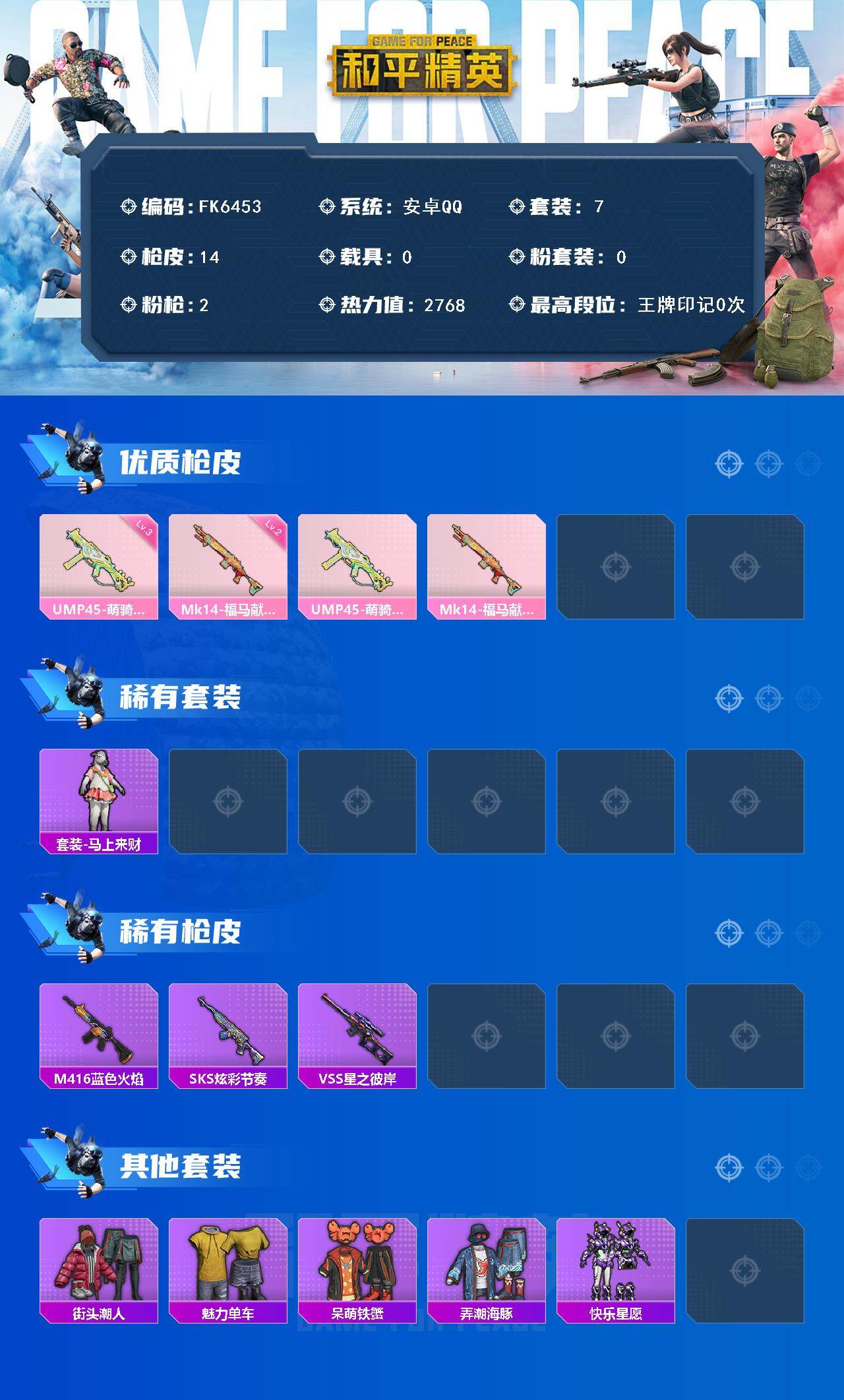 【FK6453】7套装/枪械2/装备9/战备16/热力值2768/三级UMP45-萌骑冒险/二级Mk14-福马献瑞/UMP45-萌骑冒险/Mk14-福马献瑞/套装-马上来财/M416-蓝色火焰/SKS-炫彩节奏/VSS-星之彼岸/街头潮人/魅力单车/呆萌铁蟹/弄潮海豚/快乐星愿