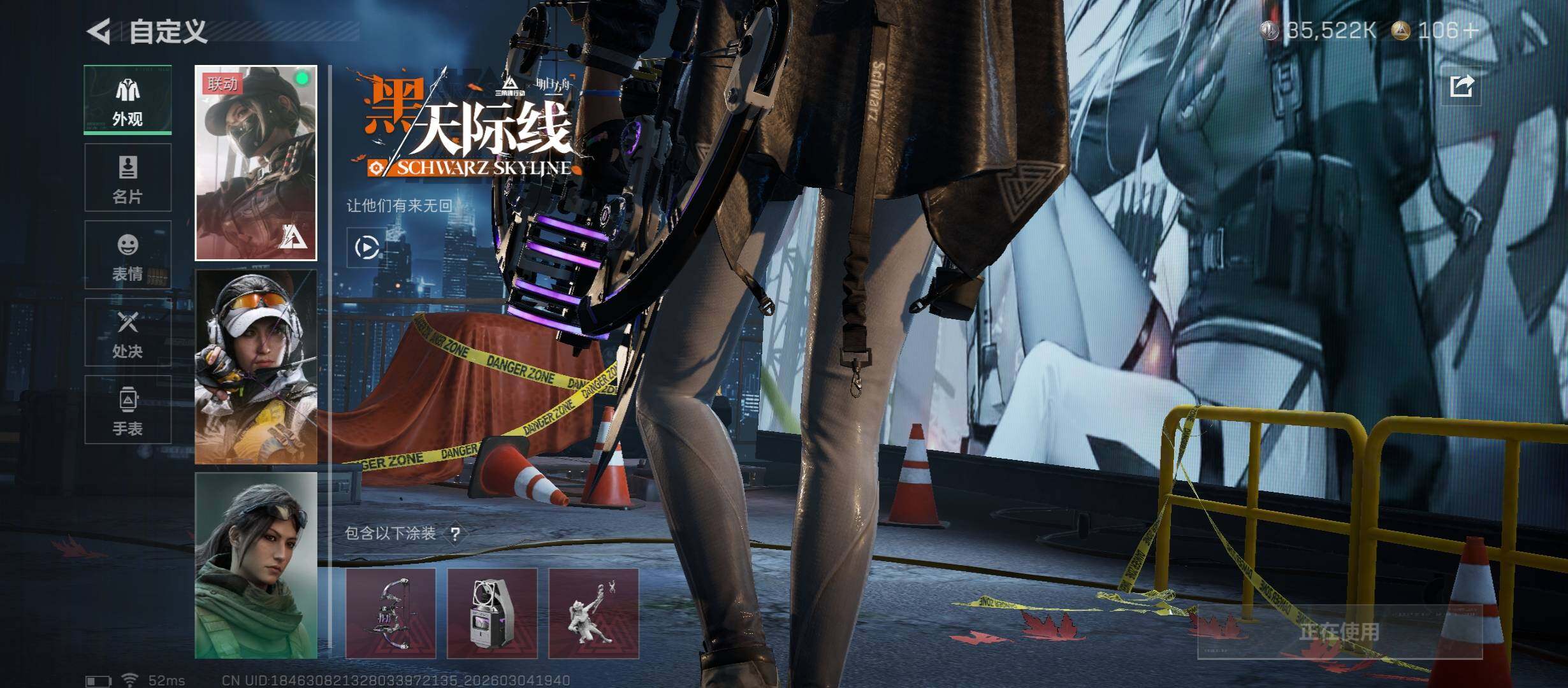 【干员外观】:红狼-蚀金玫瑰,骇爪-水墨云图,露娜-黑·天际线,威龙-壮志凌云,蜂医-送葬人·无题密令,无名-夜鹰,深蓝-不破誓约,红狼-电锯惊魂,露娜-金牌射手,乌鲁鲁-