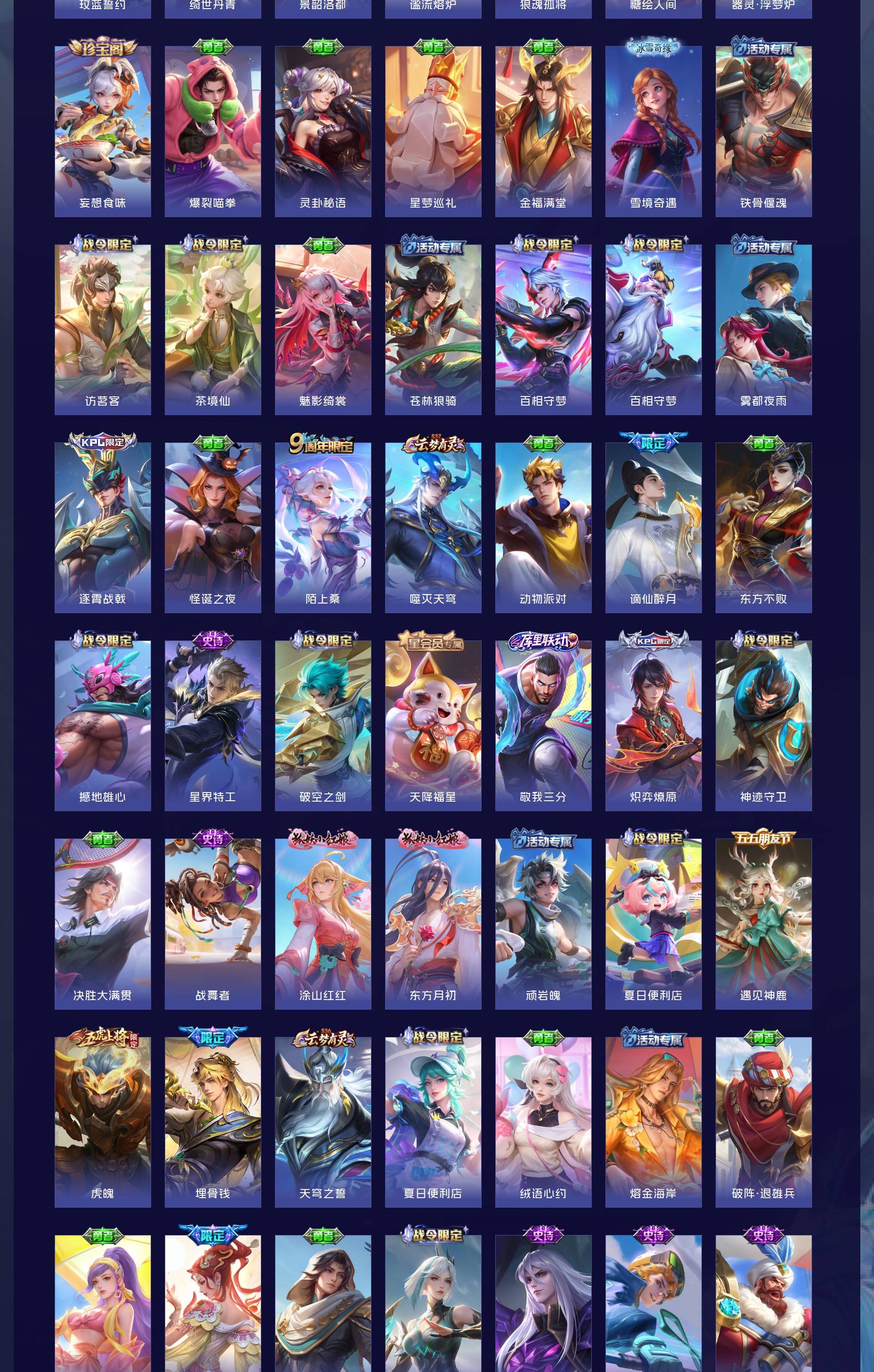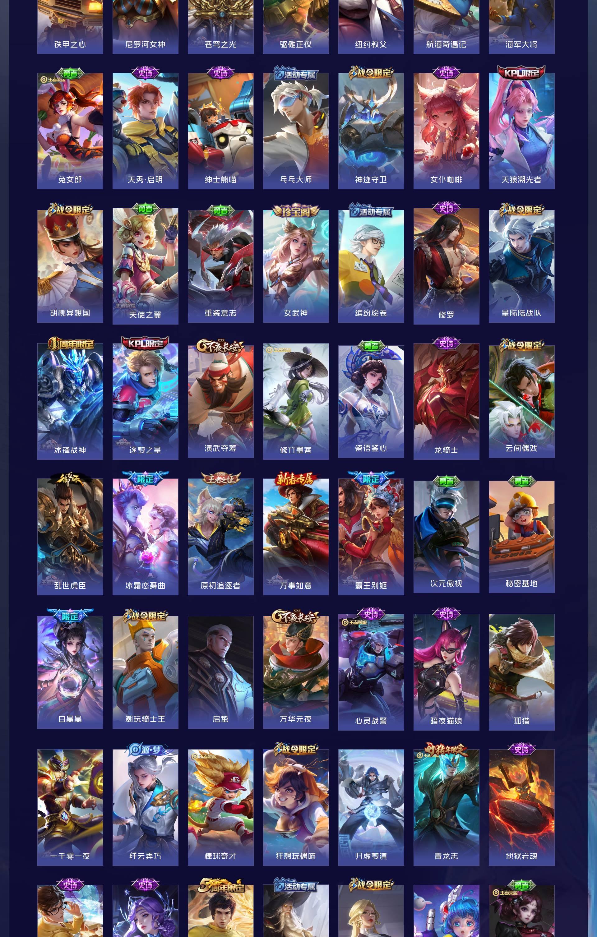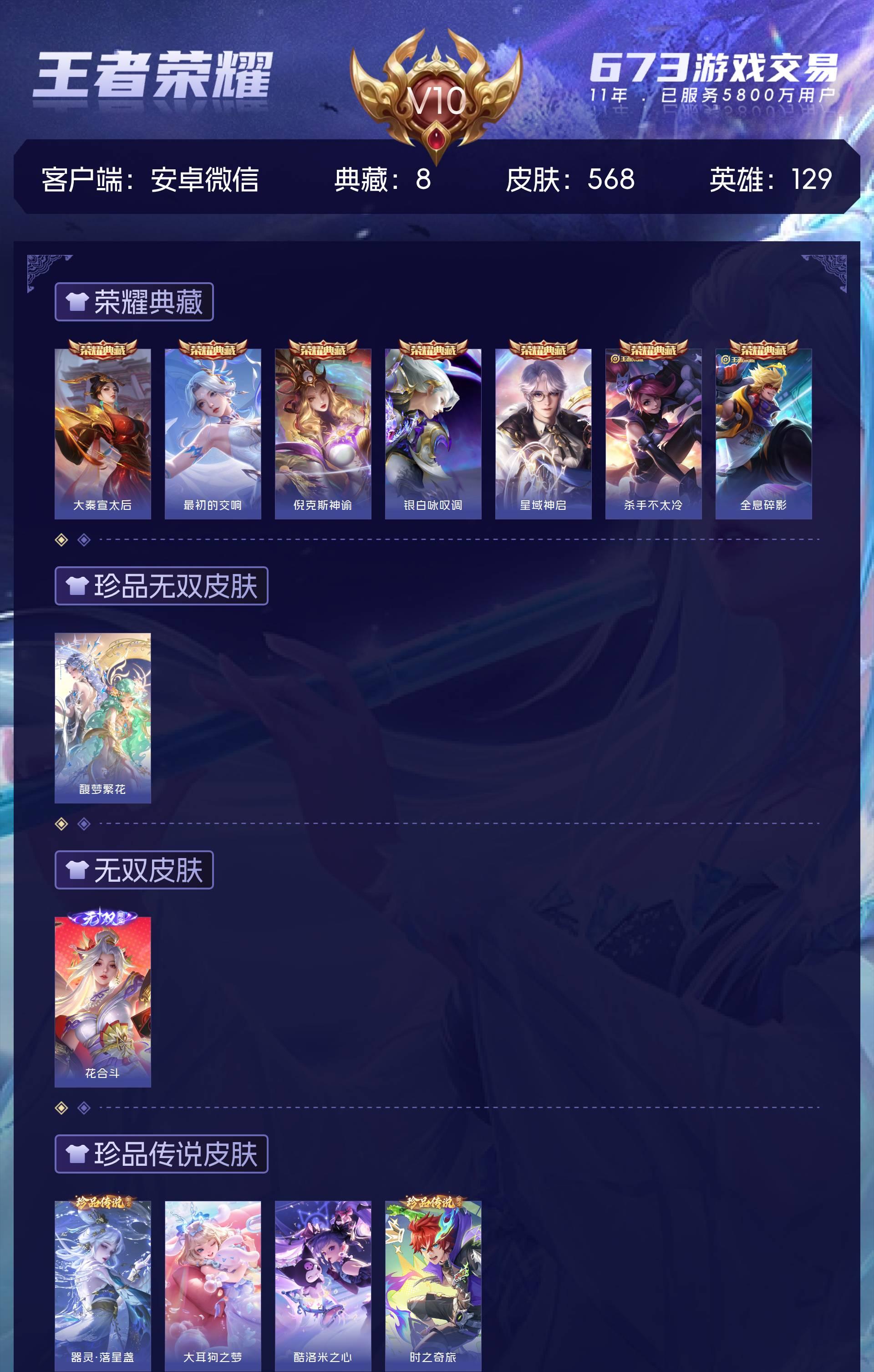 V10 皮肤568 英雄129 无双王者 荣耀典藏8 珍品无双1 无双皮肤1 珍品传说4 星传说8 传说69 其他皮肤493