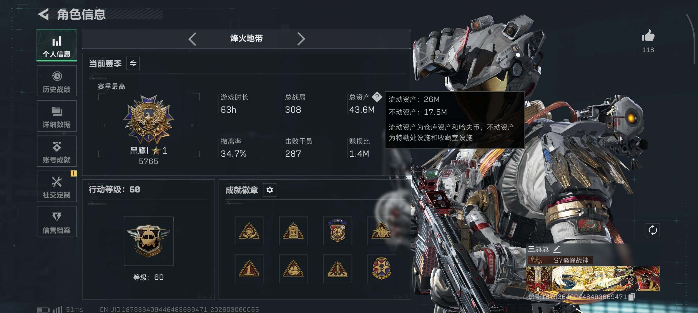 43m总资产-1519k哈伏币-60烽火等级-黑鹰-1战场等级-无军衔