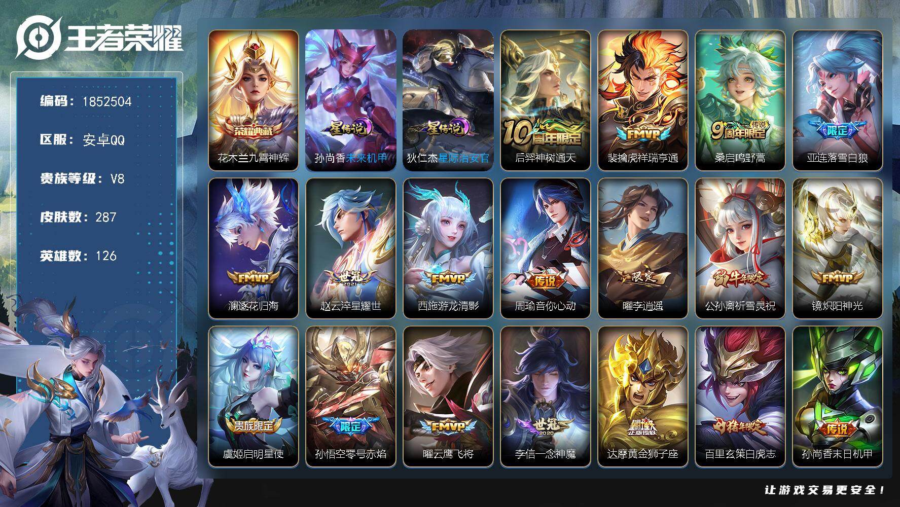 W14875,,可立即换绑无需挂单养号,,钱包注销不了,,,铭文满级,,典藏1,,传说21,,,星传说2,,,按键5,,,天幕2,,,夺宝63,,安卓Q-V8-最强王者段位-126英雄-287皮肤-1典藏皮肤-21传说-97史诗
