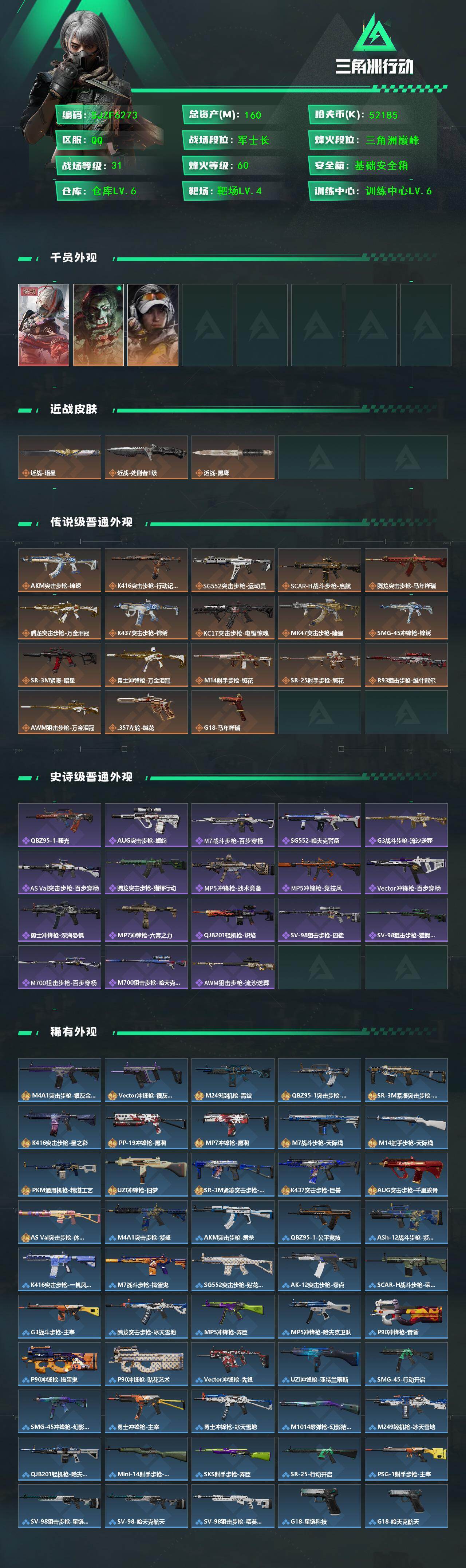 总资产(M):160M/哈夫币(K):52185K/传说枪皮数:18/全面战场等级:31_段位:军士长/烽火地带等级:60_段位:三角洲巅峰/