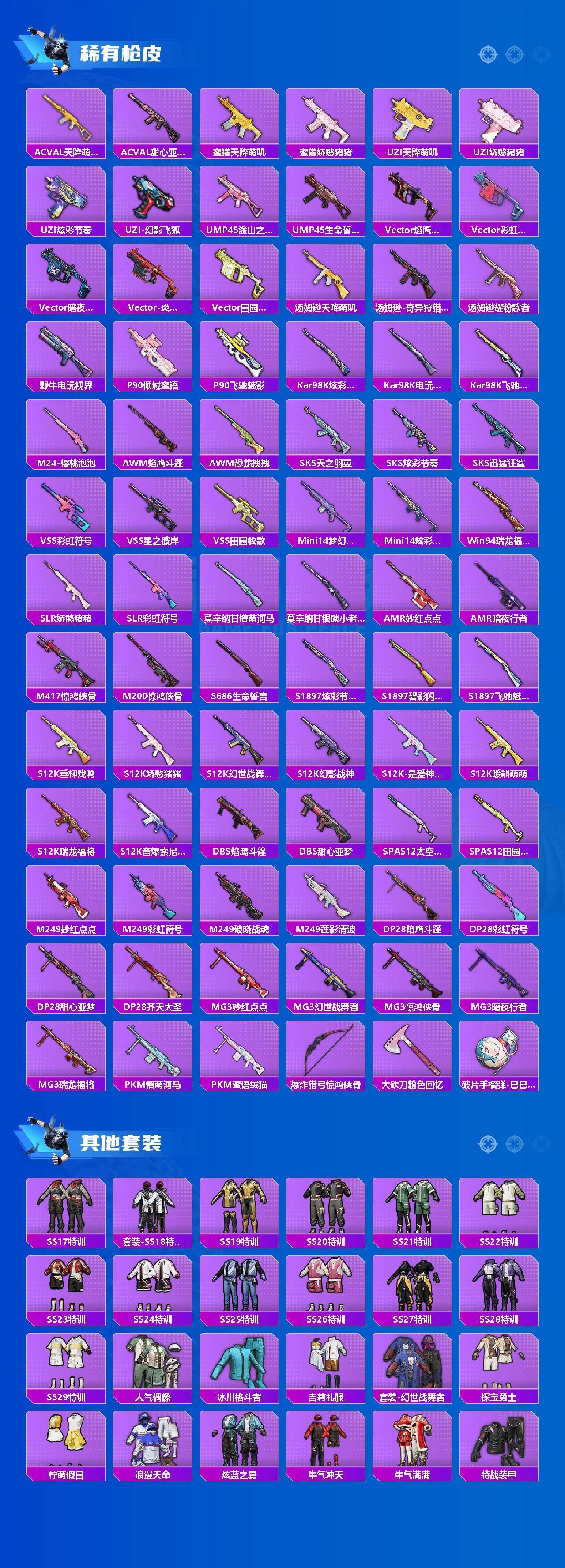 【粉色枪皮等级】:AKM-星际浪客(七级),UMP45-萌骑冒险(四级),Kar98K-巳巳如意(五级),DP-28-豹影疾电(五级)