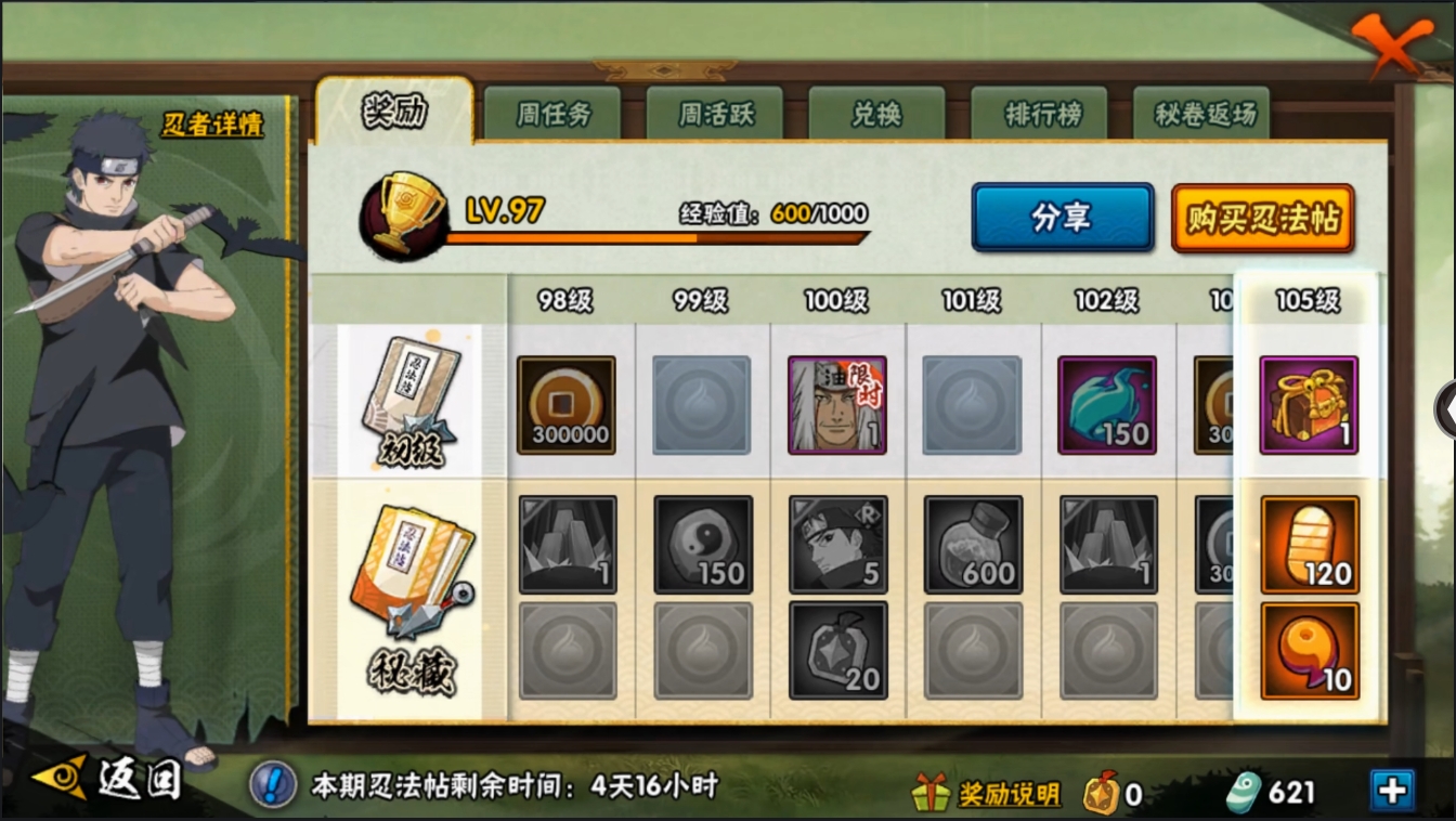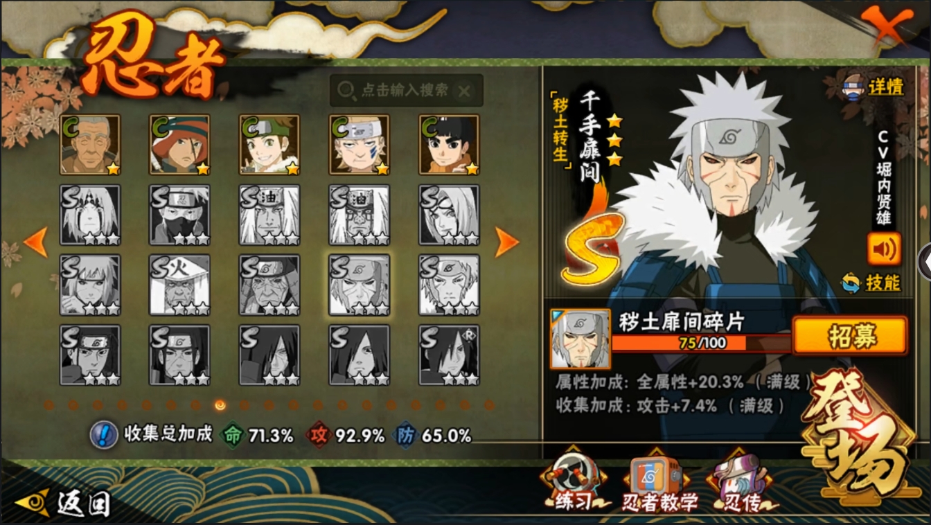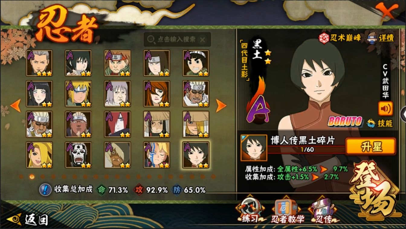 【编号06513】店长推荐特价处理精品号15S级忍者数-25A级忍者数【S级忍者】:宇智波斑「秽土转生·解」(3星),宇智波带土「忍界大战」(3星),艾「忍界大战」(3星),千手柱间「木叶创立」(3星),自来也「舞之豪杰」(3星),大蛇丸(3星),纲手(3星),波风水门(3星),药师兜「仙人模式」(3星),神秘面具男(3星),漩涡鸣人「九喇嘛连结」(3星),迈特凯「死门」(3星),佩恩「天道」(3星),宇智波佐助「永恒万花筒」(3星),大筒木桃式(3星)【A级忍者】:艾「青年」(2星),长门「青