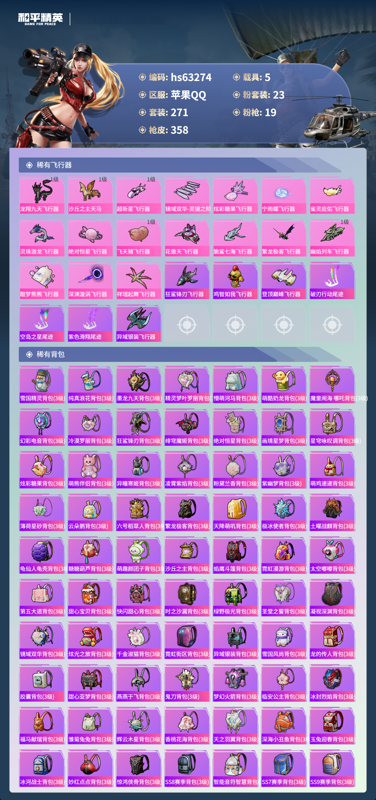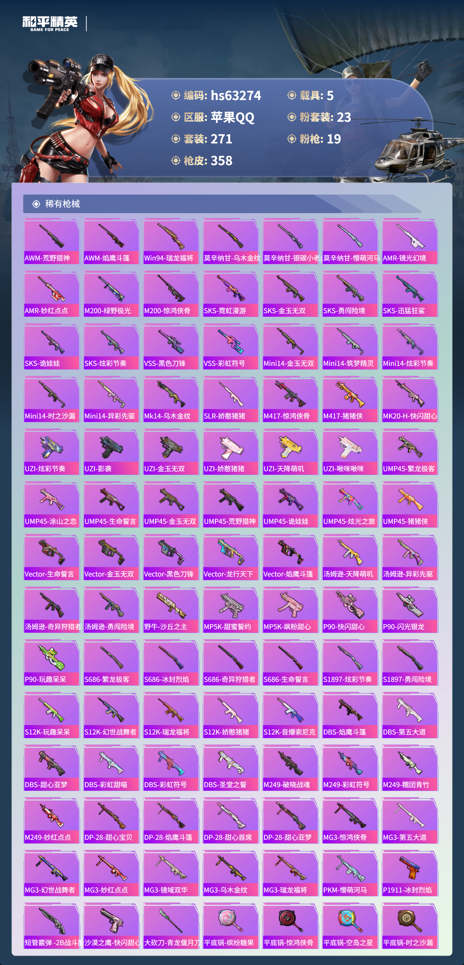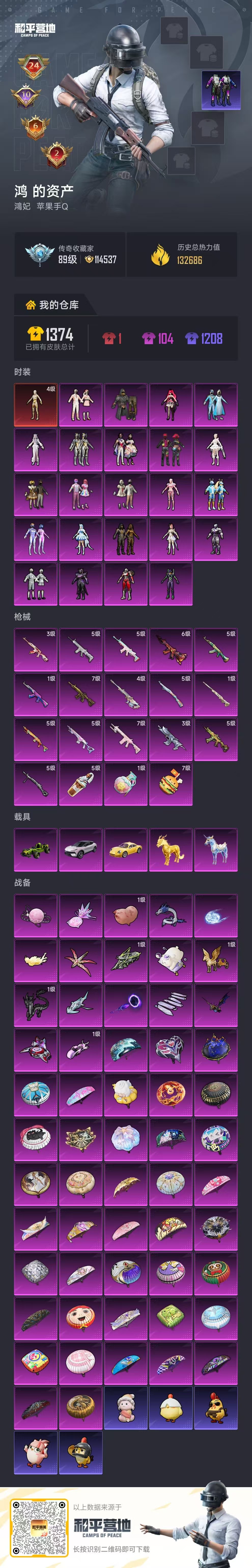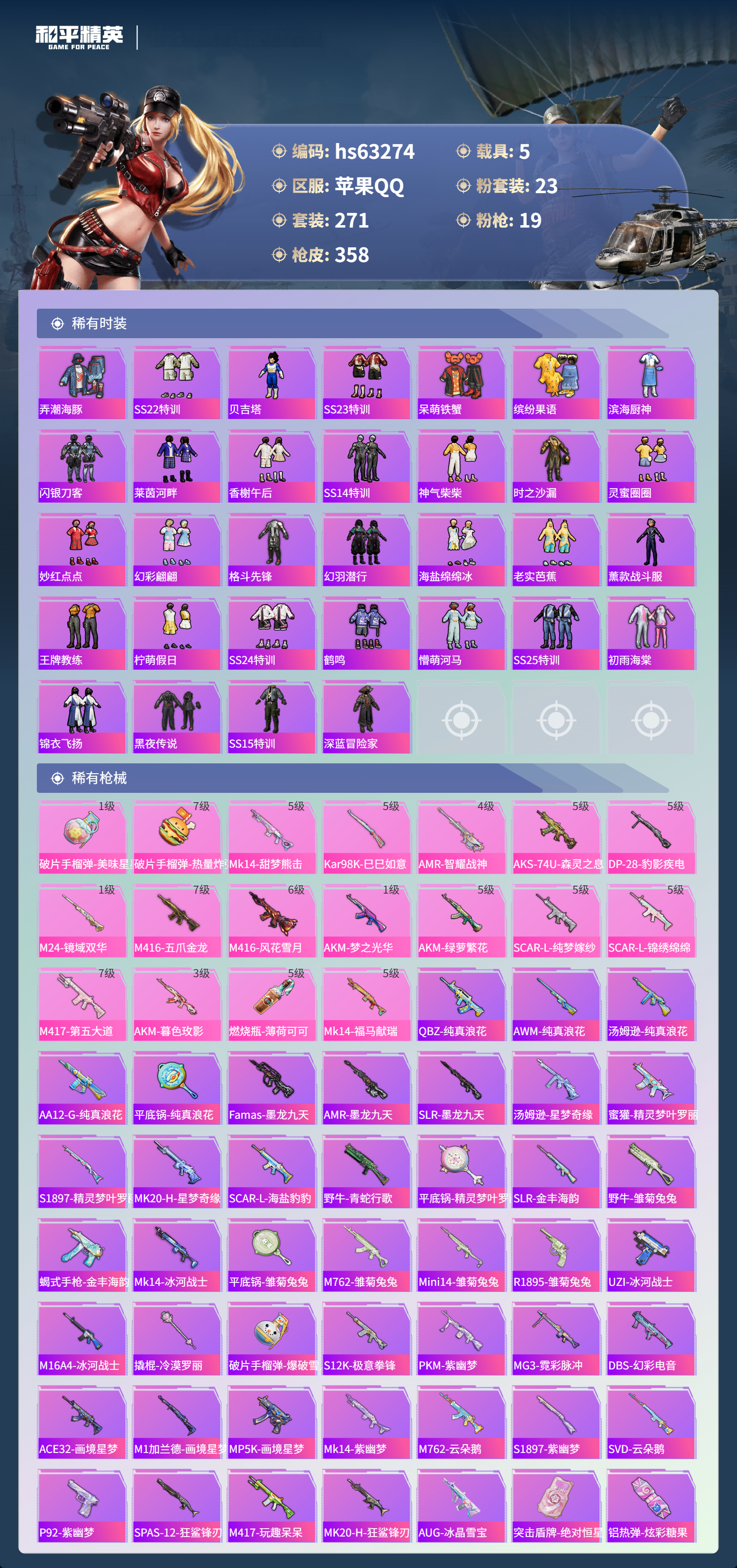 hs63274 苹果手Q-24王牌印记-有战神框-1红装-23粉装-19特效枪-5载具-热力值-271套装-358枪皮-10卓越印记-6传奇印记