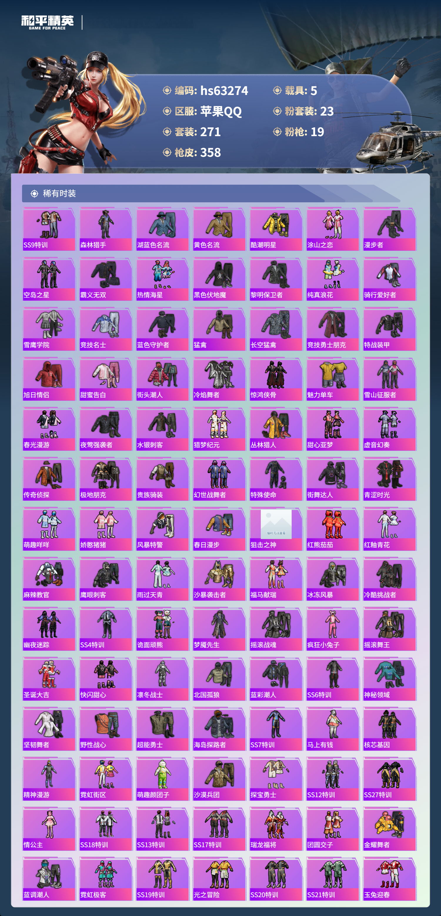 24王牌印记-有战神框-1红装-23粉装-19特效枪-5载具-热力值-271套装-358枪皮-10卓越印记-6传奇印记
