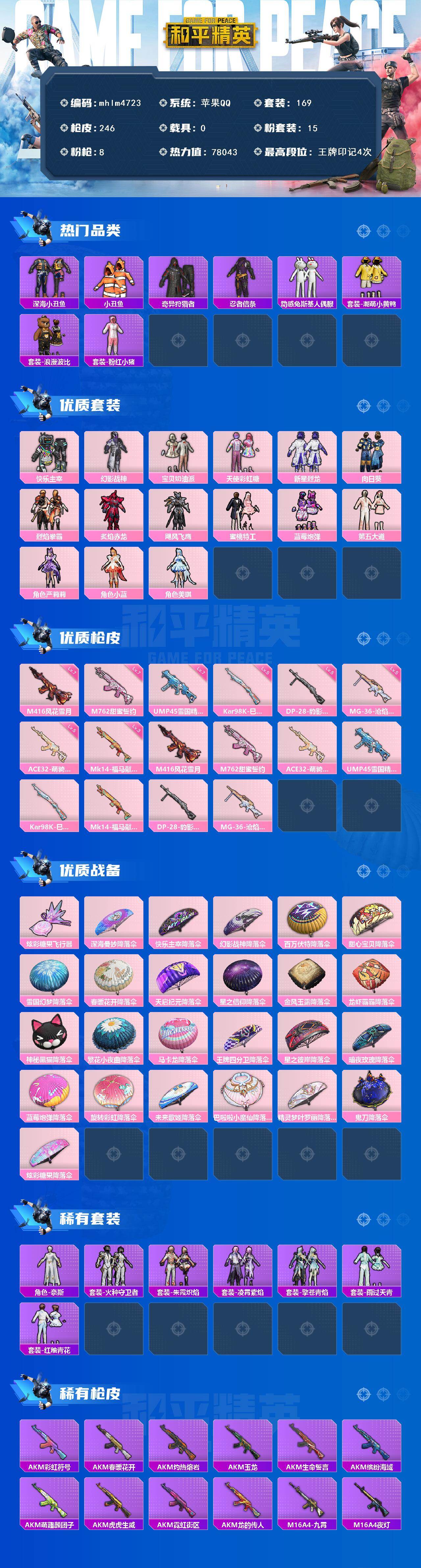 【mhlm4723】苹果 手Q-15粉装-8特效枪-0载具-1粉色飞行器-78043热力值-4王牌印记-169套装-246枪皮