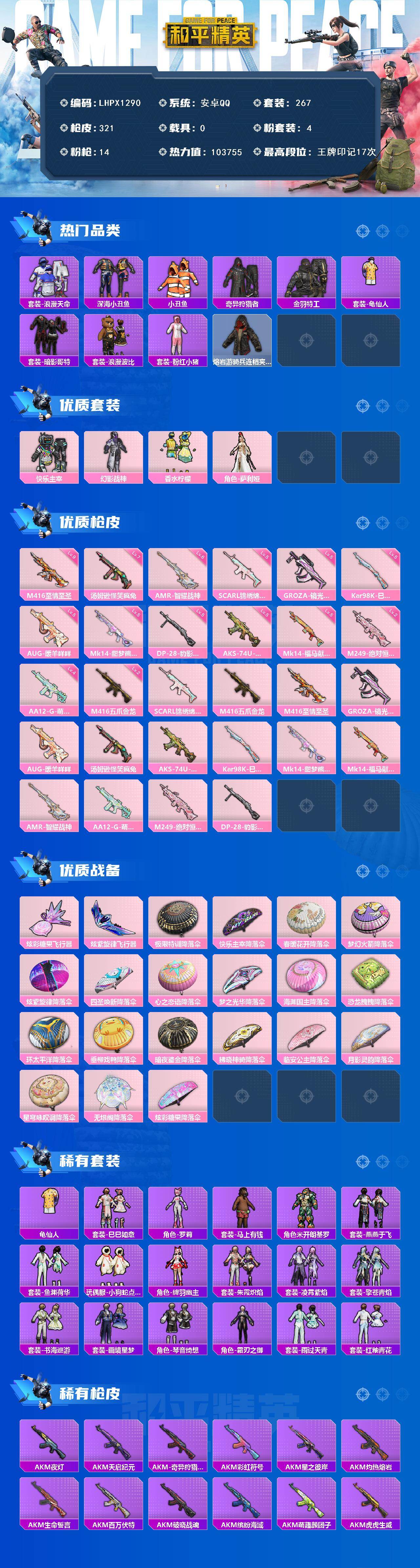 【特价出售/店主推荐】安卓 手Q-4粉装-14特效枪-0载具-2粉色飞行器-103755热力值-17王牌印记-267套装-321枪皮